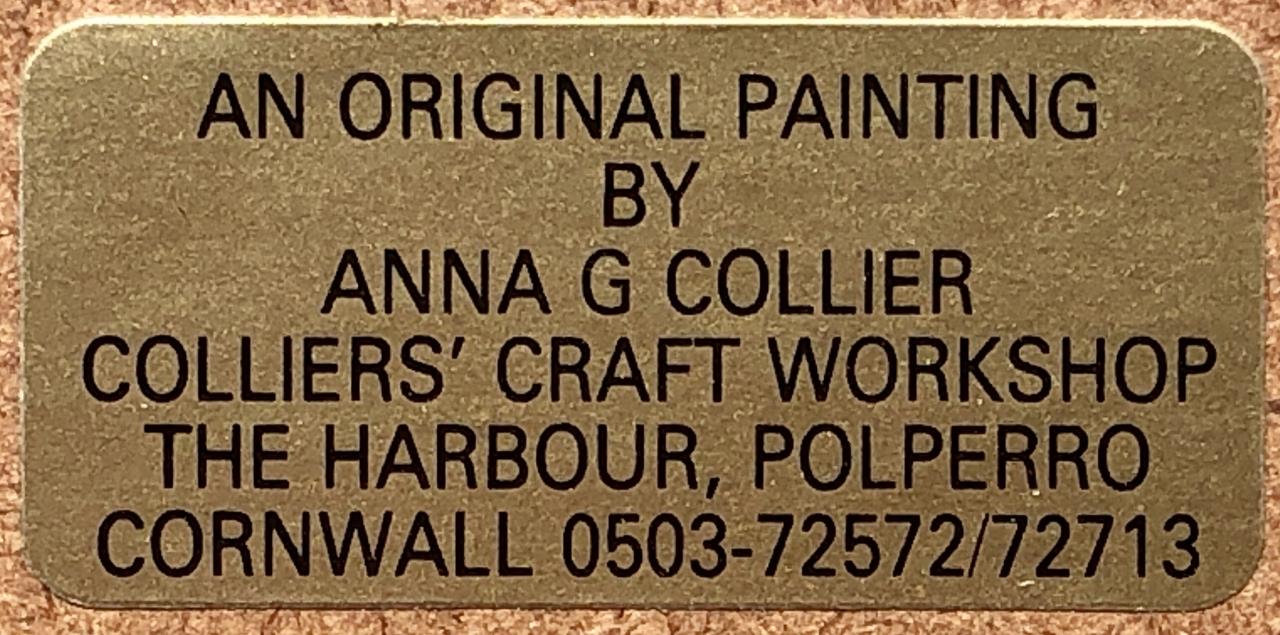 Anna G. Collier (British, active mid to late 20th Century), watercolor painting depicting a Cornish (England) harbor scene at low tide, signed lower left and identified on back with a label, in a painted wood frame measuring 26-3/4″ x 23″. CONDITION: Not examined out of frame. SHIPPING: In-House Shipping Available. Please read our Shipping Policies and Terms and Conditions