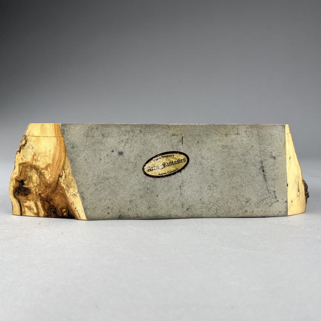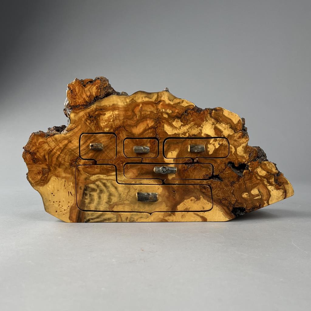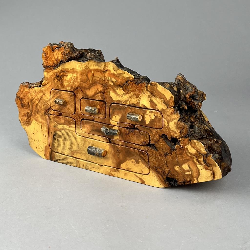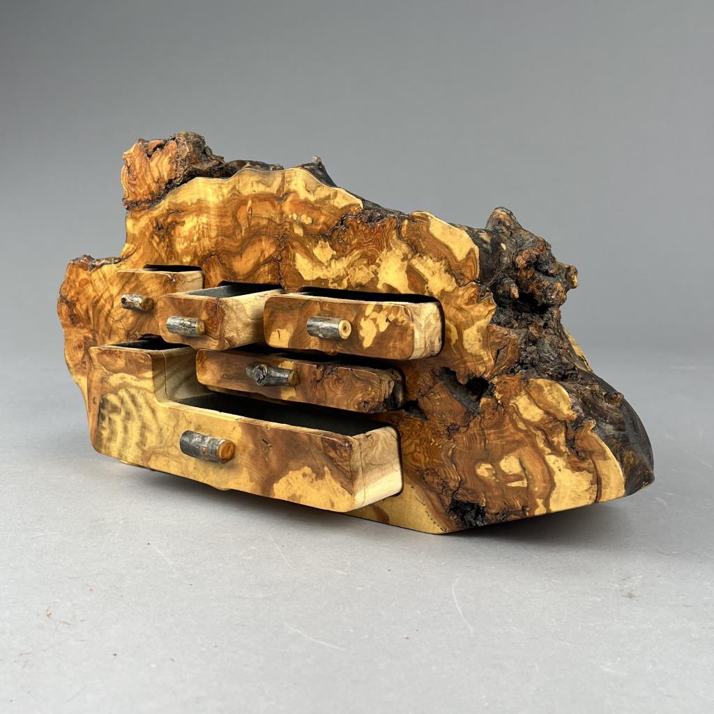 John Koch (Rifle, Colorado) handcrafted artisan live edge burlwood jewelry or trinket box, with five drawers, Aspen wood, signed on the back of bottom drawer “Aspen Burl, 7-2-88, John Koch, sold through Claire Newkam’s Attic Treasures (established in 1969 in Aspen Colorado), approximately 14″ x 3-3/4″ x 7-1/4”. CONDITION: SHIPPING: In-House Shipping Available. Please read our Shipping Policies and Terms and Conditions