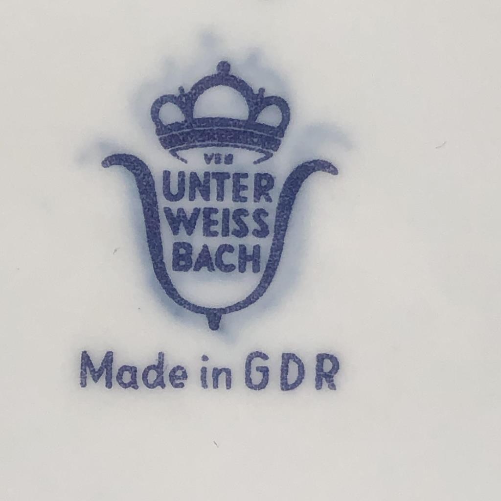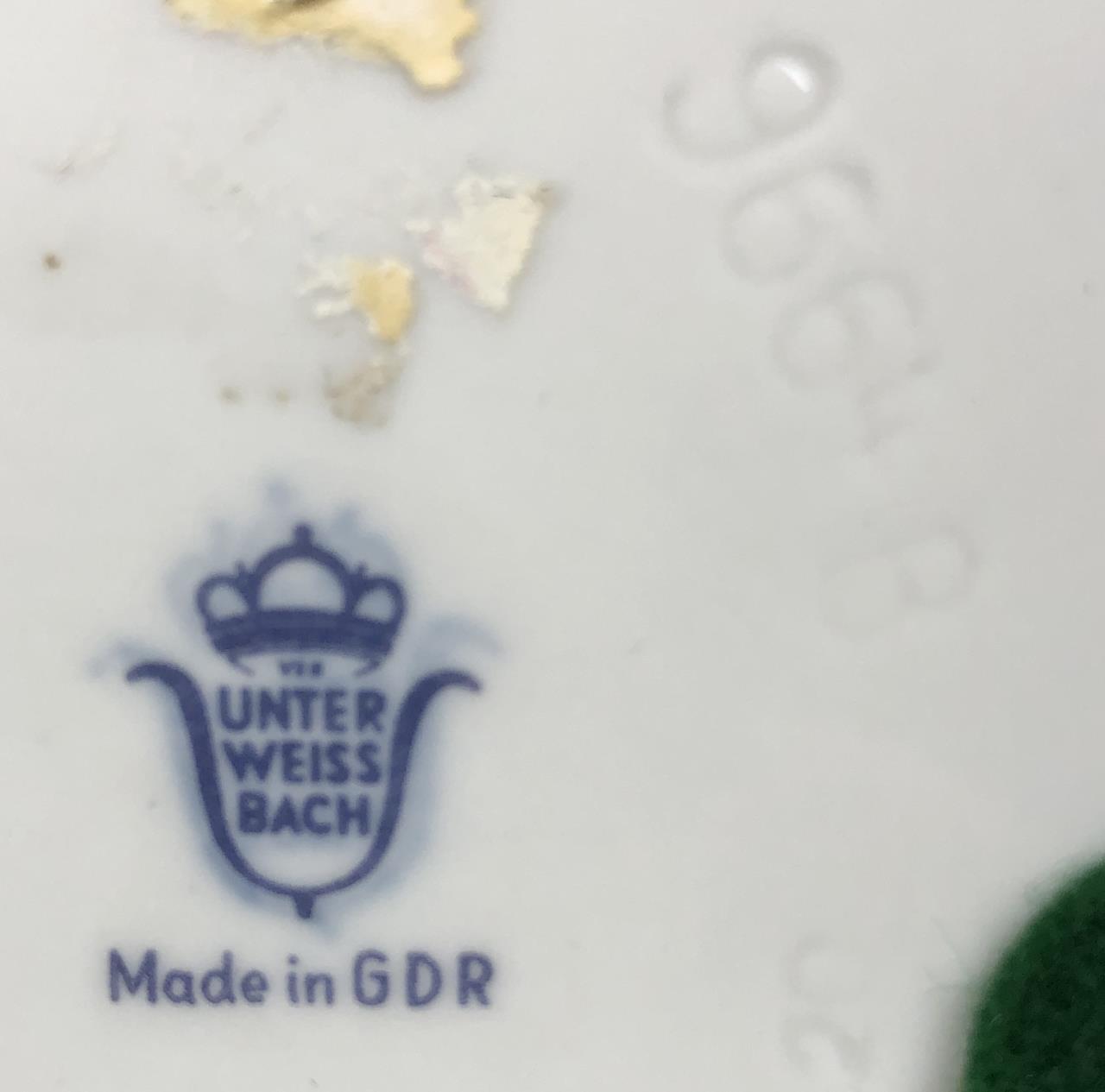 Pair of hand painted porcelain figurines, depicting a boy (model #9665A) and girl (model #9664B), both in fancy 18th century style costumes and both on attached circular gilt porcelain bases, made by “The Porzellanfabrik Unterweissbach” (Germany), circa 1958 – 1976, each approximately 6-1/4″ in height. CONDITION: SHIPPING: In-House Shipping Available. Please read our Shipping Policies and Terms and Conditions
