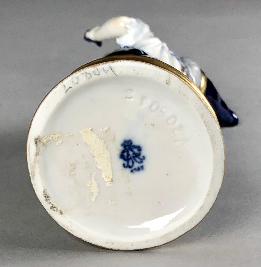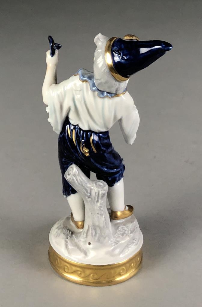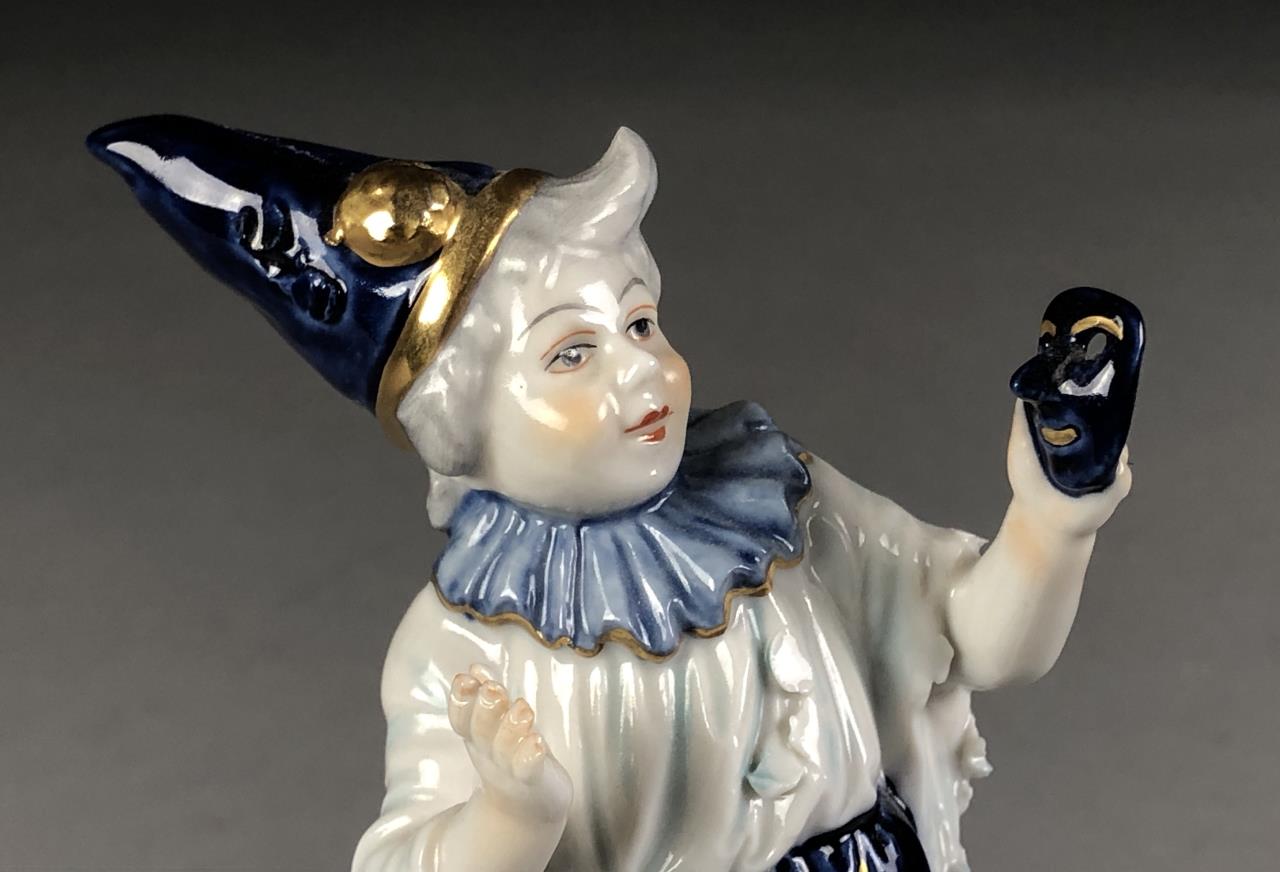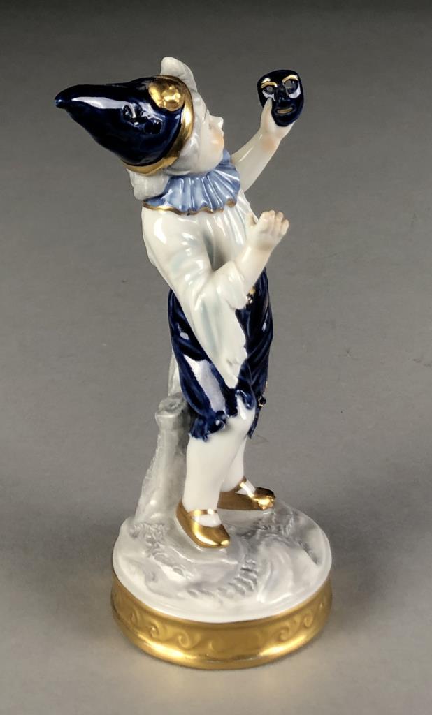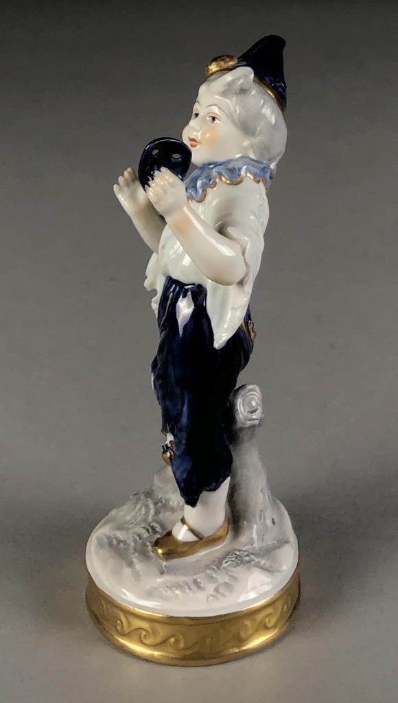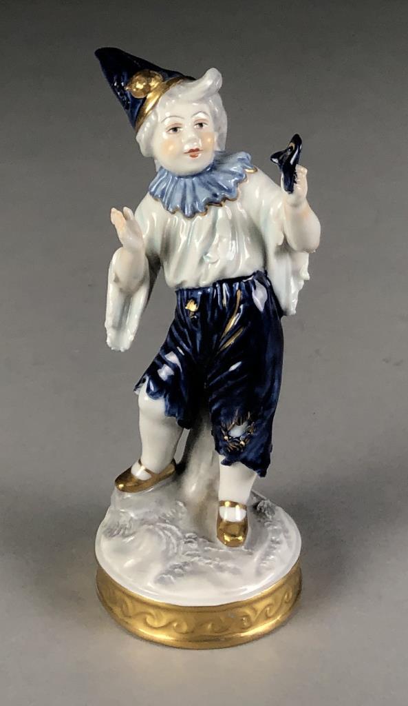 Hand painted porcelain figure, depicting a boy wearing a pierrot costume and holding a theatre mask, by the Aelteste Volkstedter Porzellanfabrik, circa mid 20th Century, marked on bottom with the blue under glaze Volkstedter crown mark, approximately 5-1/2″ in height. CONDITION: SHIPPING: In-House Shipping Available. Please read our Shipping Policies and Terms and Conditions