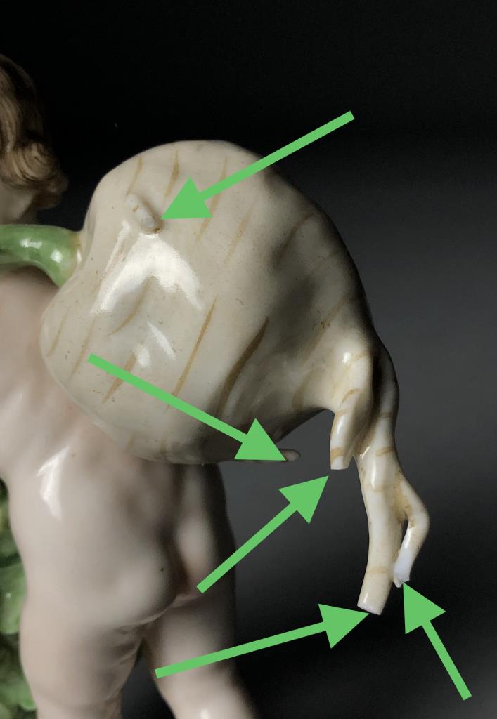 Hand painted porcelain figurine of a putto carrying a turnip, possibly representing Autumn in a four seasons collection, indecipherable marks on bottom, approximately 5-1/3″ in height. CONDITION: Tips of roots have been broken off and are missing, there is also a chip to the edge of one of the leaves. SHIPPING: In-House Shipping Available. Please read our Shipping Policies and Terms and Conditions