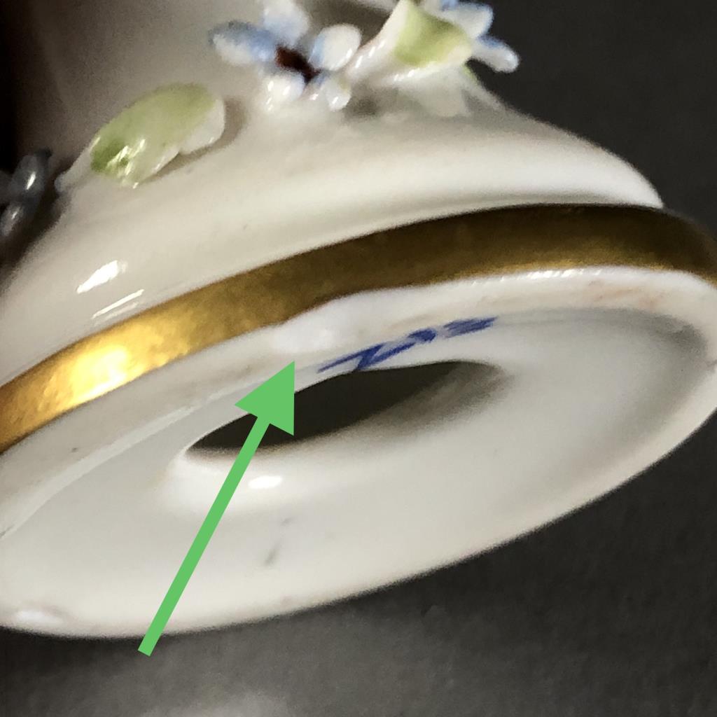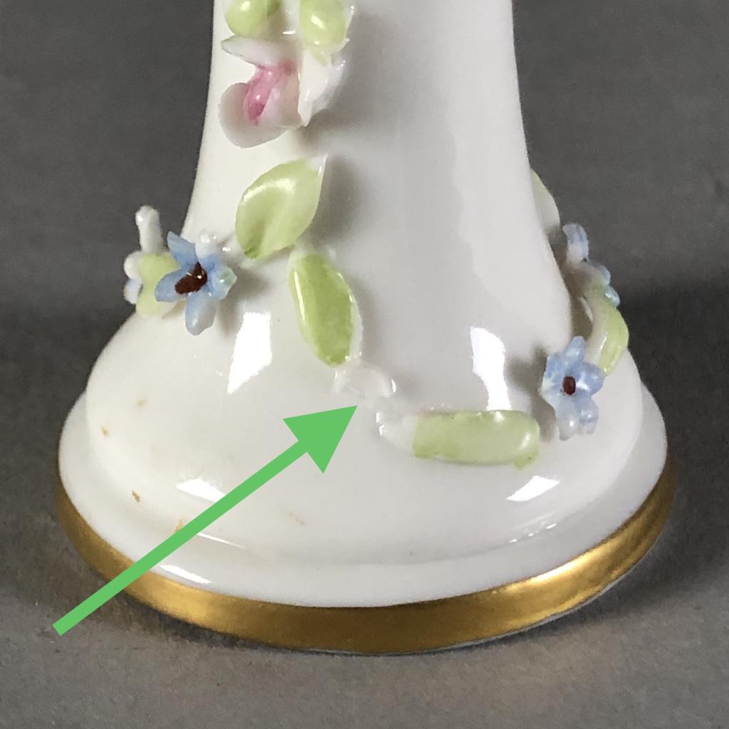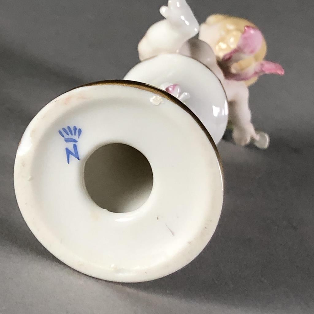 Capodimonte cherub, or putto, figure with floral garland on a pedestal, marked on bottom, approximately 4-3/8″ in height. CONDITION: Damage to floral garland on backside of pedestal, chip on bottom edge of base, see last two photos. SHIPPING: In-House Shipping Available. Please read our Shipping Policies and Terms and Conditions