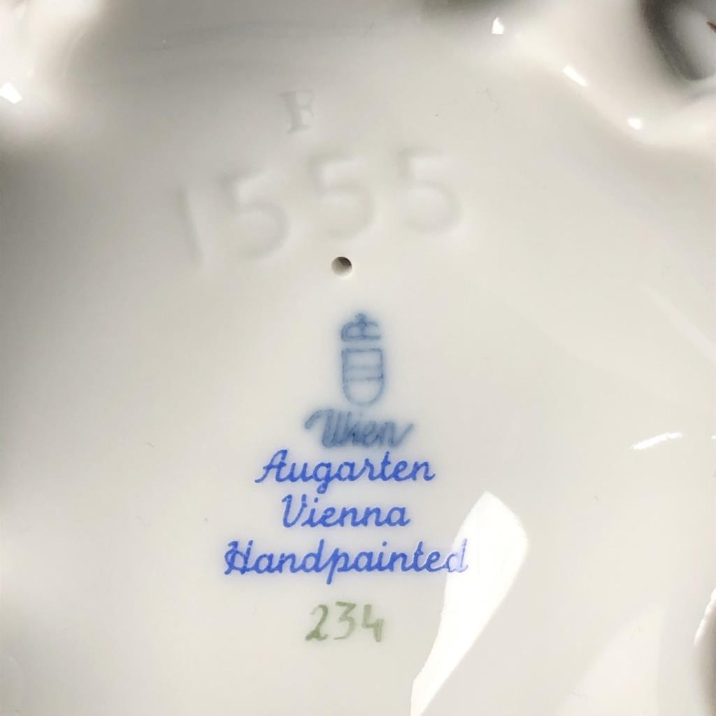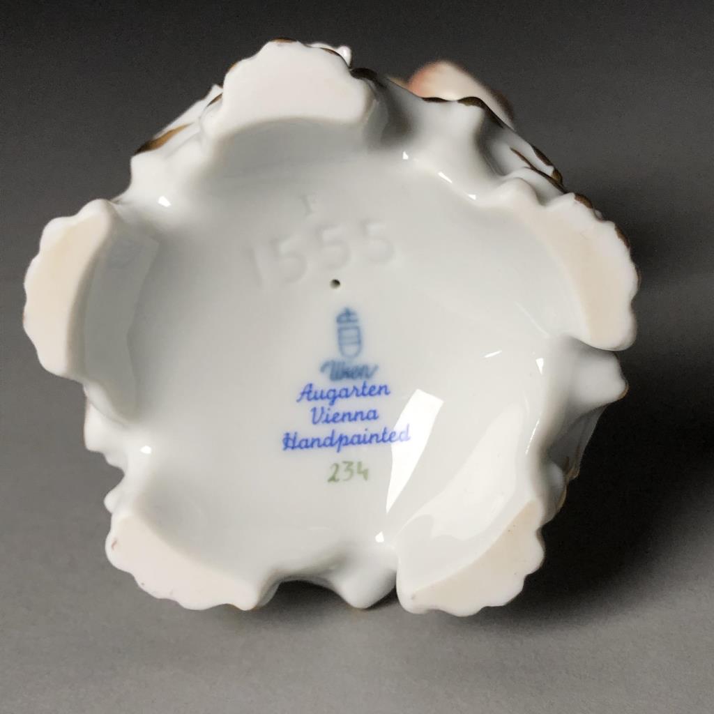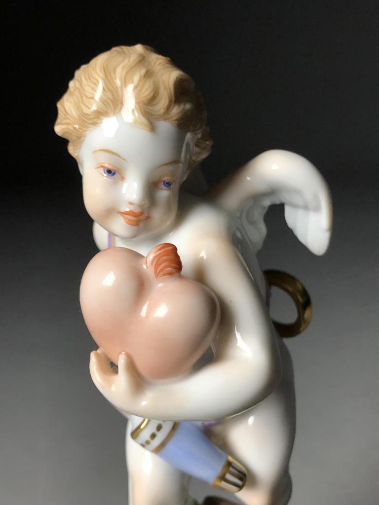 Hand painted Vienna Porcelain Manufactory Augarten (also known as “Wiener Porzellanmanufaktur Augarten”) (Vienna, Austria), porcelain figurine of Cupid holding a heart in front of him and a golden wedding band behind his back, model number 1555, circa late 20th Century, marked on bottom, 6″ high. CONDITION: SHIPPING: In-House Shipping Available. Please read our Shipping Policies and Terms and Conditions