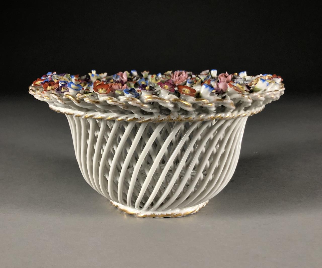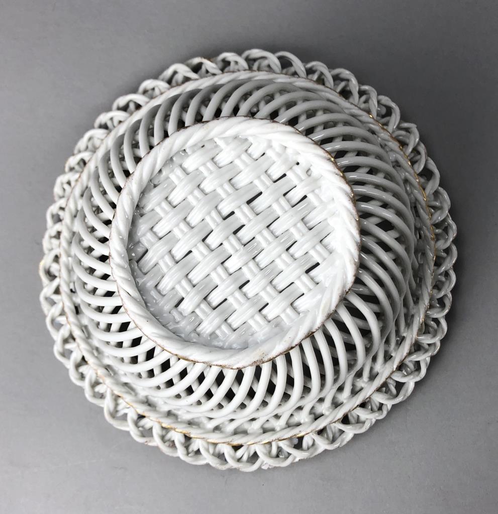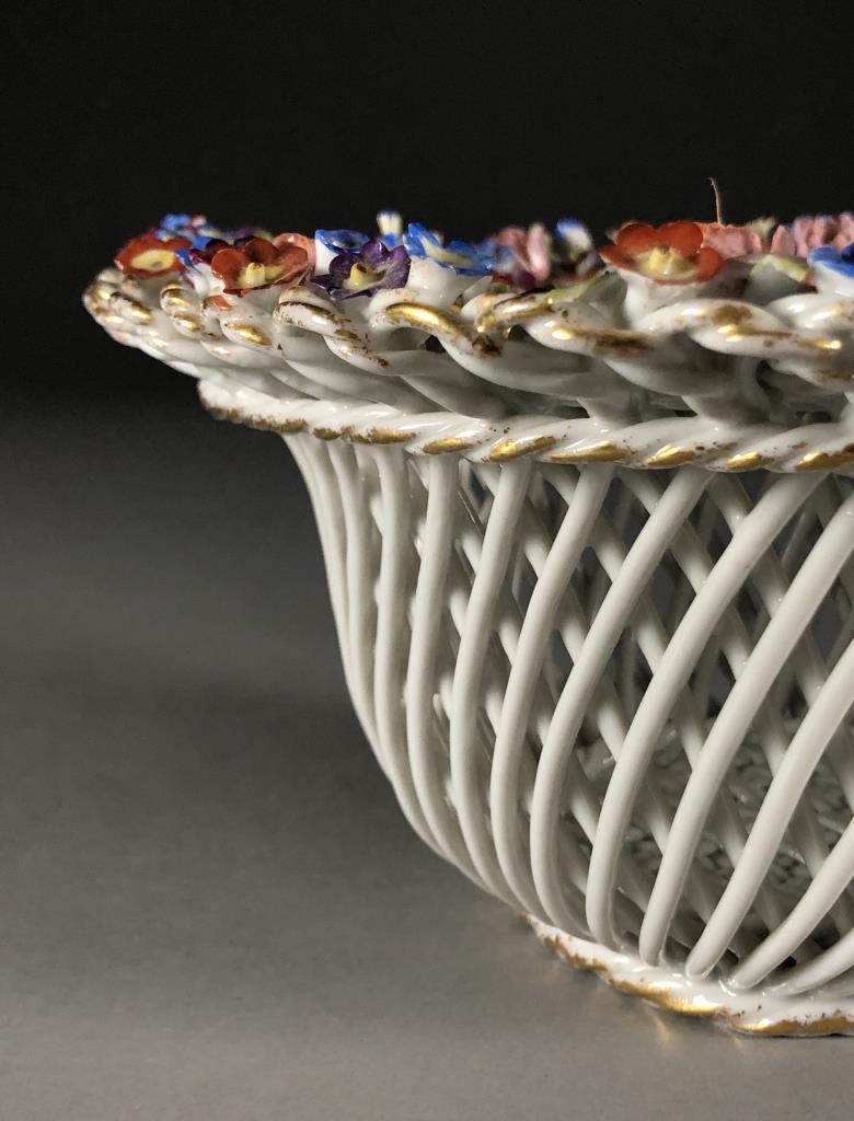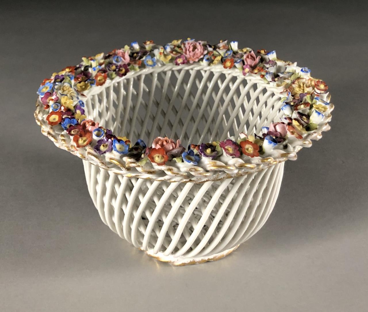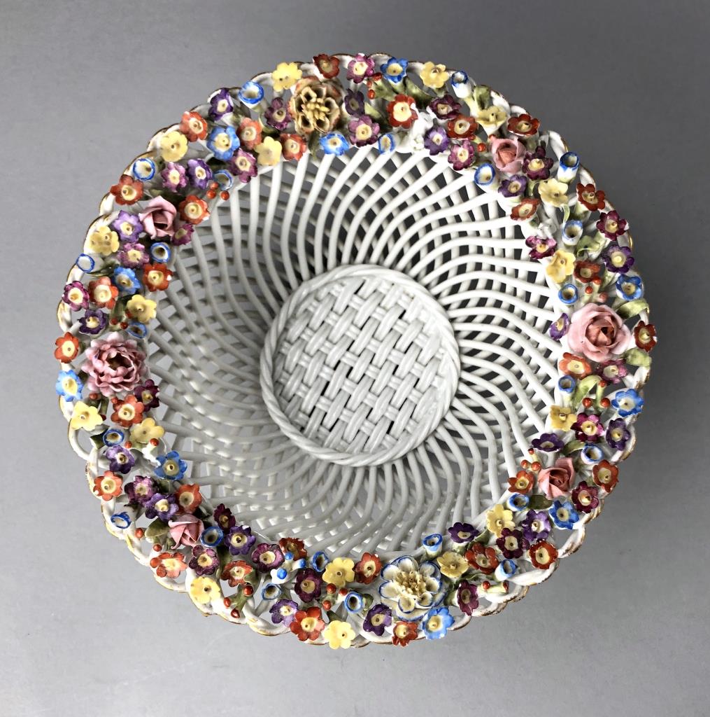 Dresden or Meissen style porcelain bowl, featuring a basket weave motif, creating a diamond reticulated design, embellished on the rim with applied floral decoration, and gilt accents on both the rim and the base, circa mid 20th Century, approximately 8″ in diameter and 4-1/8″ in height. CONDITION: Some minor damage and loss to the applied floral decoration on the rim. SHIPPING: In-House Shipping Available. Please read our Shipping Policies and Terms and Conditions