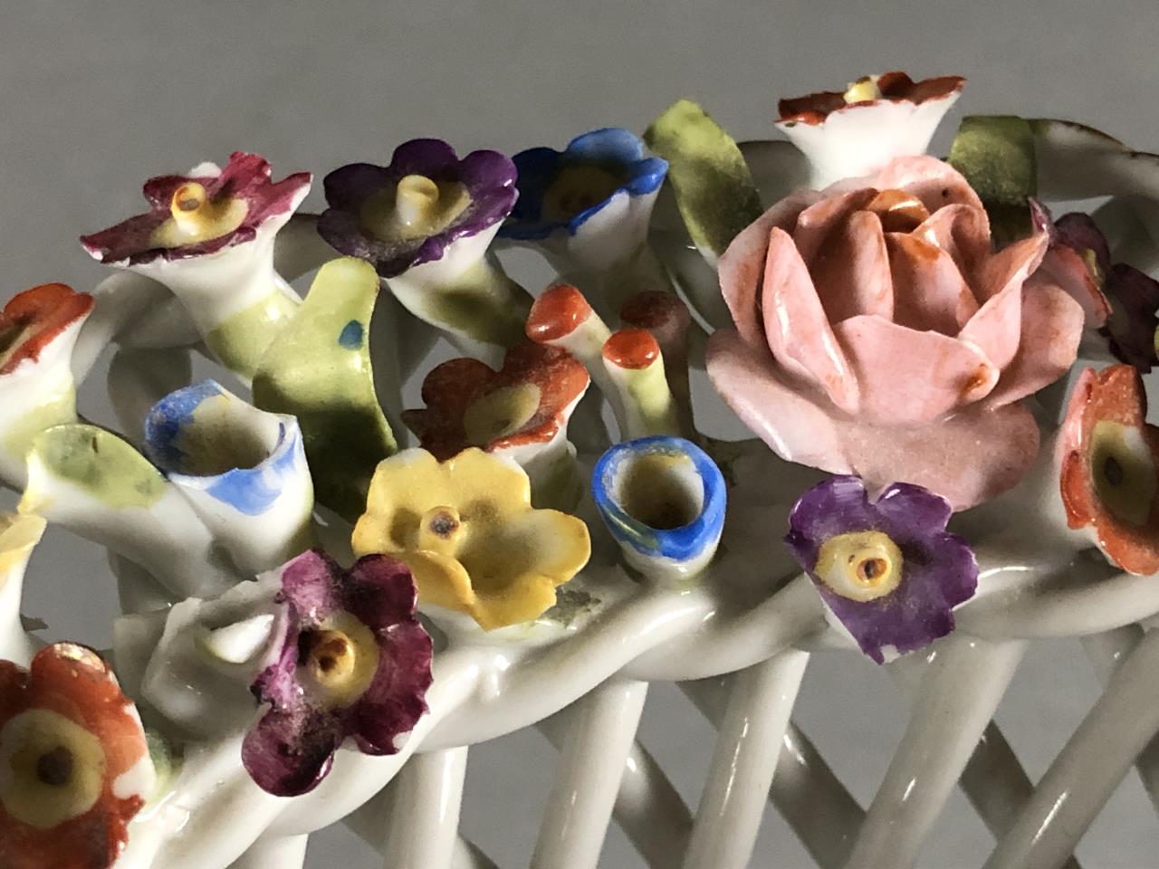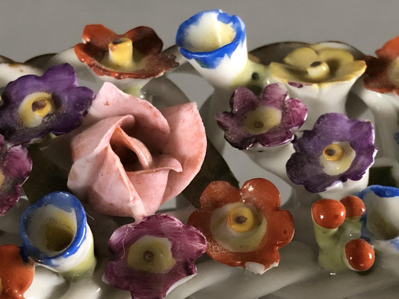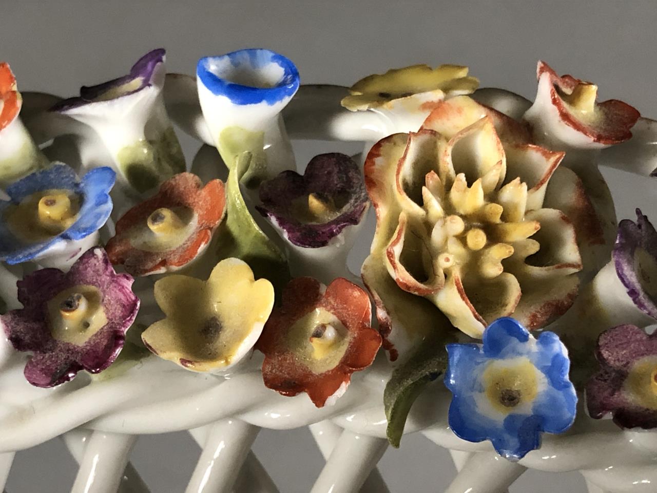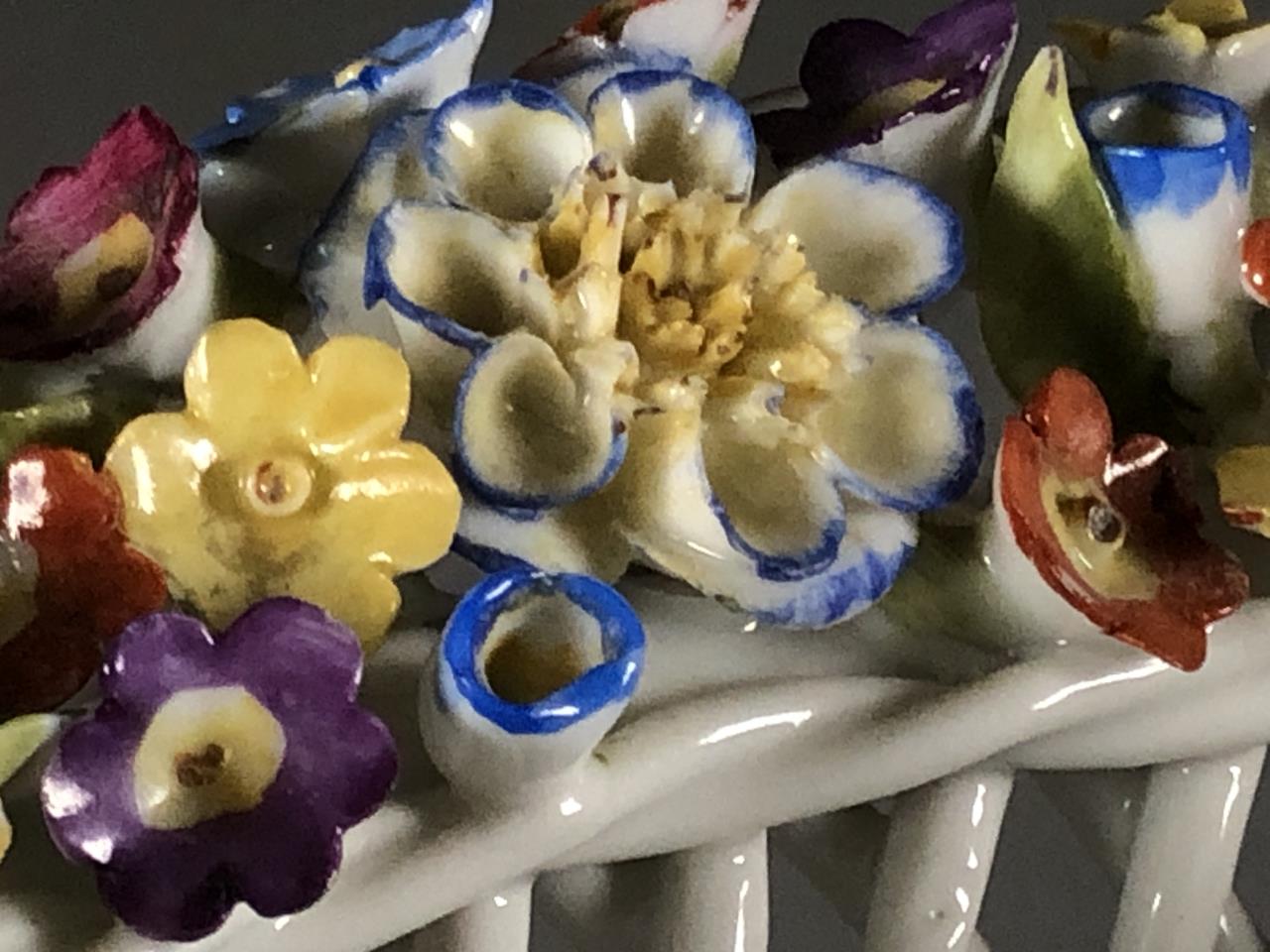 Dresden or Meissen style porcelain bowl, featuring a basket weave motif, creating a diamond reticulated design, embellished on the rim with applied floral decoration, and gilt accents on both the rim and the base, circa mid 20th Century, approximately 8″ in diameter and 4-1/8″ in height. CONDITION: Some minor damage and loss to the applied floral decoration on the rim. SHIPPING: In-House Shipping Available. Please read our Shipping Policies and Terms and Conditions