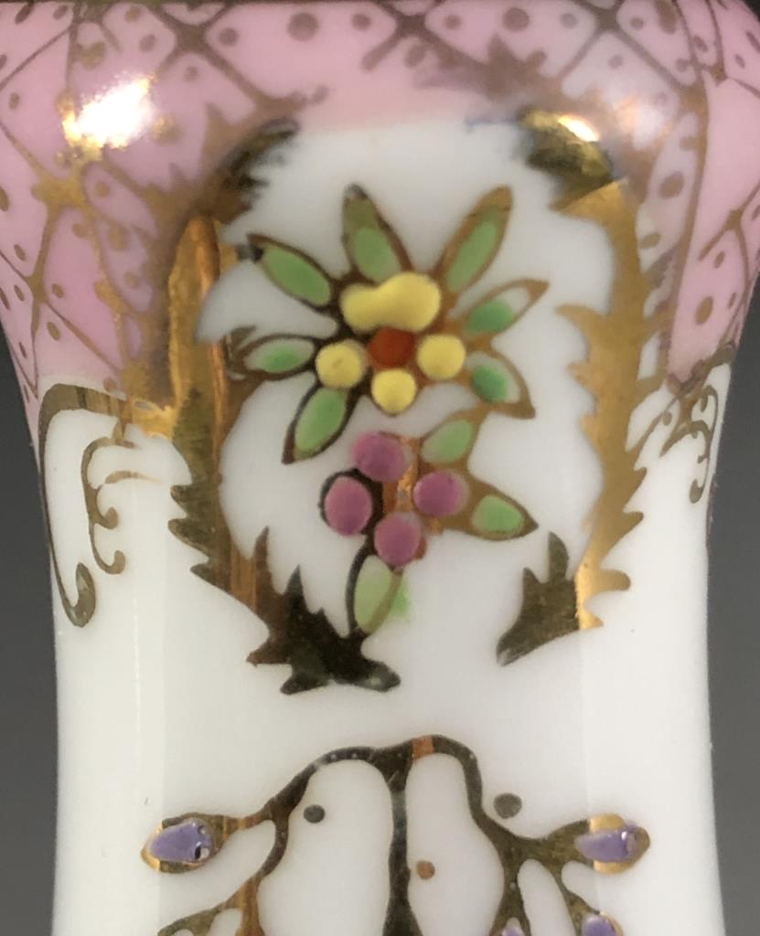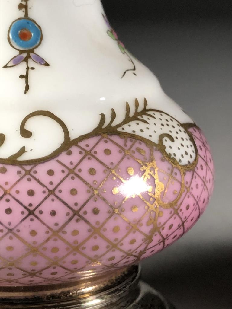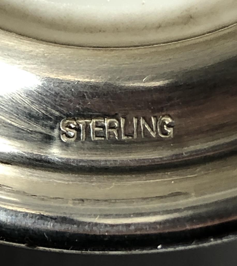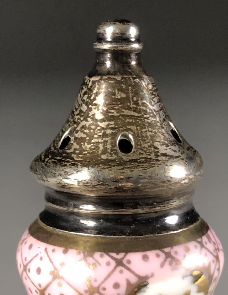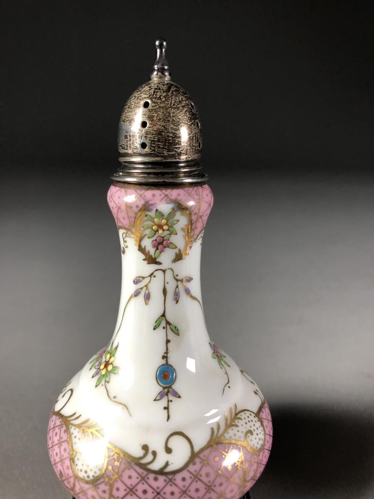 Hand painted porcelain and sterling silver salt and pepper shakers, unmarked but attributed to A & E Lewis in the “Floraine” pattern, mid to late 20th Century, each approximately 5″ in height. CONDITION: SHIPPING: In-House Shipping Available. Please read our Shipping Policies and Terms and Conditions