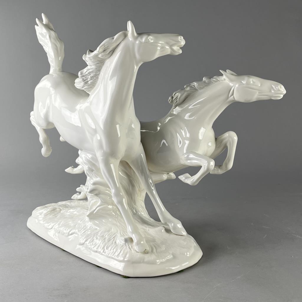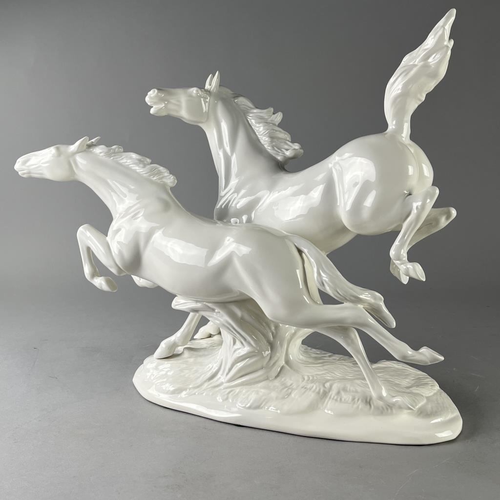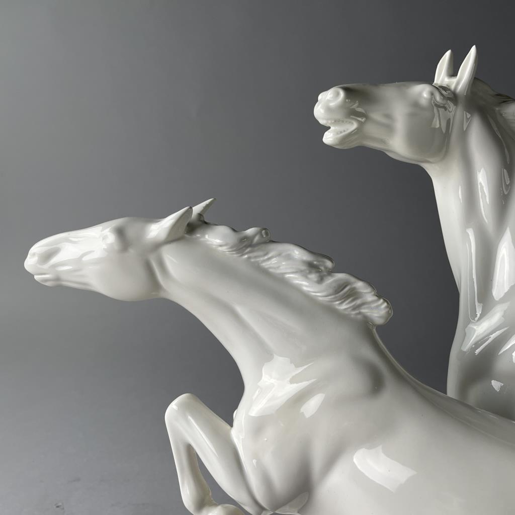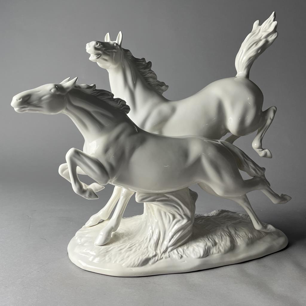 Ceramica de Cuernavaca (Mexico), white glazed porcelain statue of two horses in motion, circa mid 20th Century, marked on underside, approximately (L) 8″ x (W) 19-1/2″ x (H) 16-1/2″. CONDITION: Chip on the tip of one hoof, please see last photo. SHIPPING: Local pick-up or third party shipping only for this lot. Please see the Shipping Policy for information on suggested shippers. We recommend the Pak Mail Store of Battle Creek to assist you. Please contact the shipper of your choice for shipping estimates on this lot. Refer to the Shipping section in our full Terms and Conditions for all information on shipping.