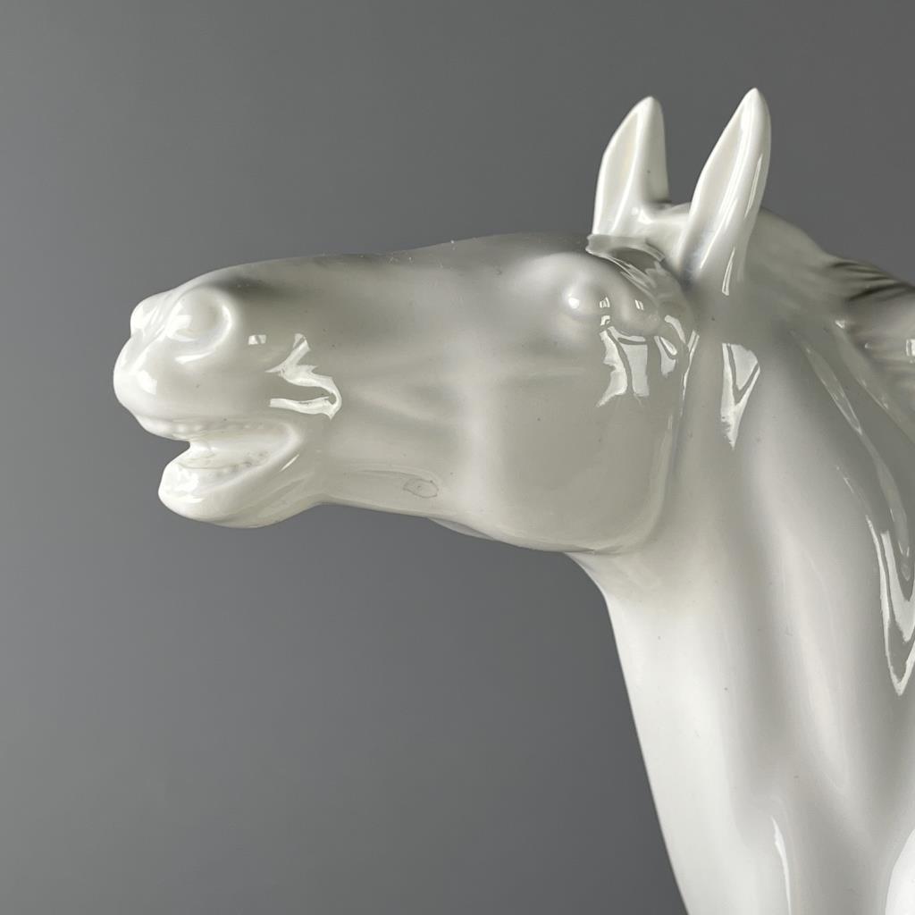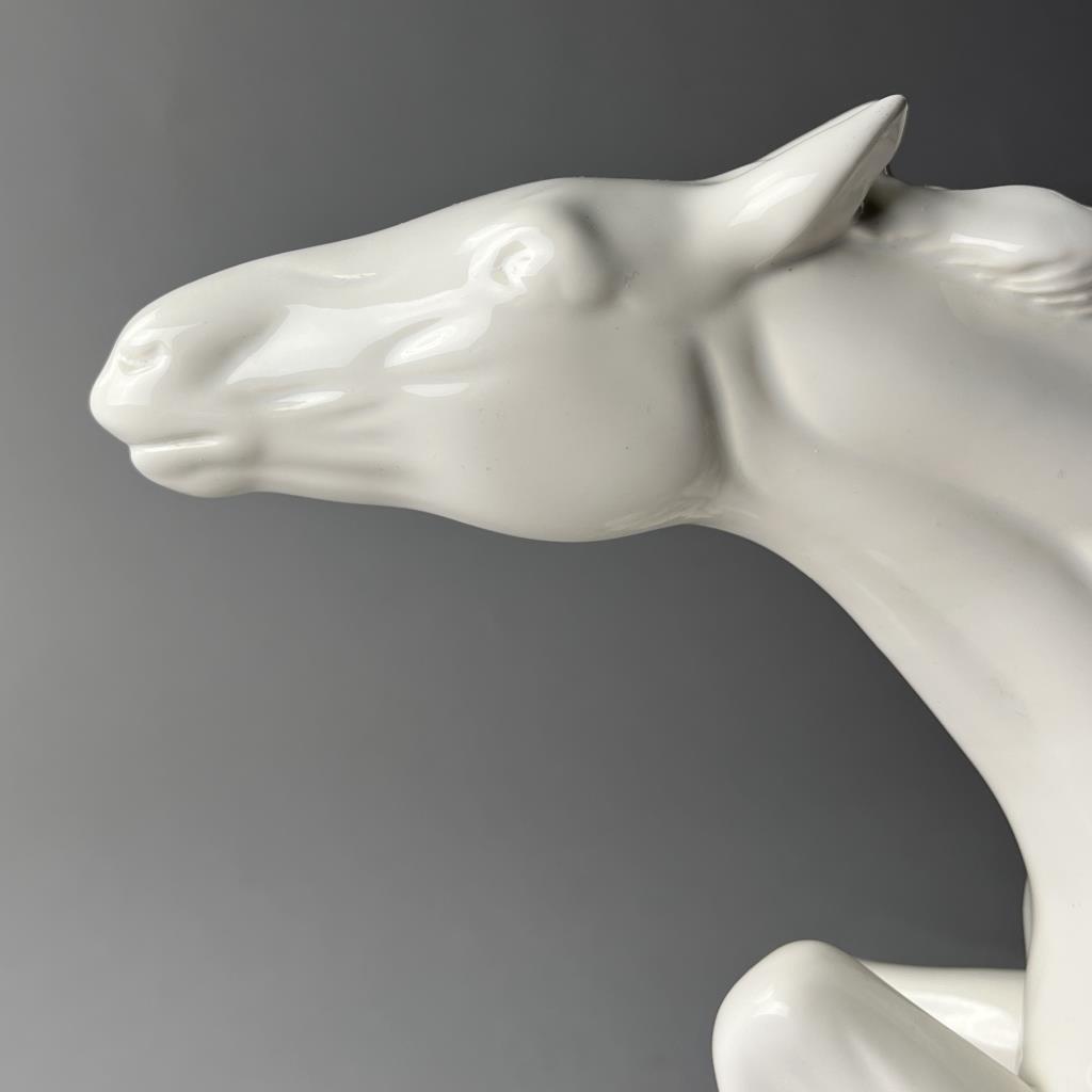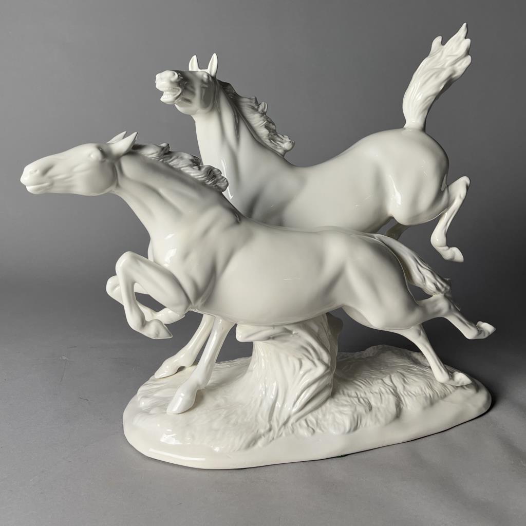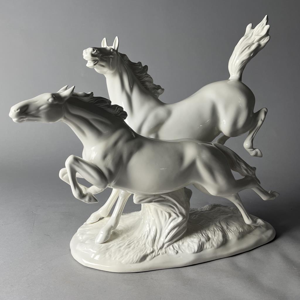 Ceramica de Cuernavaca (Mexico), white glazed porcelain statue of two horses in motion, circa mid 20th Century, marked on underside, approximately (L) 8″ x (W) 19-1/2″ x (H) 16-1/2″. CONDITION: Chip on the tip of one hoof, please see last photo. SHIPPING: Local pick-up or third party shipping only for this lot. Please see the Shipping Policy for information on suggested shippers. We recommend the Pak Mail Store of Battle Creek to assist you. Please contact the shipper of your choice for shipping estimates on this lot. Refer to the Shipping section in our full Terms and Conditions for all information on shipping.