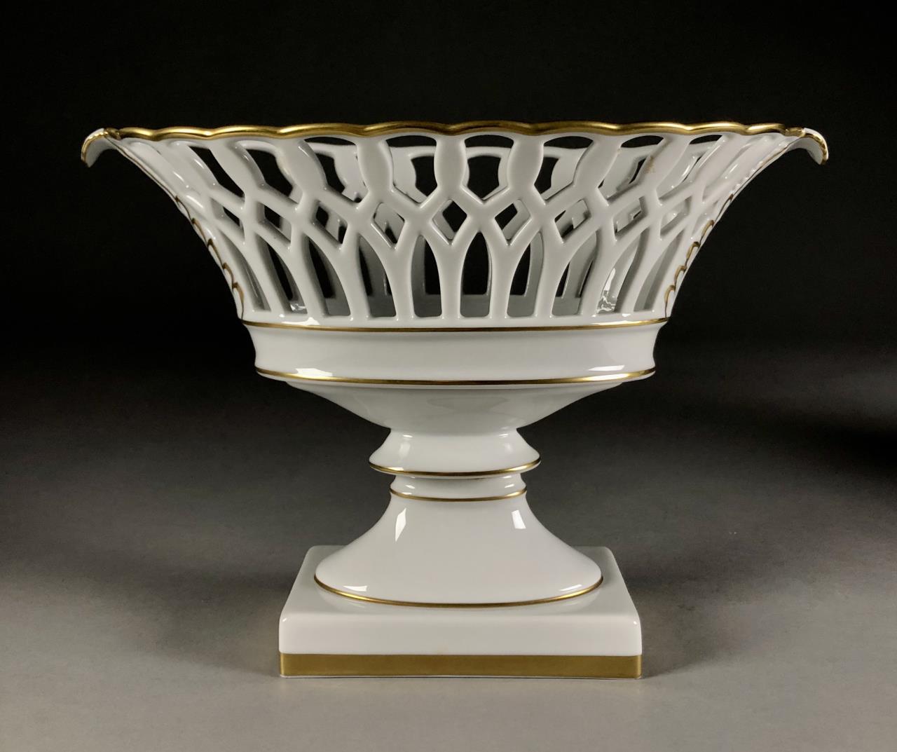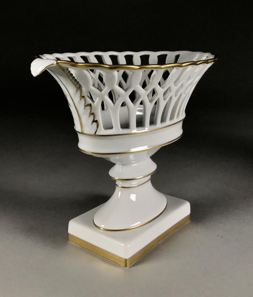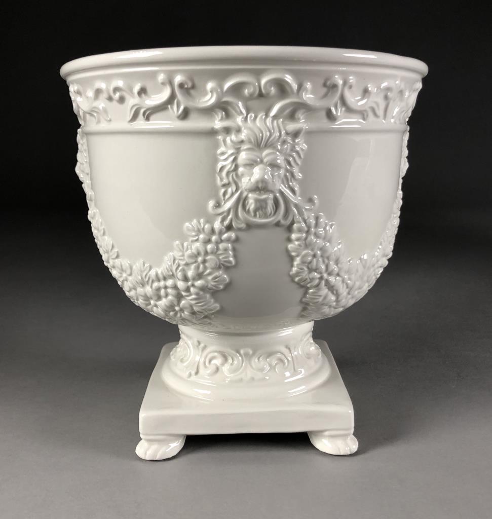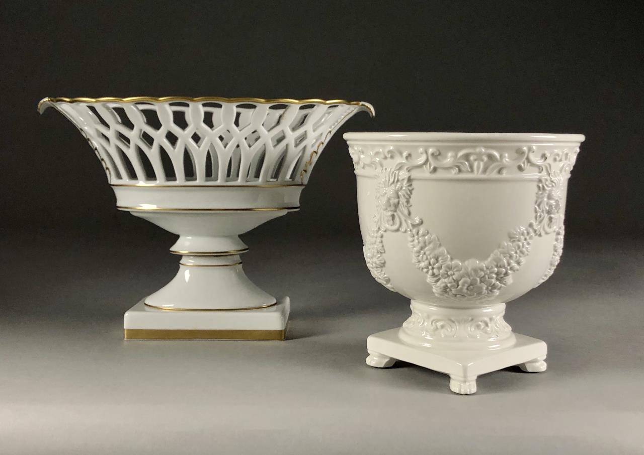 Two Mottahedeh white ceramic copies of museum pieces, both marked on underside, one is an oval porcelain reticulated compote centerpiece made by Vista Allegra (Portugal) (12-1/2″ x 6-1/2″ x 8-5/8″) and the other is a round pottery jardiniere with relief decoration of garlands and lion heads on a footed square base (7-1/4″ x 7-1/4″). CONDITION: SHIPPING: In-House Shipping Available. Please read our Shipping Policies and Terms and Conditions