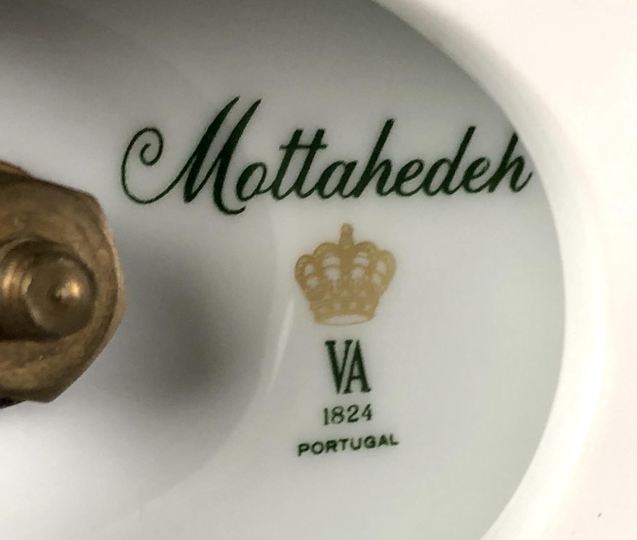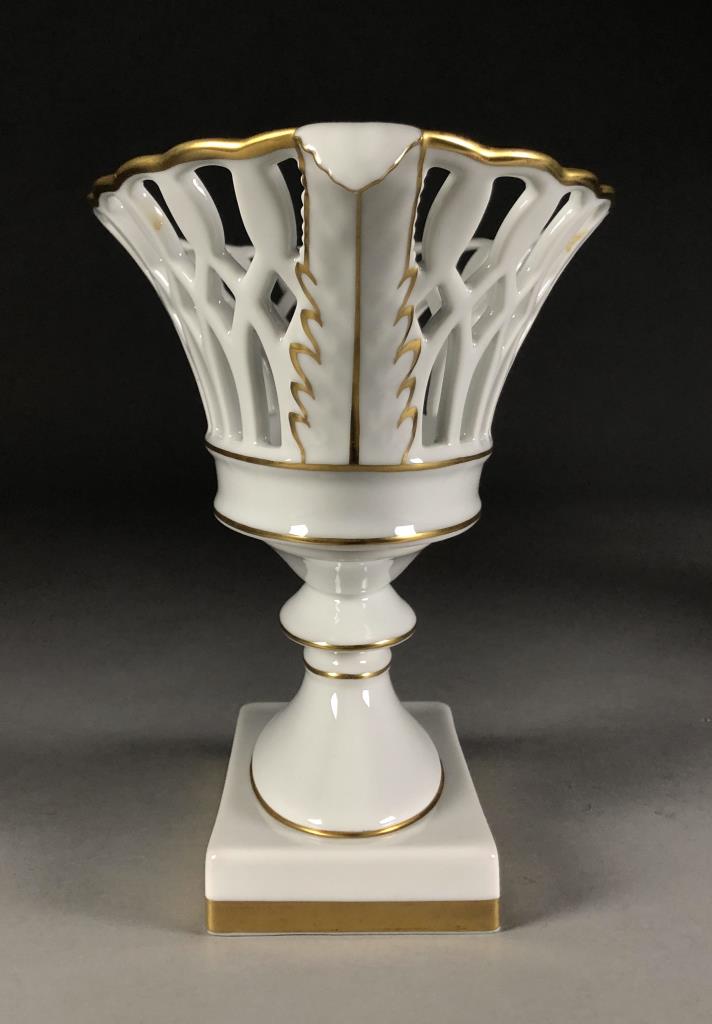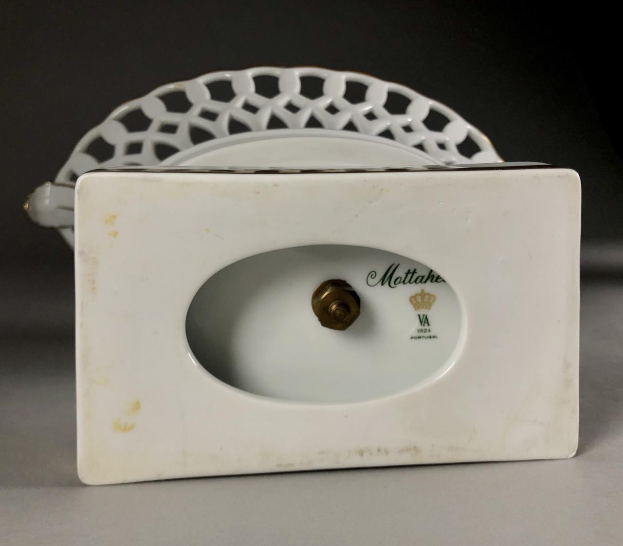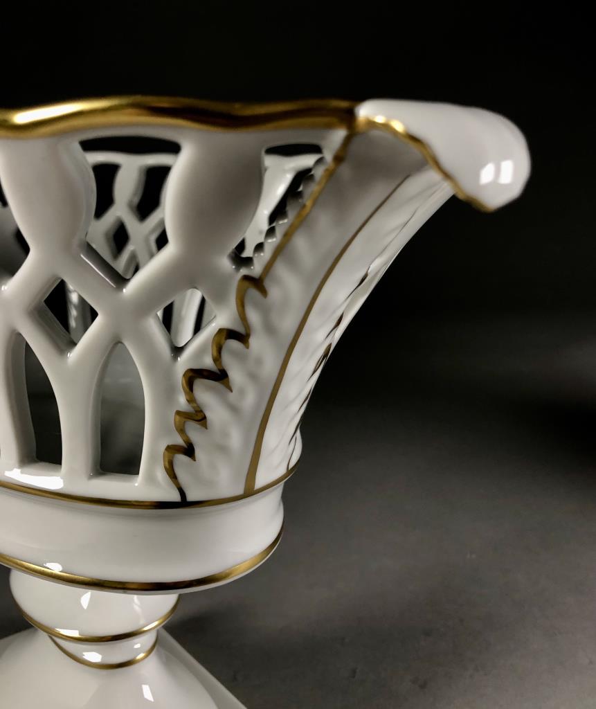Two Mottahedeh white ceramic copies of museum pieces, both marked on underside, one is an oval porcelain reticulated compote centerpiece made by Vista Allegra (Portugal) (12-1/2″ x 6-1/2″ x 8-5/8″) and the other is a round pottery jardiniere with relief decoration of garlands and lion heads on a footed square base (7-1/4″ x 7-1/4″). CONDITION: SHIPPING: In-House Shipping Available. Please read our Shipping Policies and Terms and Conditions