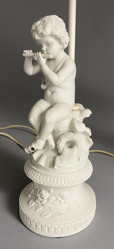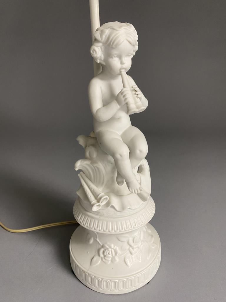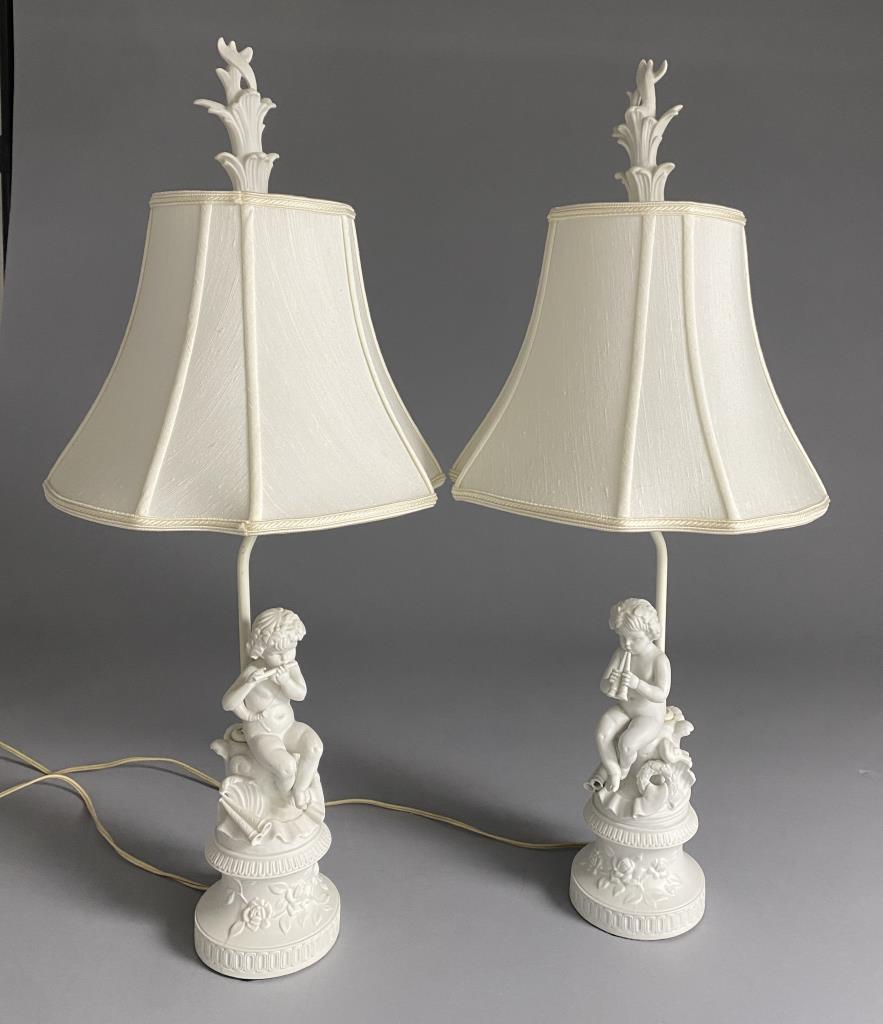Pair of Continental bisque porcelain boudoir or table lamps with Classical putti or cherubs playing flutes, circa mid 20th Century, with cut corner square bell shaped shades, each 29-3/4″ H (with finials). CONDITION: Working at time of cataloguing. Some possible staining and discoloration to shades. SHIPPING: Local pick-up or third party shipping only for this lot. Please see the Shipping Policy for information on suggested shippers. We recommend the Pak Mail Store of Battle Creek to assist you. Please contact the shipper of your choice for shipping estimates on this lot. Refer to the Shipping section in our full Terms and Conditions for all information on shipping.