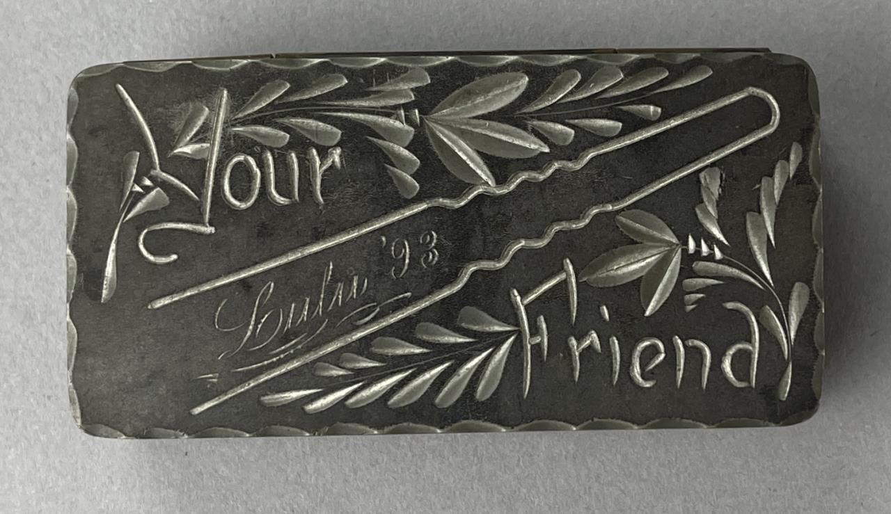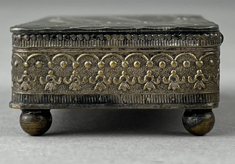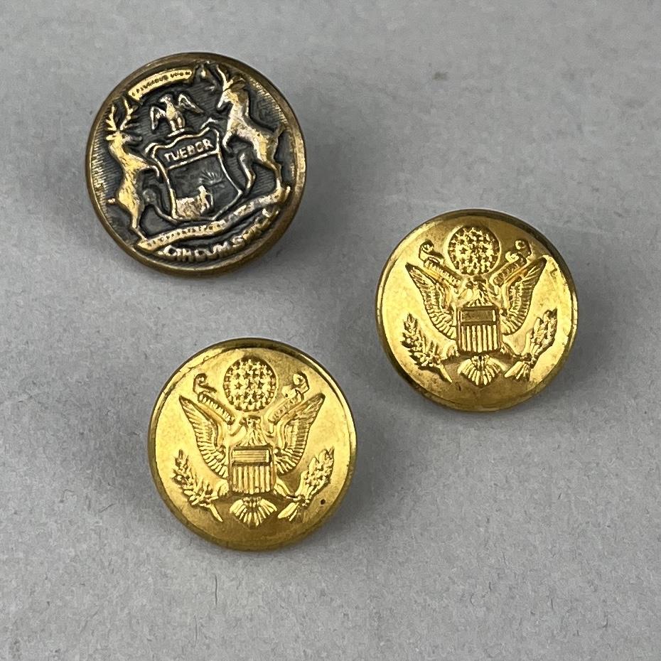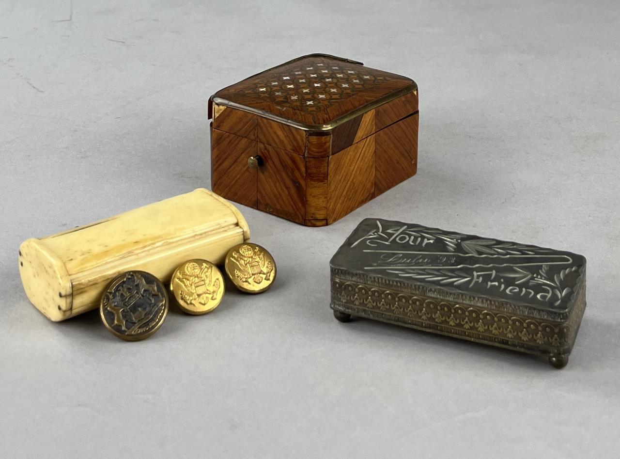 Three antique boxes, all with hinged lids, one parquetry with brass and mother of pearl inlay,, one bright cut silverplated inscribed “Your Friend Lulu ’93” including two US Army buttons and one State of Michigan button, and one bone. The largest measuring approximately 3″ x 2-1/2″ x 1-5/8″. CONDITION: Parquetry box has damage and losses at corners. The silverplated box has wear and loss to the silvered surface. SHIPPING: In-House Shipping Available. Please read our Shipping Policies and Terms and Conditions
