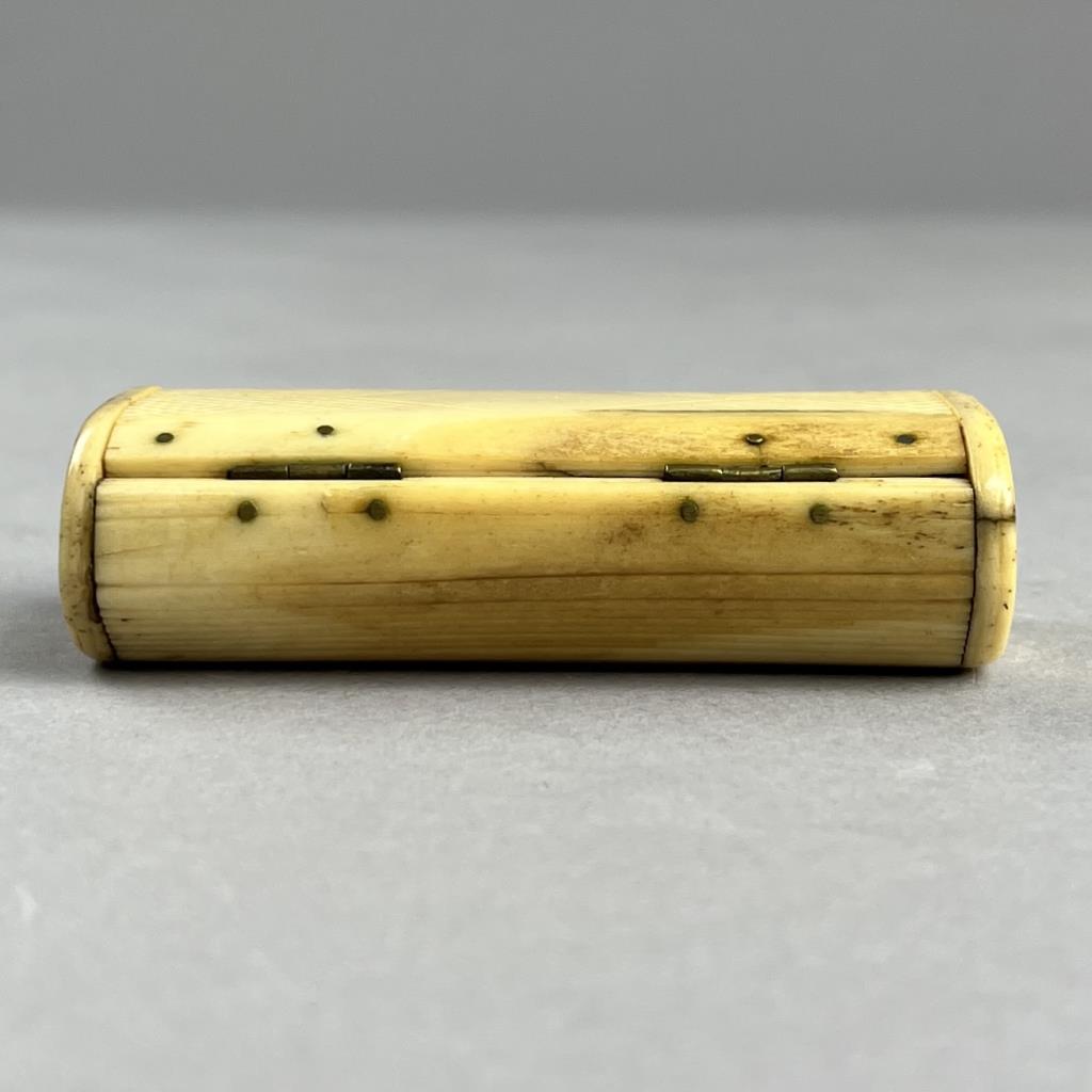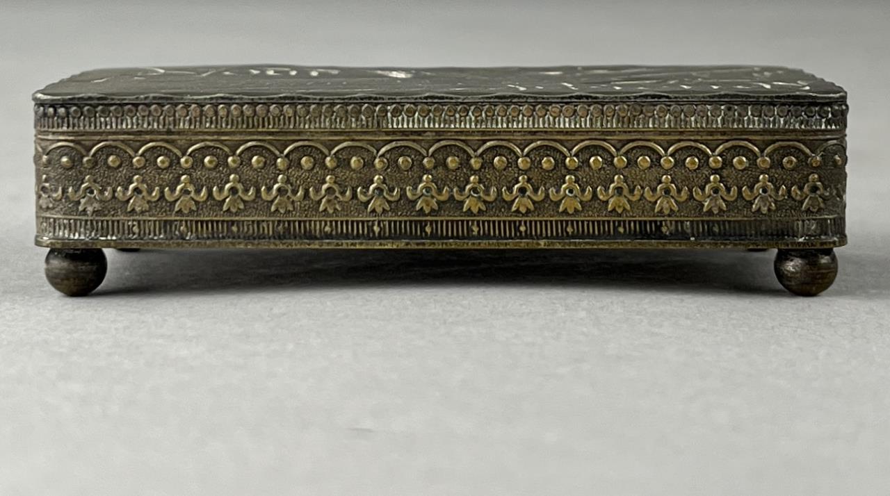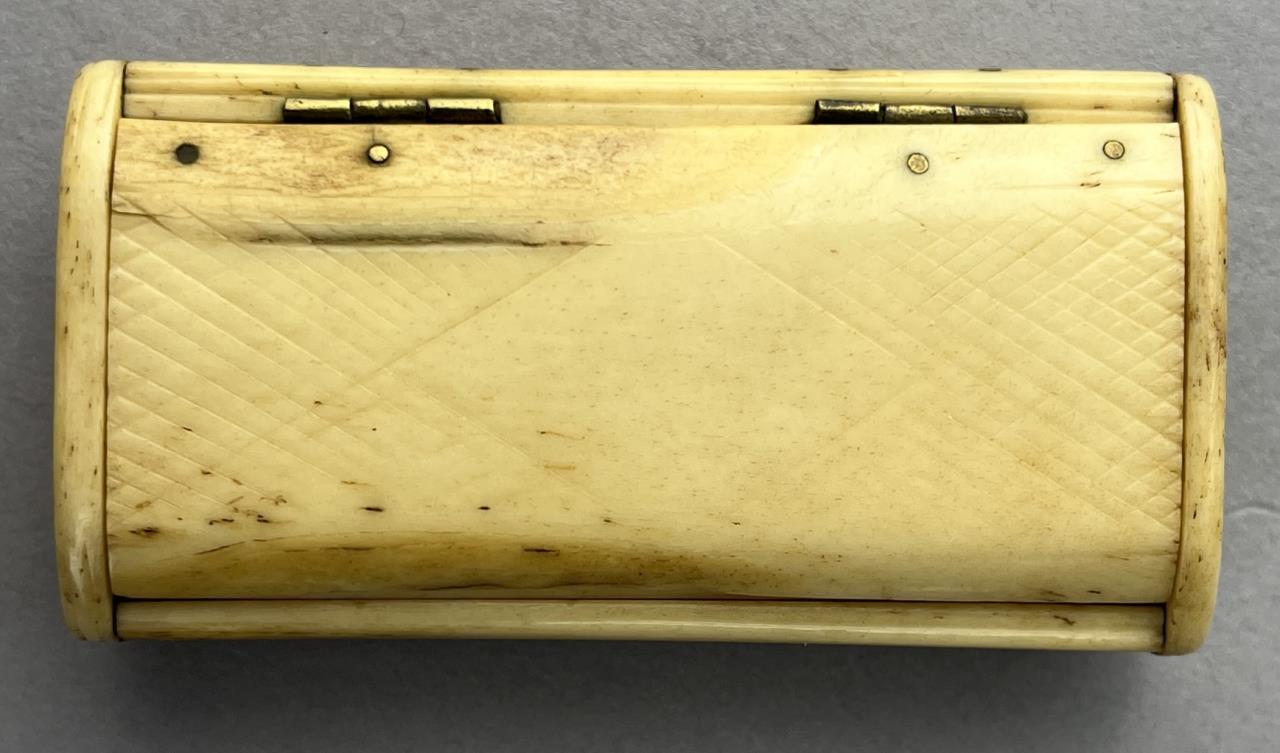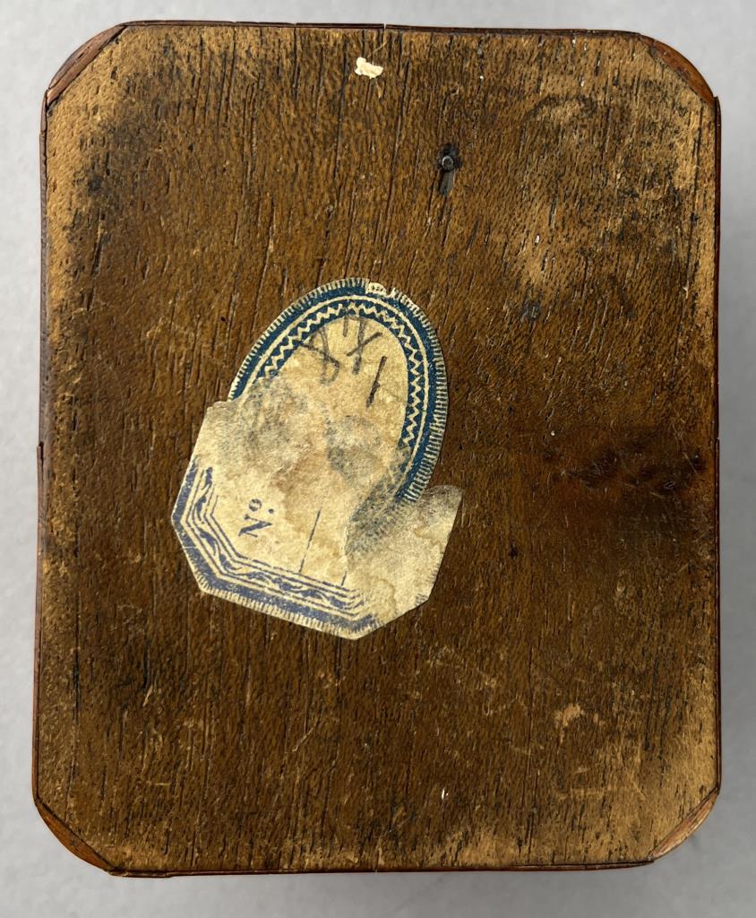 Three antique boxes, all with hinged lids, one parquetry with brass and mother of pearl inlay,, one bright cut silverplated inscribed “Your Friend Lulu ’93” including two US Army buttons and one State of Michigan button, and one bone. The largest measuring approximately 3″ x 2-1/2″ x 1-5/8″. CONDITION: Parquetry box has damage and losses at corners. The silverplated box has wear and loss to the silvered surface. SHIPPING: In-House Shipping Available. Please read our Shipping Policies and Terms and Conditions