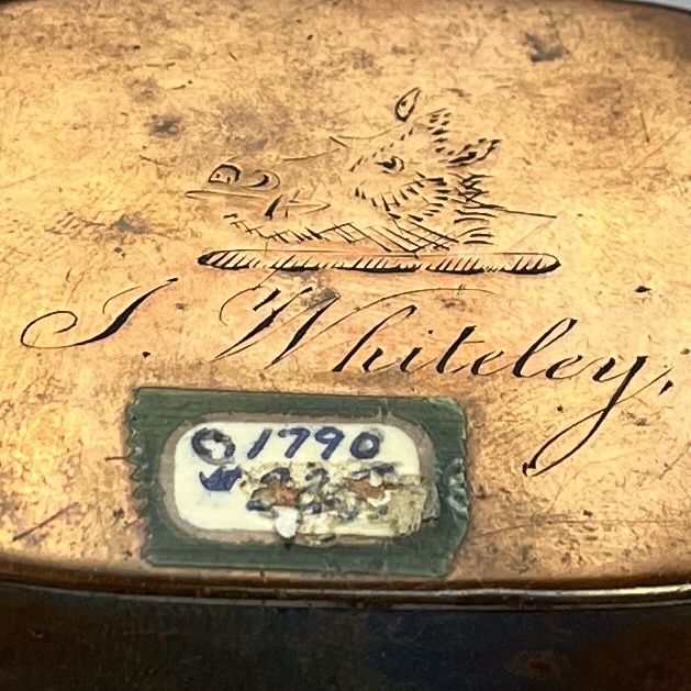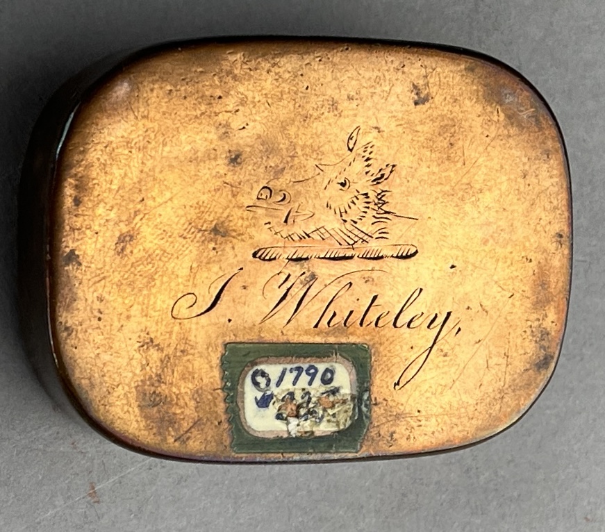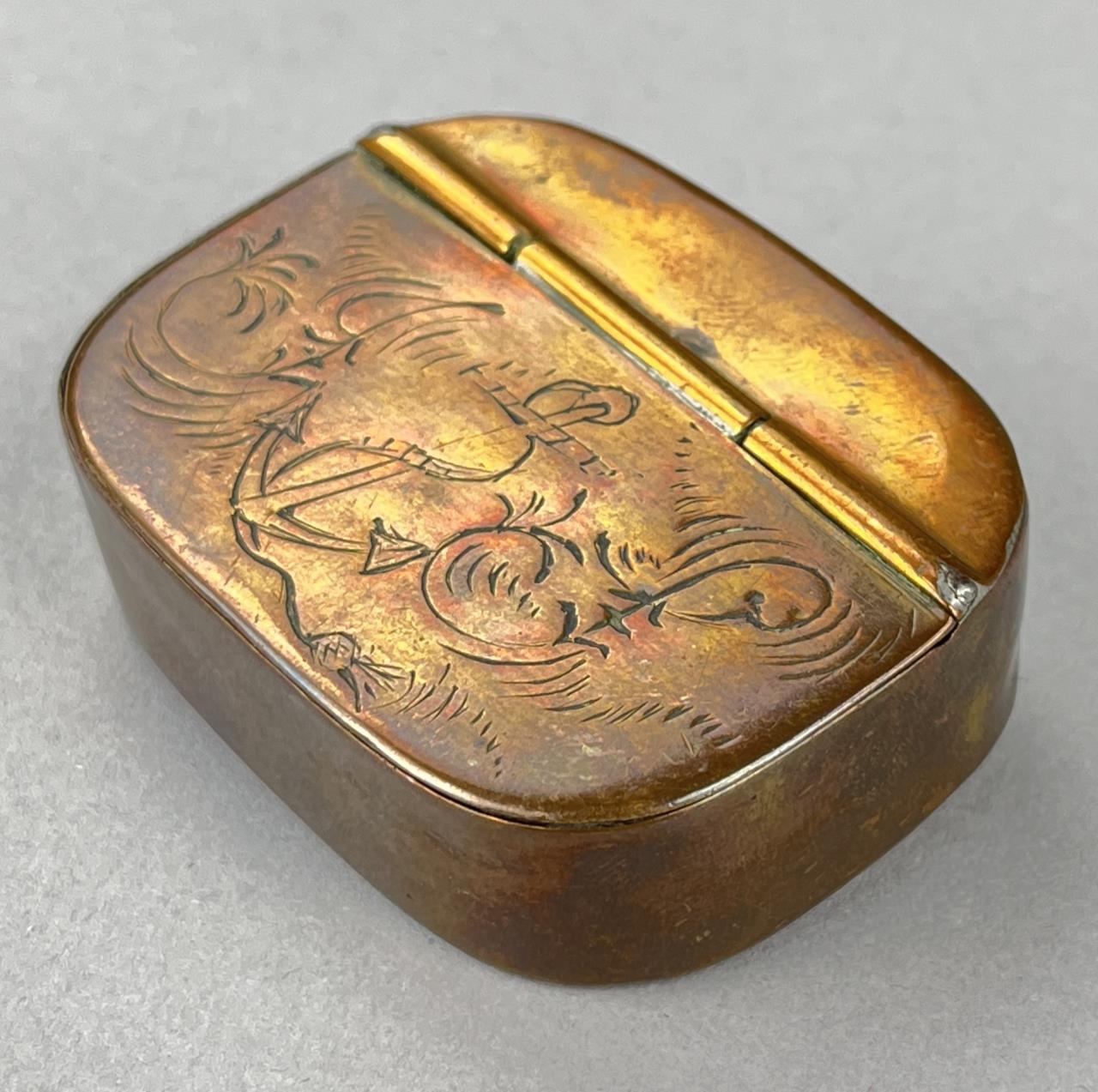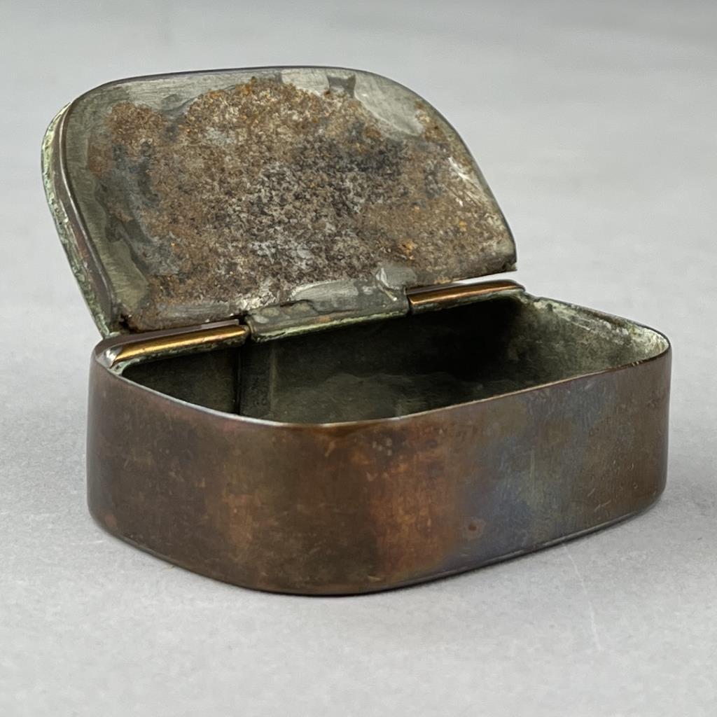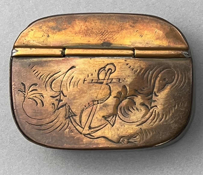 George III engraved copper snuff box, circa 1790s, approximately 1-15/16″ x 2-1/2″ x 3/4″. CONDITION: Remnants of an adhesive tag on backside. SHIPPING: In-House Shipping Available. Please read our Shipping Policies and Terms and Conditions
