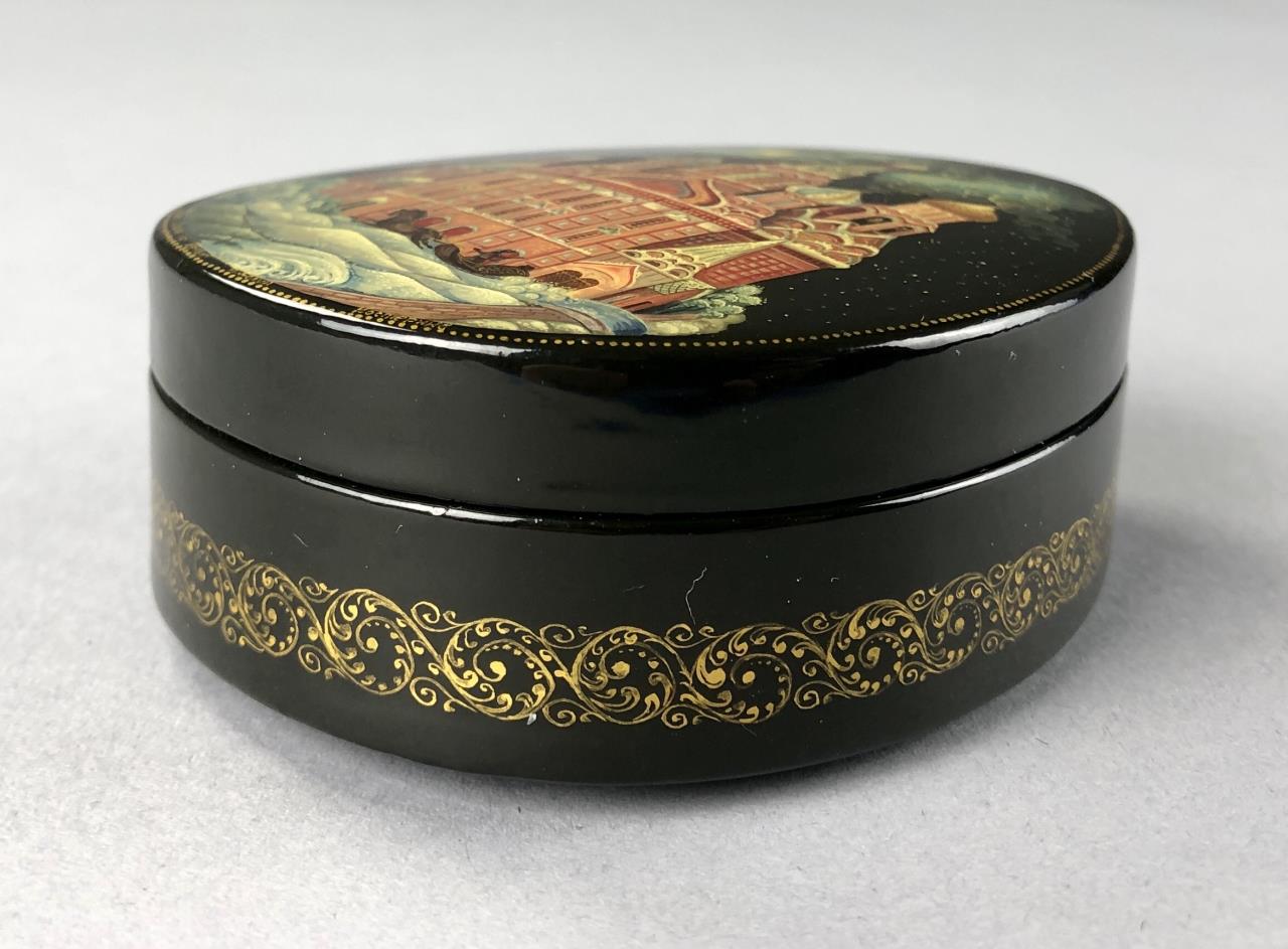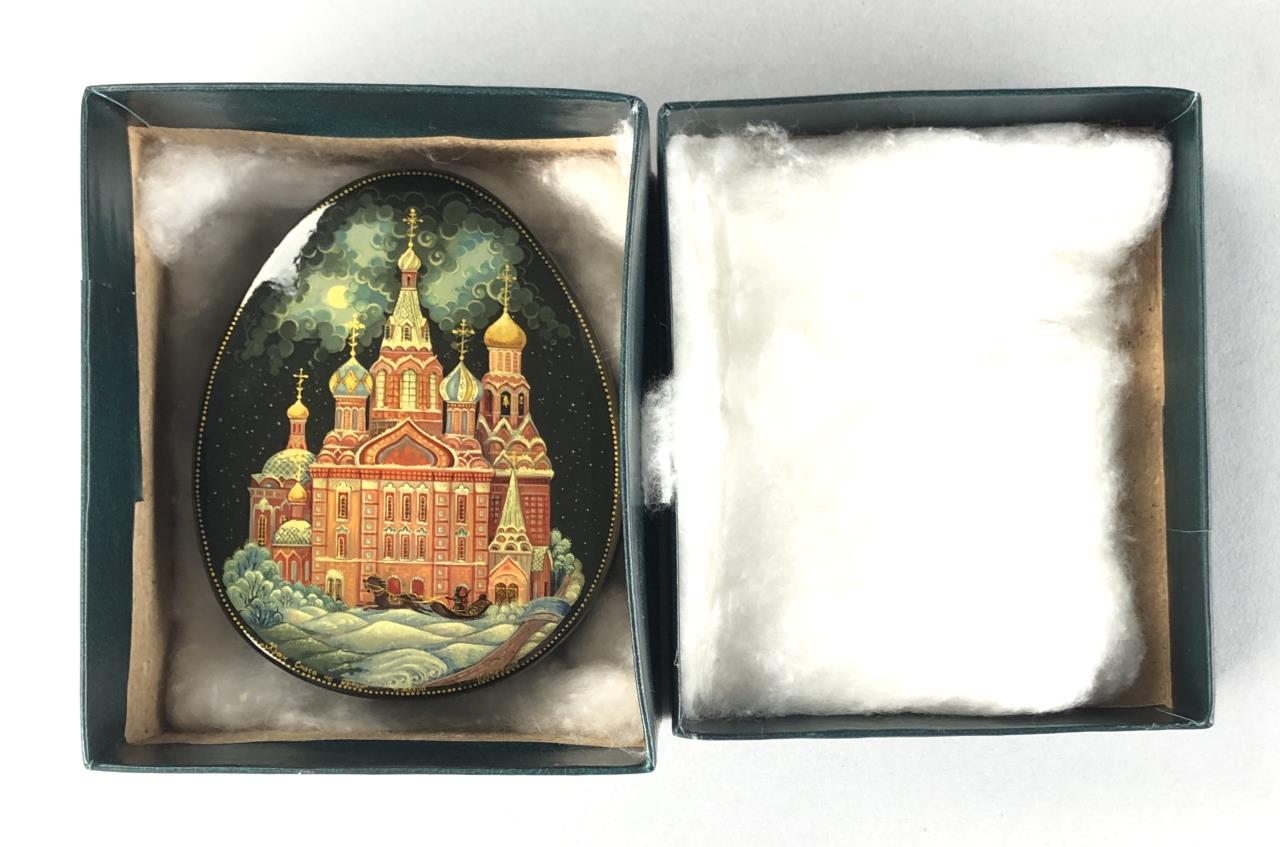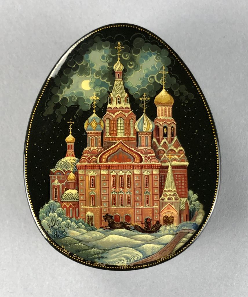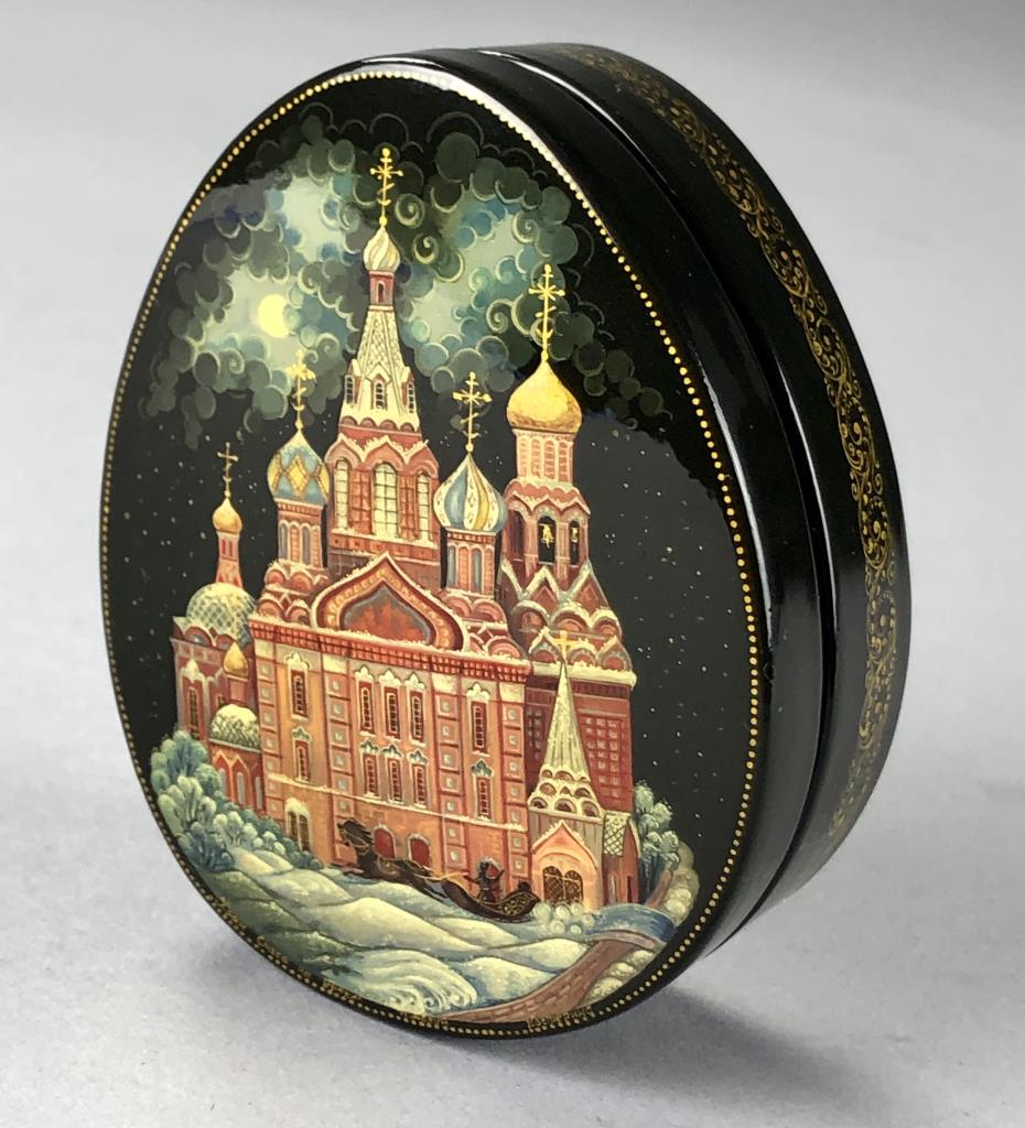 Russian papier-mache and black lacquer box, Kholui School, depicting The Church of the Savior on Spilled Blood, a Russian Orthodox church in Saint Petersburg, detached lid, hand painted, with red interior, and gold metallic accents, artist signed lower right, approximately 3-1/4″ L x 2-1/2″ W x 1-1/8″H. Provenance: ex-private Saint Johns, Michigan, USA collection. CONDITION: SHIPPING: In-House Shipping Available. Please read our Shipping Policies and Terms and Conditions