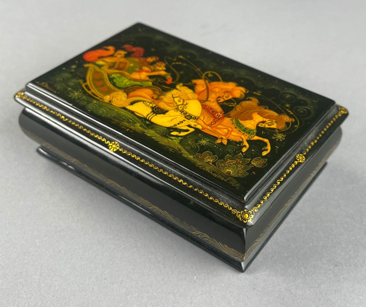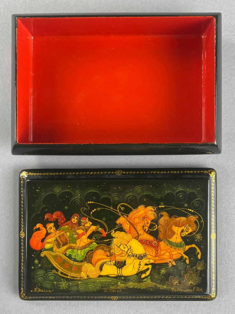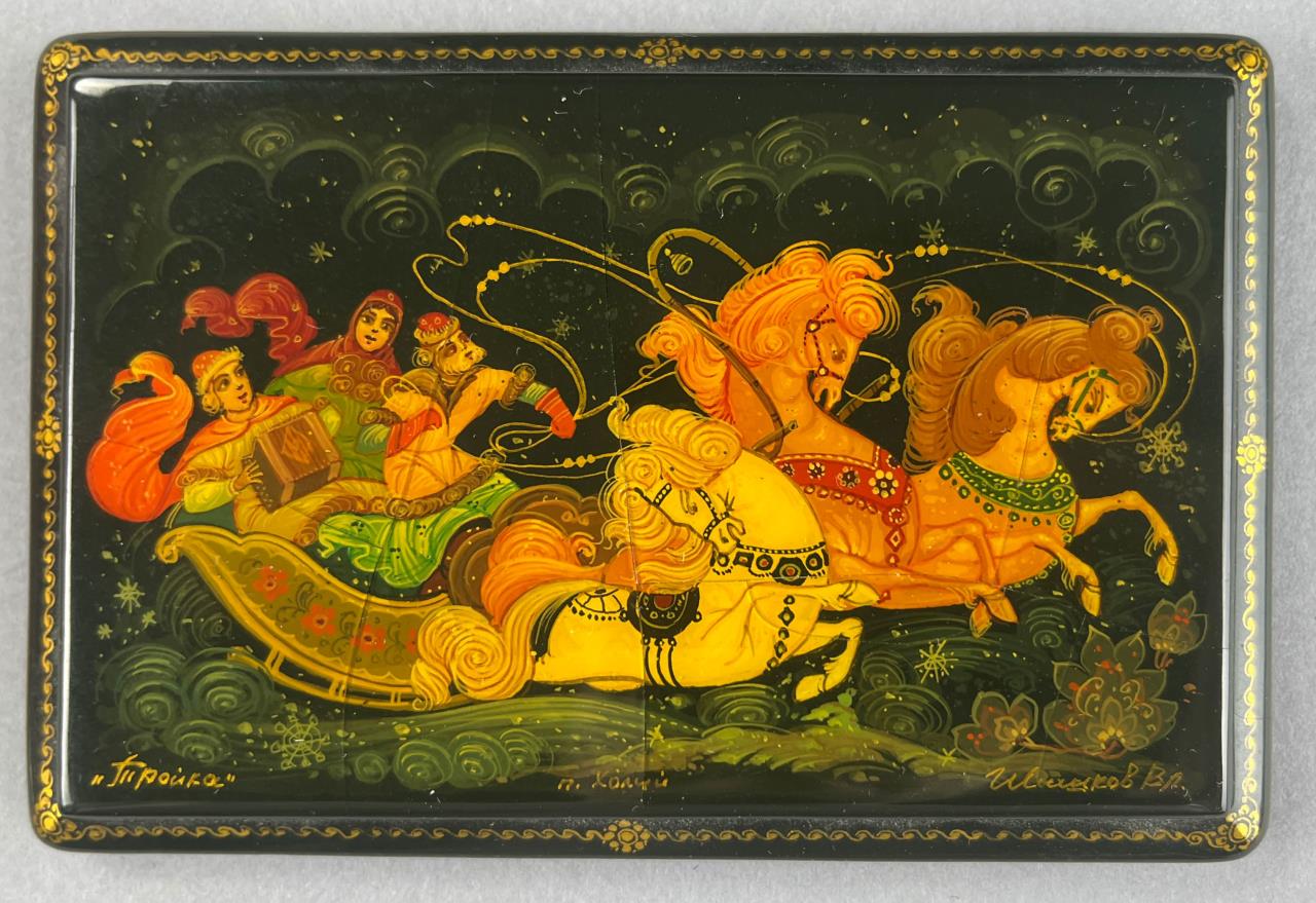 Russian papier-mache and black lacquer box, Khouli School, depicting a Troika, a traditional Russian harness that uses three horses abreast usually for pulling a sleigh, detached lid, hand painted, with red interior, artist signed lower right, approximately 3-1/16″ L x 4-5/8″ W x 1-1/2″ H. Provenance: ex-private Saint Johns, Michigan, USA collection; Moscow, Russia, 11/1992. CONDITION: Cracking to surface on lid and bottom. SHIPPING: In-House Shipping Available. Please read our Shipping Policies and Terms and Conditions