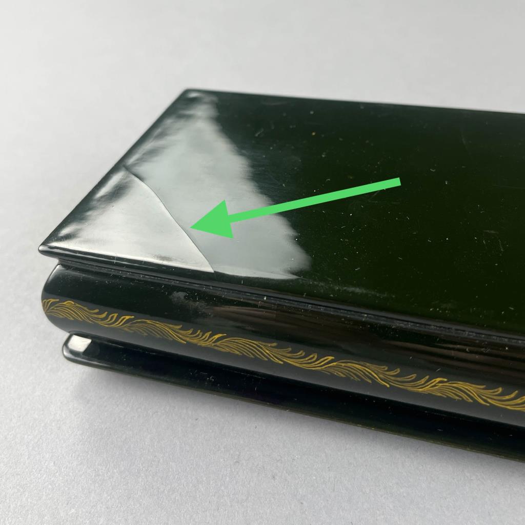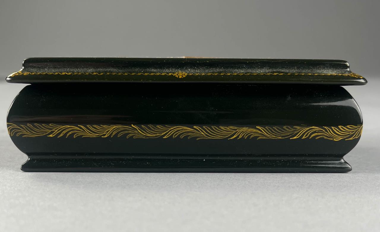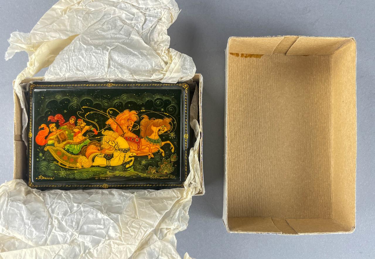 Russian papier-mache and black lacquer box, Khouli School, depicting a Troika, a traditional Russian harness that uses three horses abreast usually for pulling a sleigh, detached lid, hand painted, with red interior, artist signed lower right, approximately 3-1/16″ L x 4-5/8″ W x 1-1/2″ H. Provenance: ex-private Saint Johns, Michigan, USA collection; Moscow, Russia, 11/1992. CONDITION: Cracking to surface on lid and bottom. SHIPPING: In-House Shipping Available. Please read our Shipping Policies and Terms and Conditions