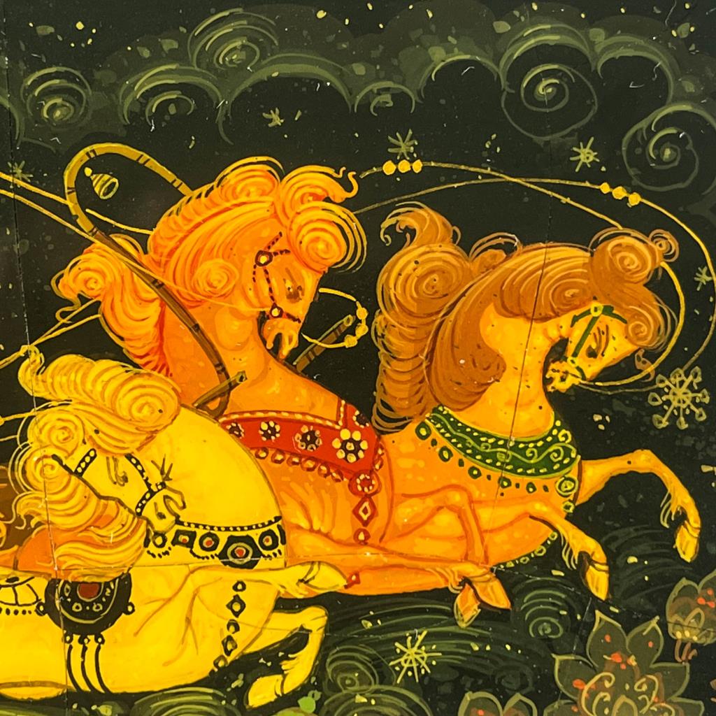 Russian Kholui Lacquer Box Sleigh with 3 Horses