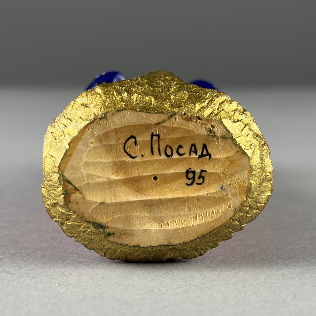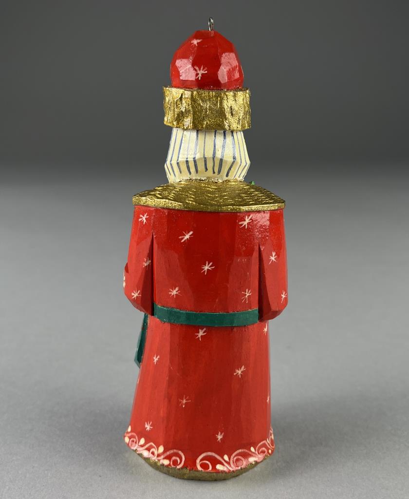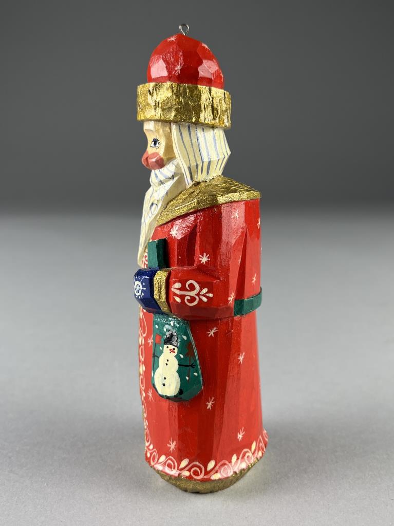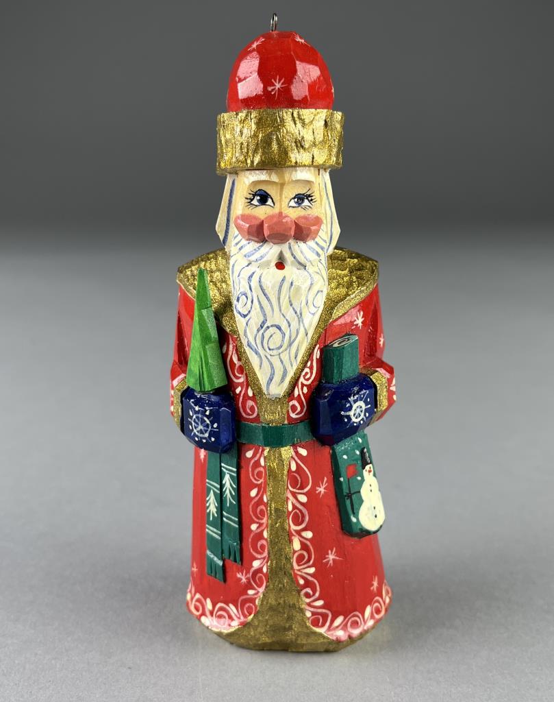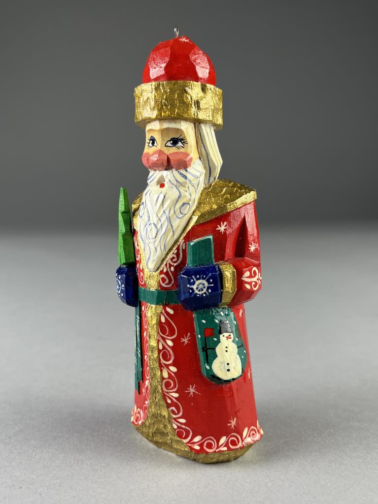 Russian hand carved and hand painted wood Santa Christmas ornament, artist signed on bottom, approximately 5-1/4″ H. CONDITION: Christmas tree in the right hand is detached. SHIPPING: In-House Shipping Available. Please read our Shipping Policies and Terms and Conditions