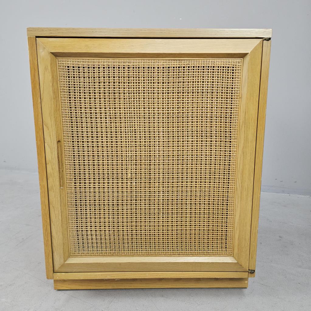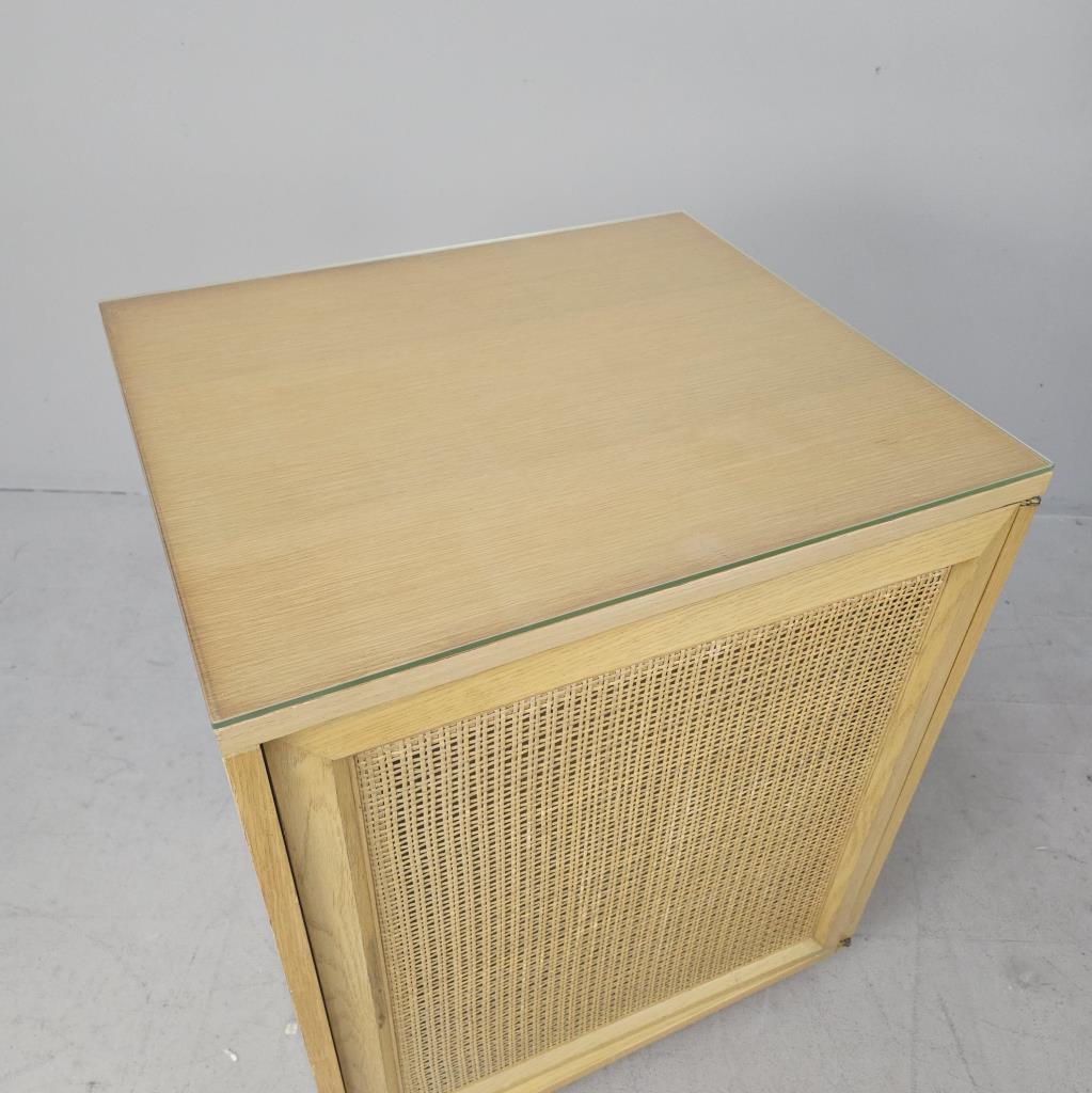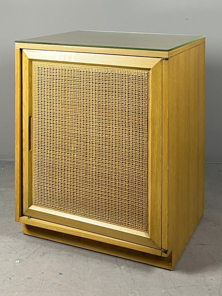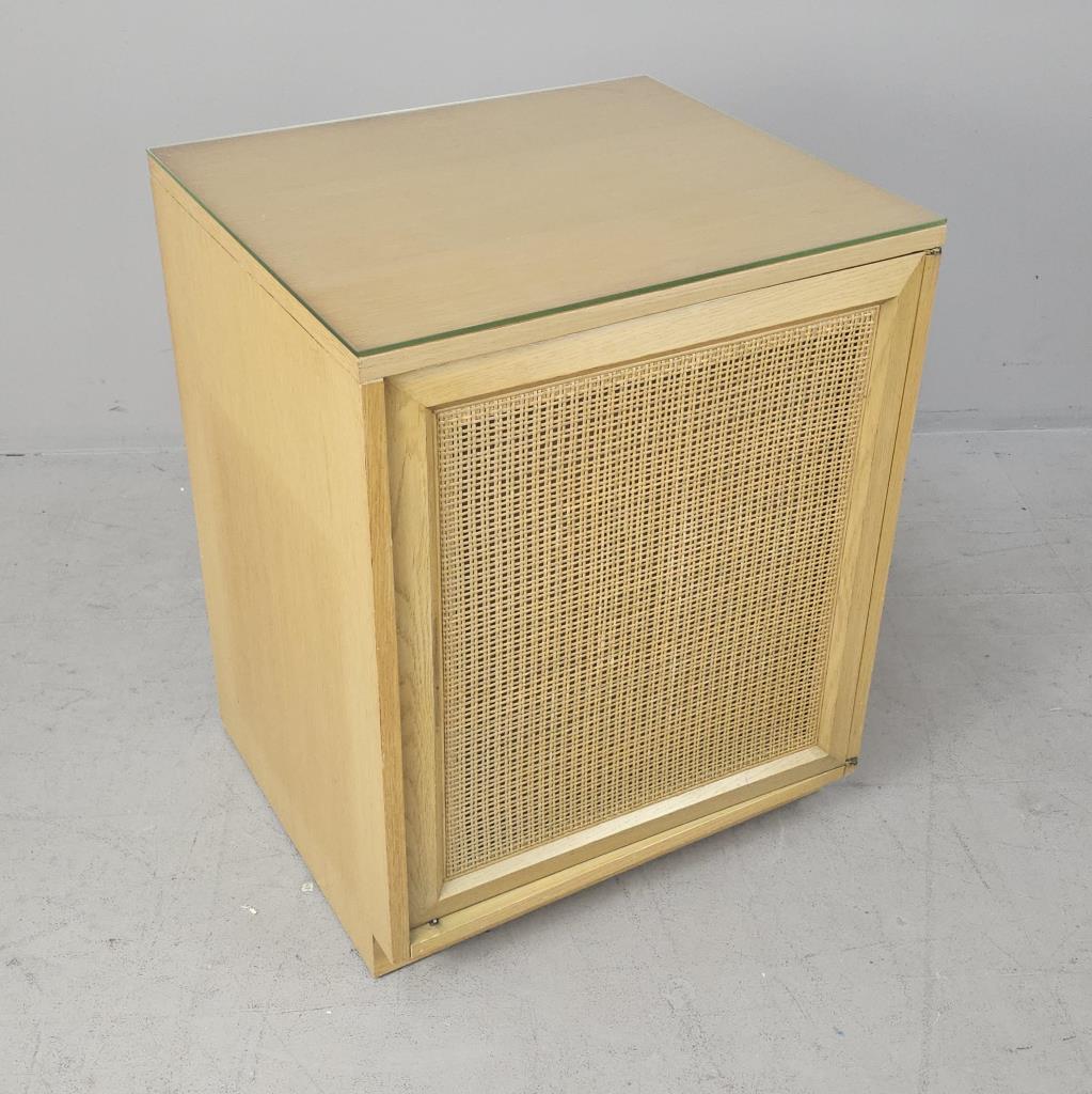 Sligh Furniture Company / Grand Rapids Chair Company (Grand Rapids, Michigan), Scandinavian Modern style modular low cabinet (no. 1511), from the “Cross Country” line, which was introduced in 1950, four drawers behind one hinged door with an inset woven cane panel, marked on inside of top drawer on left side as well as on back of the piece, circa 1950-1957, 21″ (D) x 24″ (W) x 30″ (H), includes a glass top. CONDITION: Sun feeding on the left side, as well as a couple of minor blemishes on the top, please see photos. SHIPPING: Local pick-up or third party shipping only for this lot. Please see the Shipping Policy for information on suggested shippers. We recommend the Pak Mail Store of Battle Creek to assist you. Please contact the shipper of your choice for shipping estimates on this lot. Refer to the Shipping section in our full Terms and Conditions for all information on shipping.