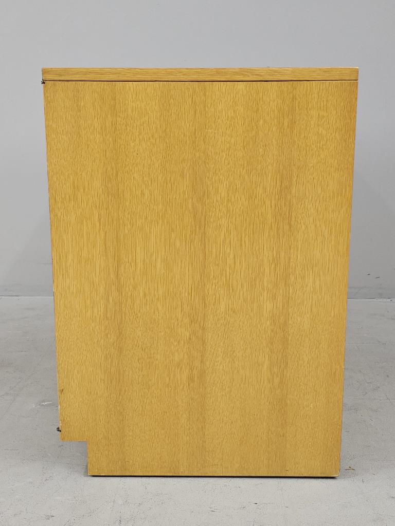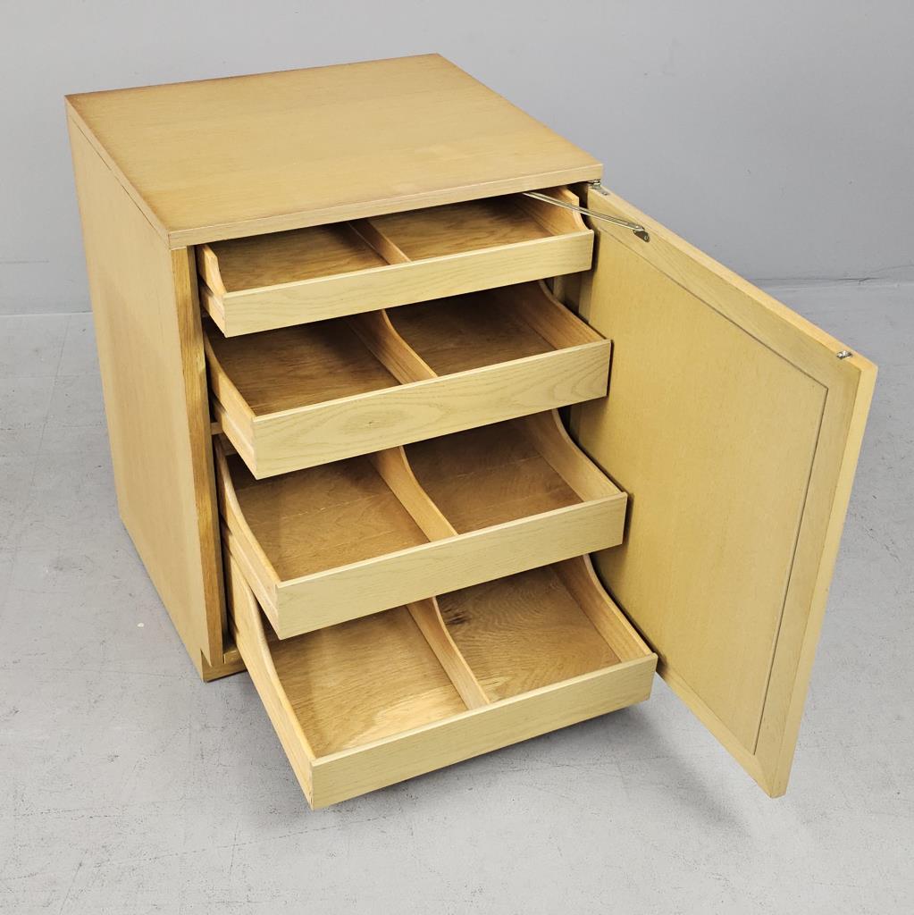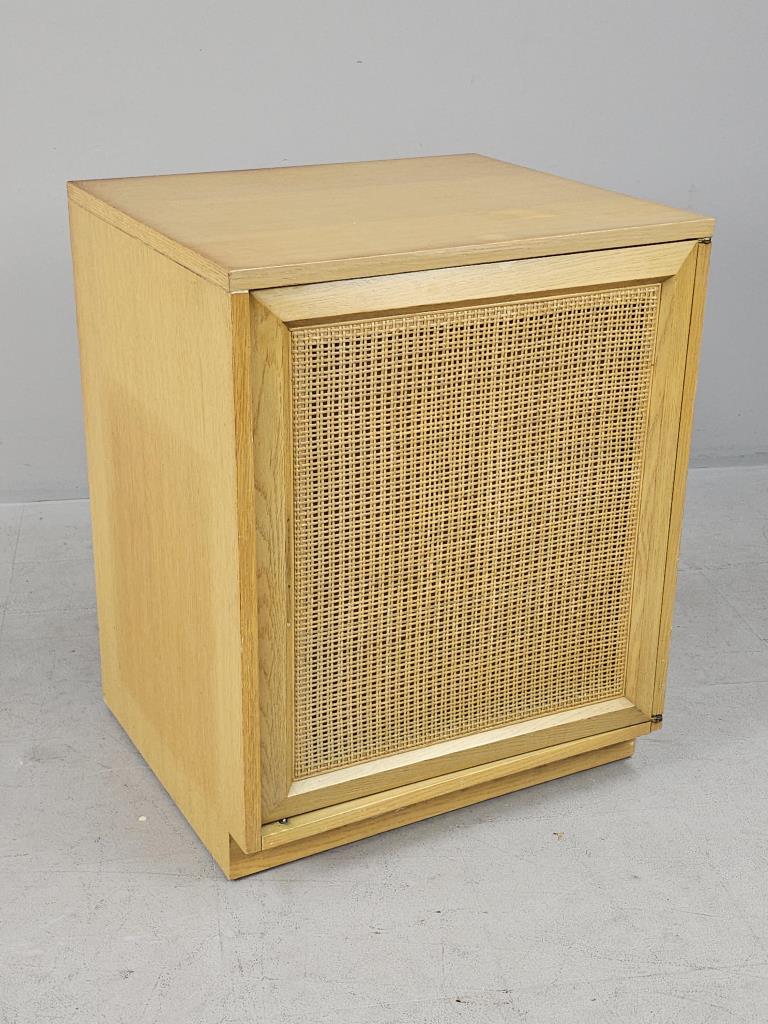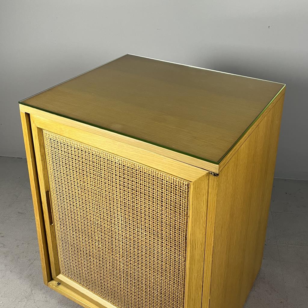Sligh Furniture Company / Grand Rapids Chair Company (Grand Rapids, Michigan), Scandinavian Modern style modular low cabinet (no. 1511), from the “Cross Country” line, which was introduced in 1950, four drawers behind one hinged door with an inset woven cane panel, marked on inside of top drawer on left side as well as on back of the piece, circa 1950-1957, 21″ (D) x 24″ (W) x 30″ (H), includes a glass top. CONDITION: Sun feeding on the left side, as well as a couple of minor blemishes on the top, please see photos. SHIPPING: Local pick-up or third party shipping only for this lot. Please see the Shipping Policy for information on suggested shippers. We recommend the Pak Mail Store of Battle Creek to assist you. Please contact the shipper of your choice for shipping estimates on this lot. Refer to the Shipping section in our full Terms and Conditions for all information on shipping.