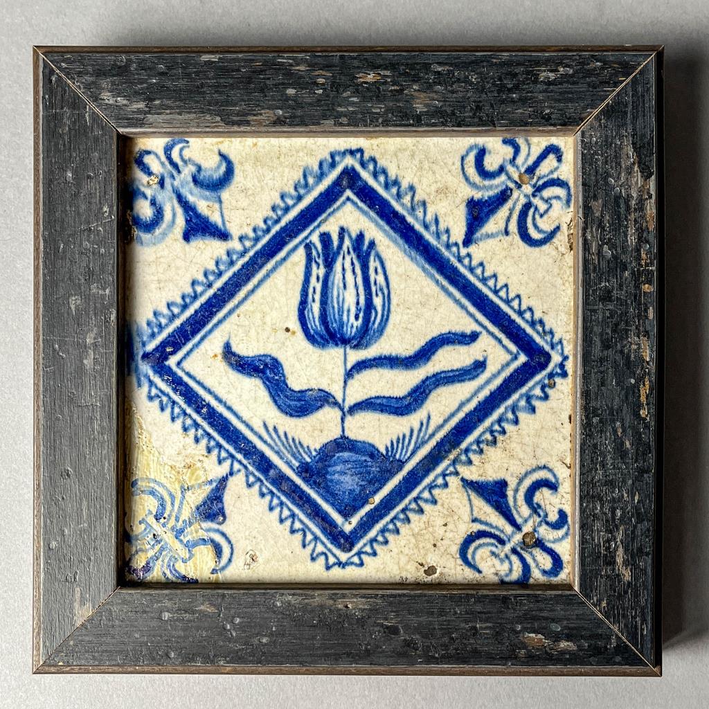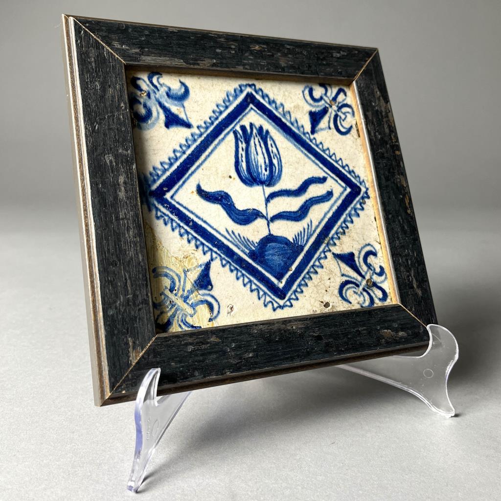 Framed Dutch Delft Blue Tulip Tile 1620s