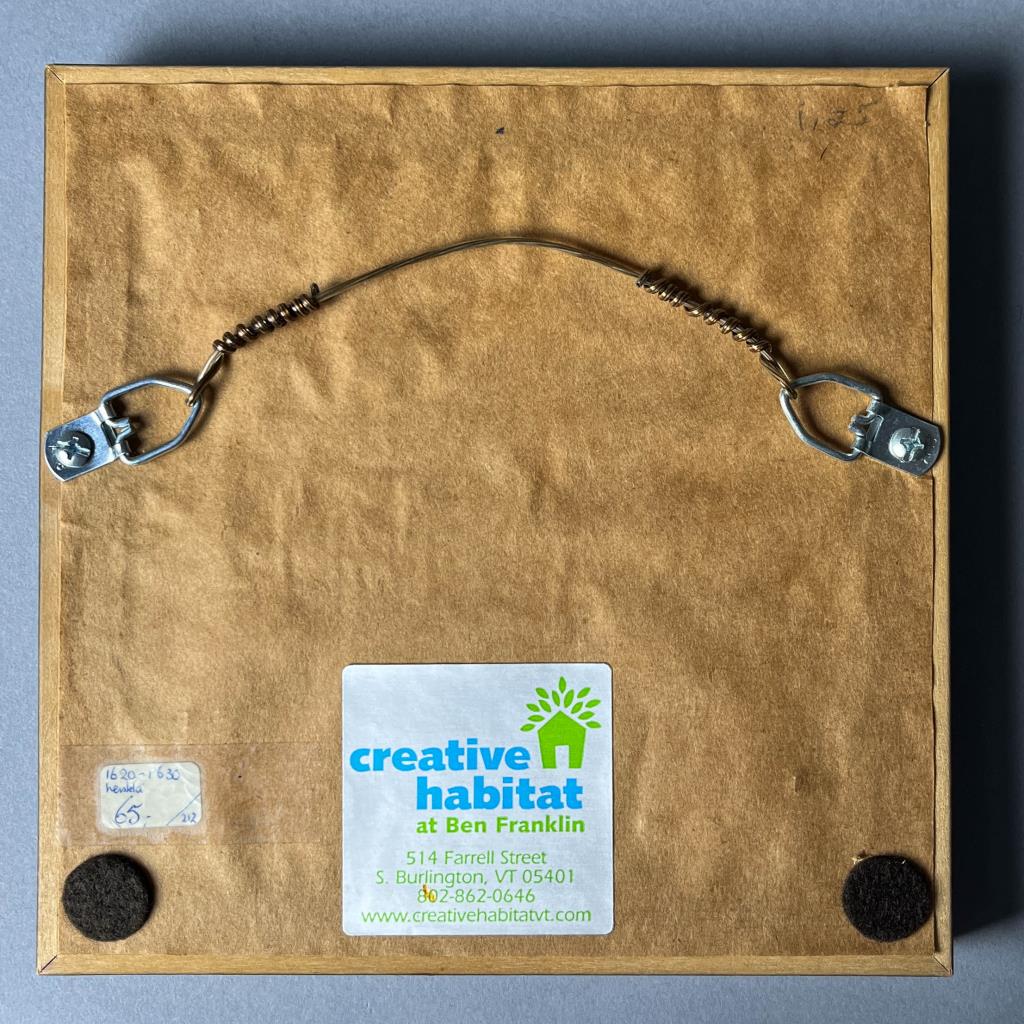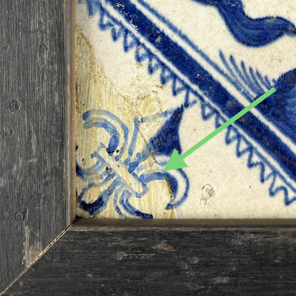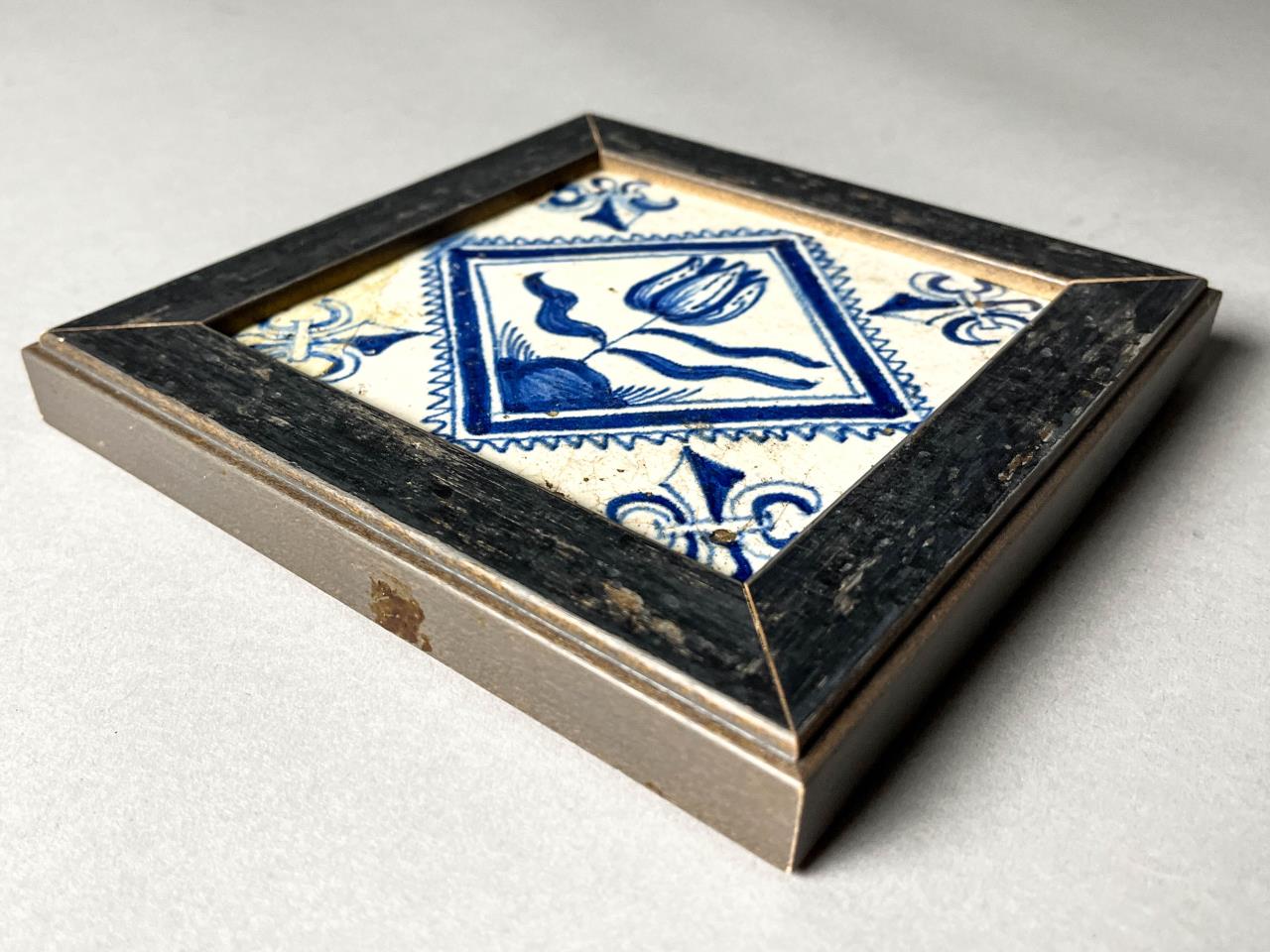 Framed antique hand painted blue and white Delft (Netherlands) tile, depicting a tulip in the center with a Fleur de Lis in each corner, circa 1620 – 1640, in a dark wood frame measuring 6-13/16″ square. CONDITION: Not examined out of frame. One corner appears to be repaired or reconstructed. SHIPPING: In-House Shipping Available. Please read our Shipping Policies and Terms and Conditions