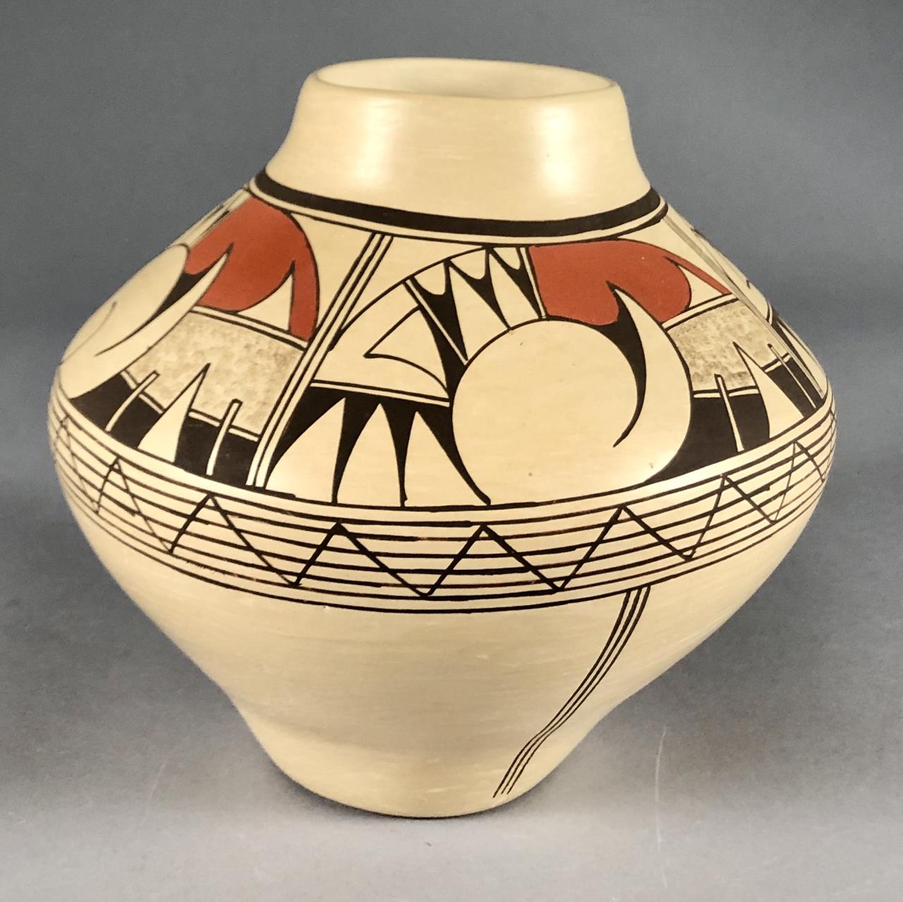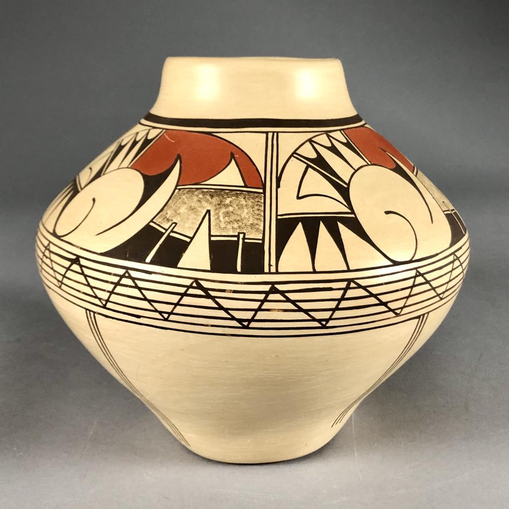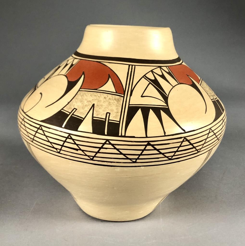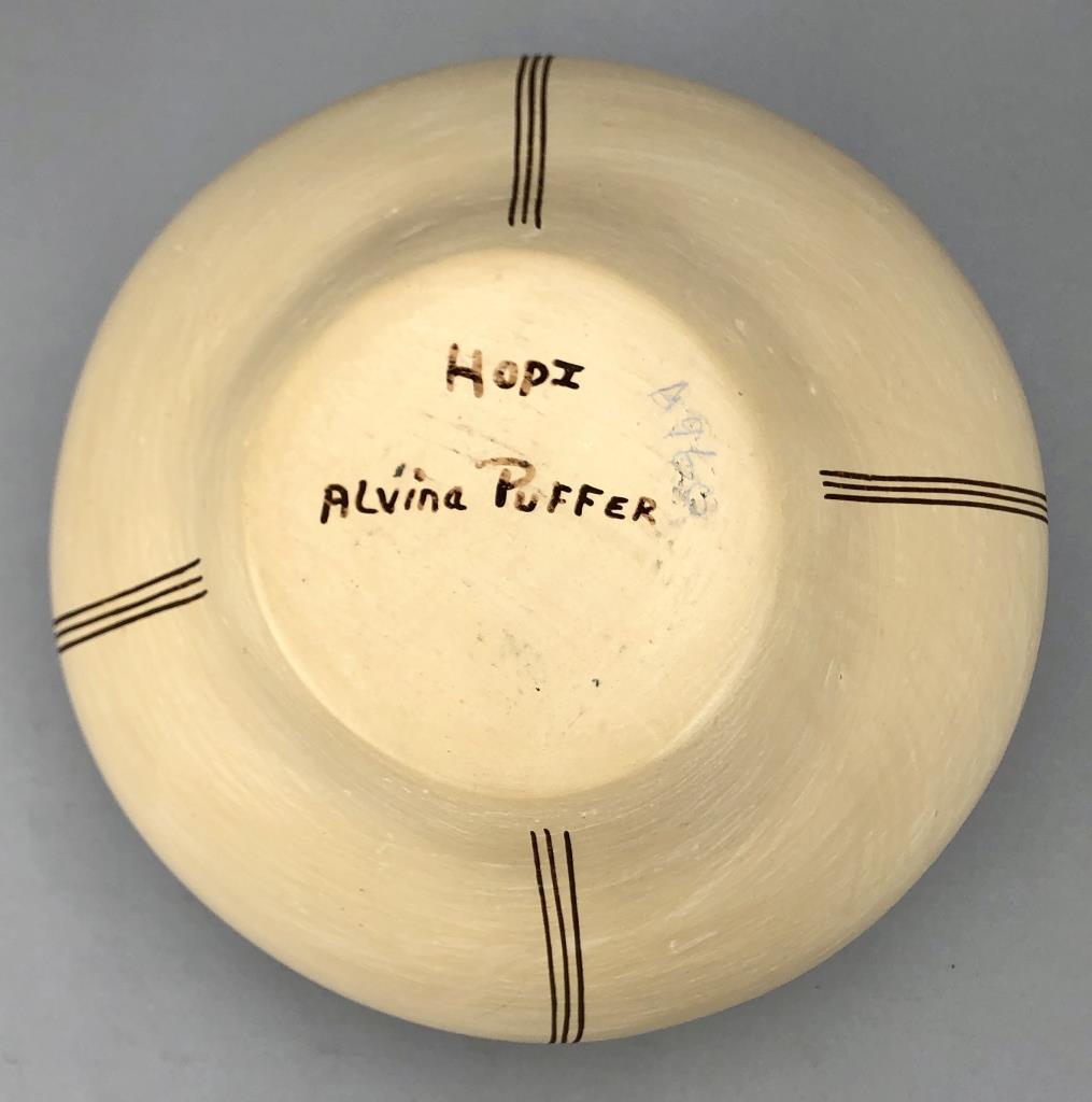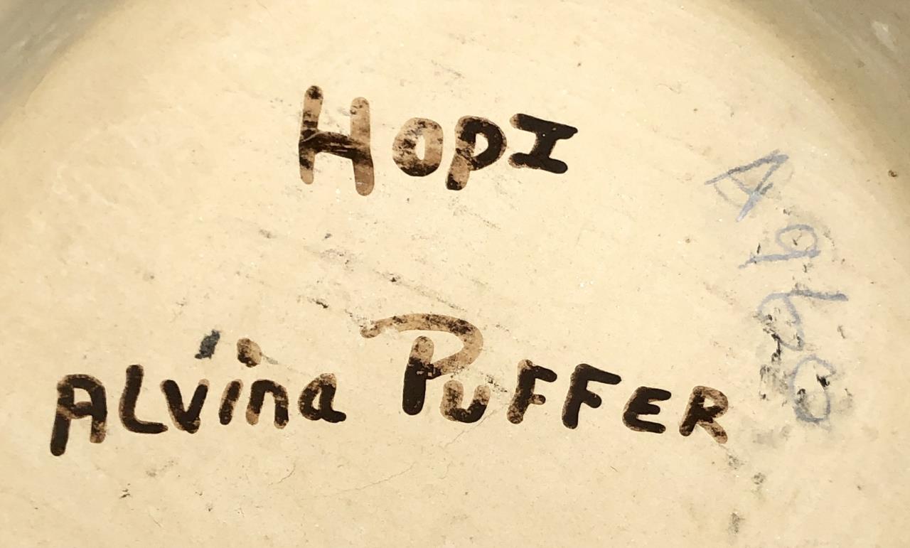 Native American, Hopi, pottery jar with polychrome decoration, signed on bottom “Hopi Alvina Puffer,” circa mid to late 20th Century, 8-3/4″ H x 10″ D. CONDITION: SHIPPING: In-House Shipping Available. Please read our Shipping Policies and Terms and Conditions
