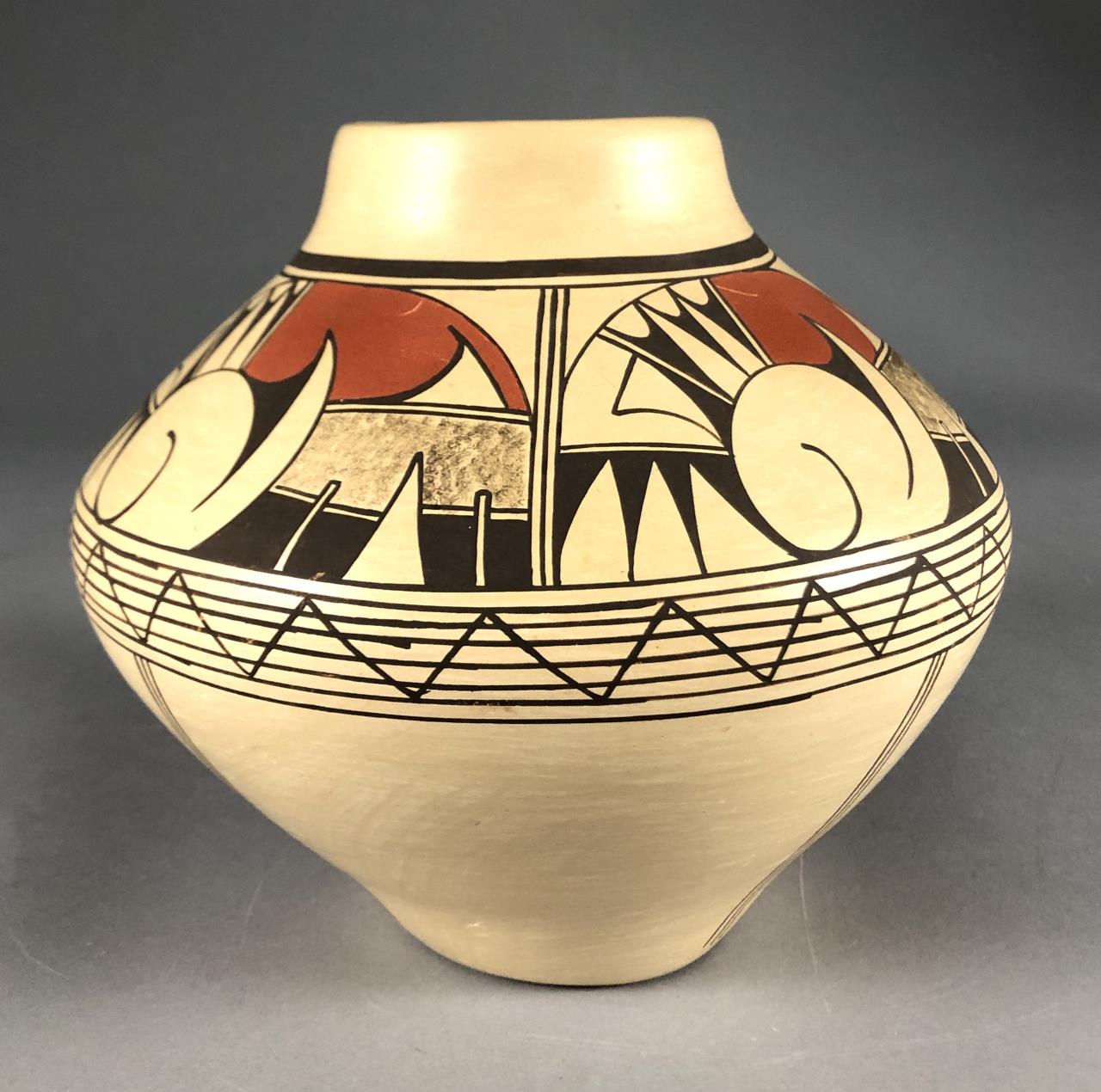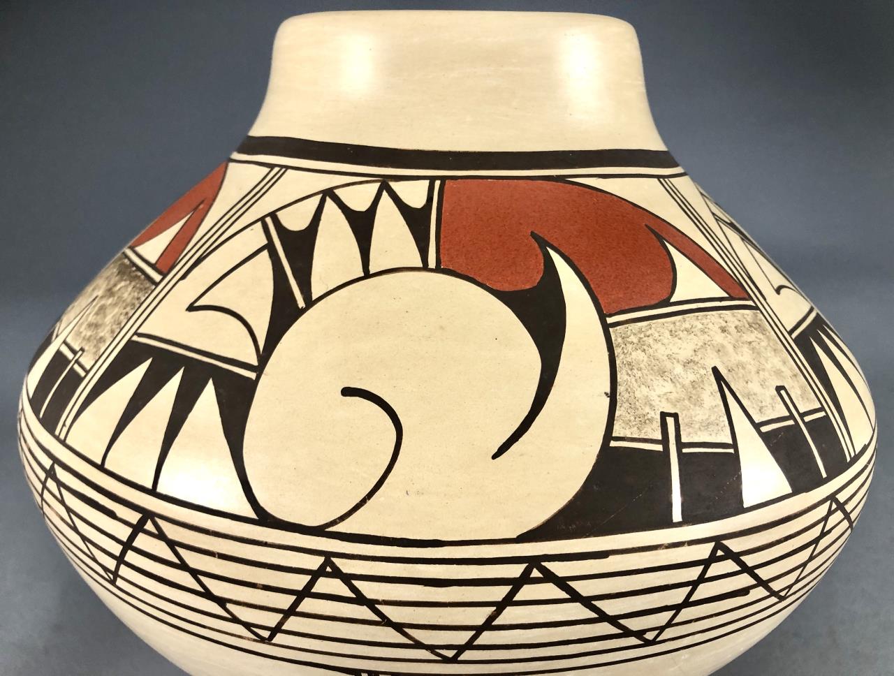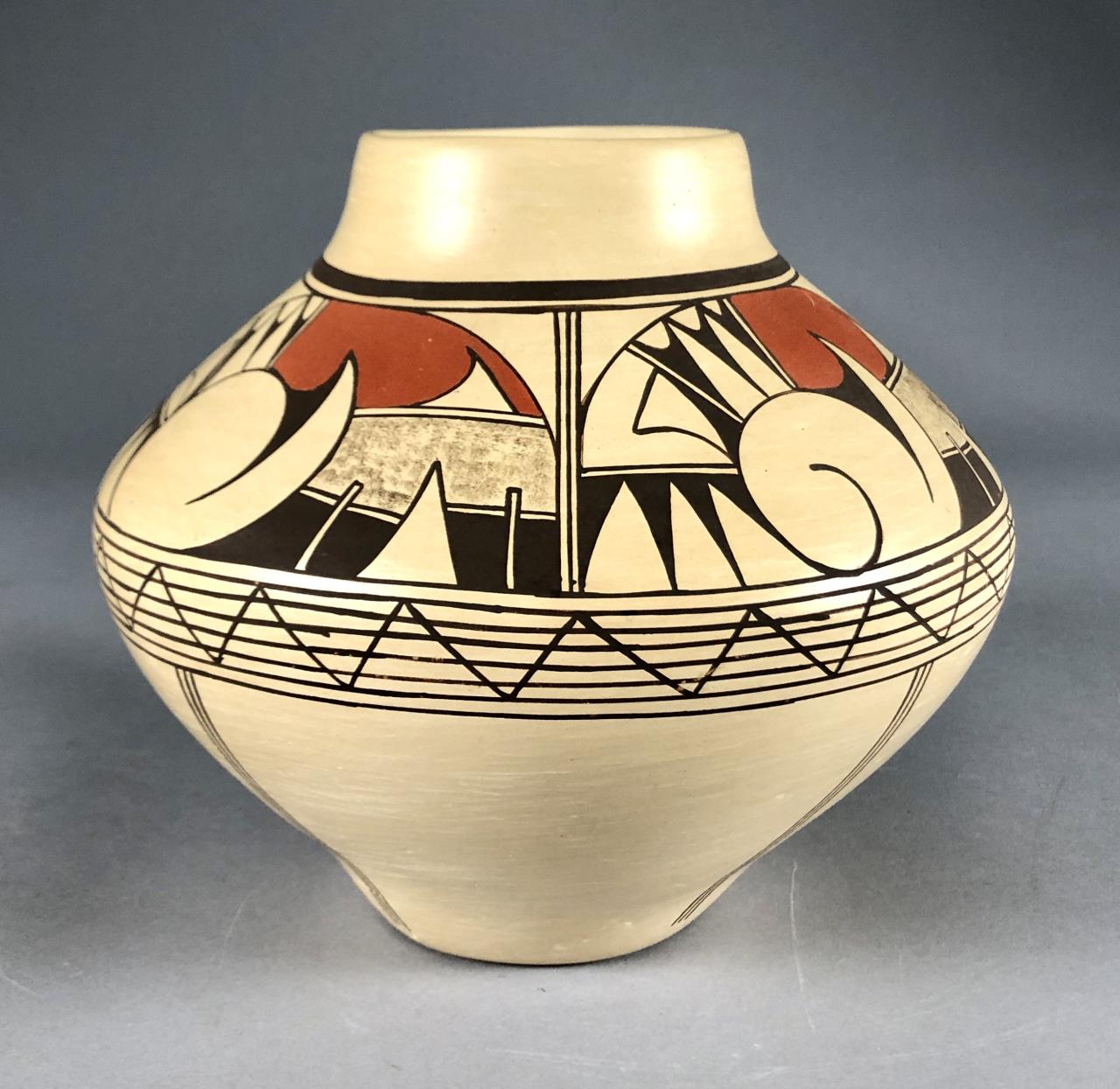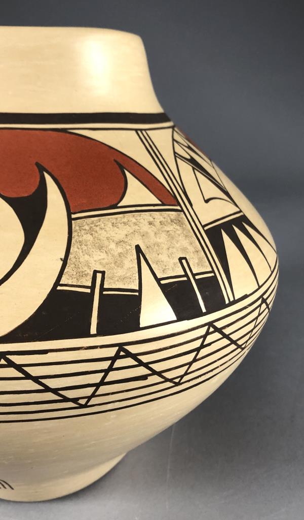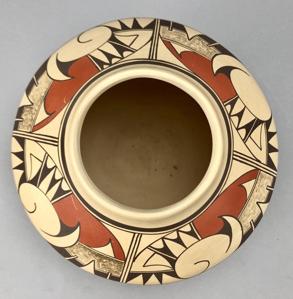 Native American, Hopi, pottery jar with polychrome decoration, signed on bottom “Hopi Alvina Puffer,” circa mid to late 20th Century, 8-3/4″ H x 10″ D. CONDITION: SHIPPING: In-House Shipping Available. Please read our Shipping Policies and Terms and Conditions