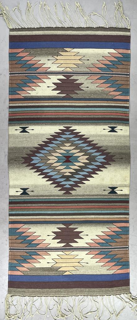 Hand woven wool serape, Mexican, circa late 20th Century, approximately 80-1/2″ x 36-1/2″ (not including fringe). CONDITION: SHIPPING: In-House Shipping Available. Please read our Shipping Policies and Terms and Conditions