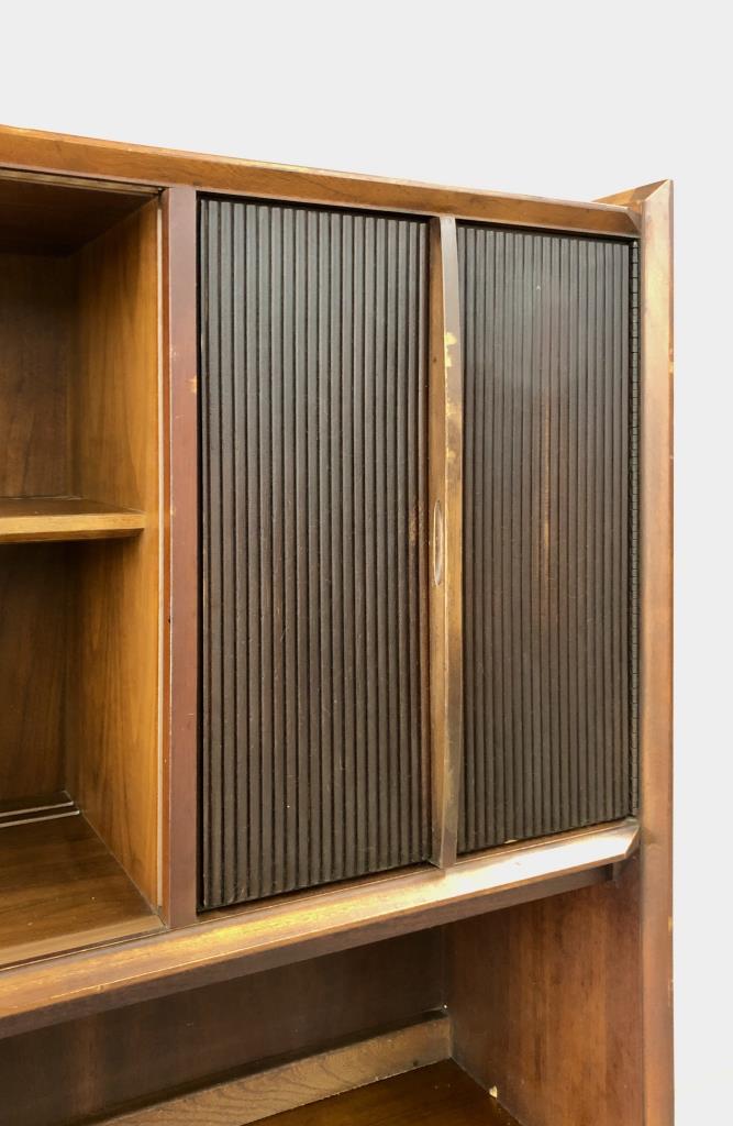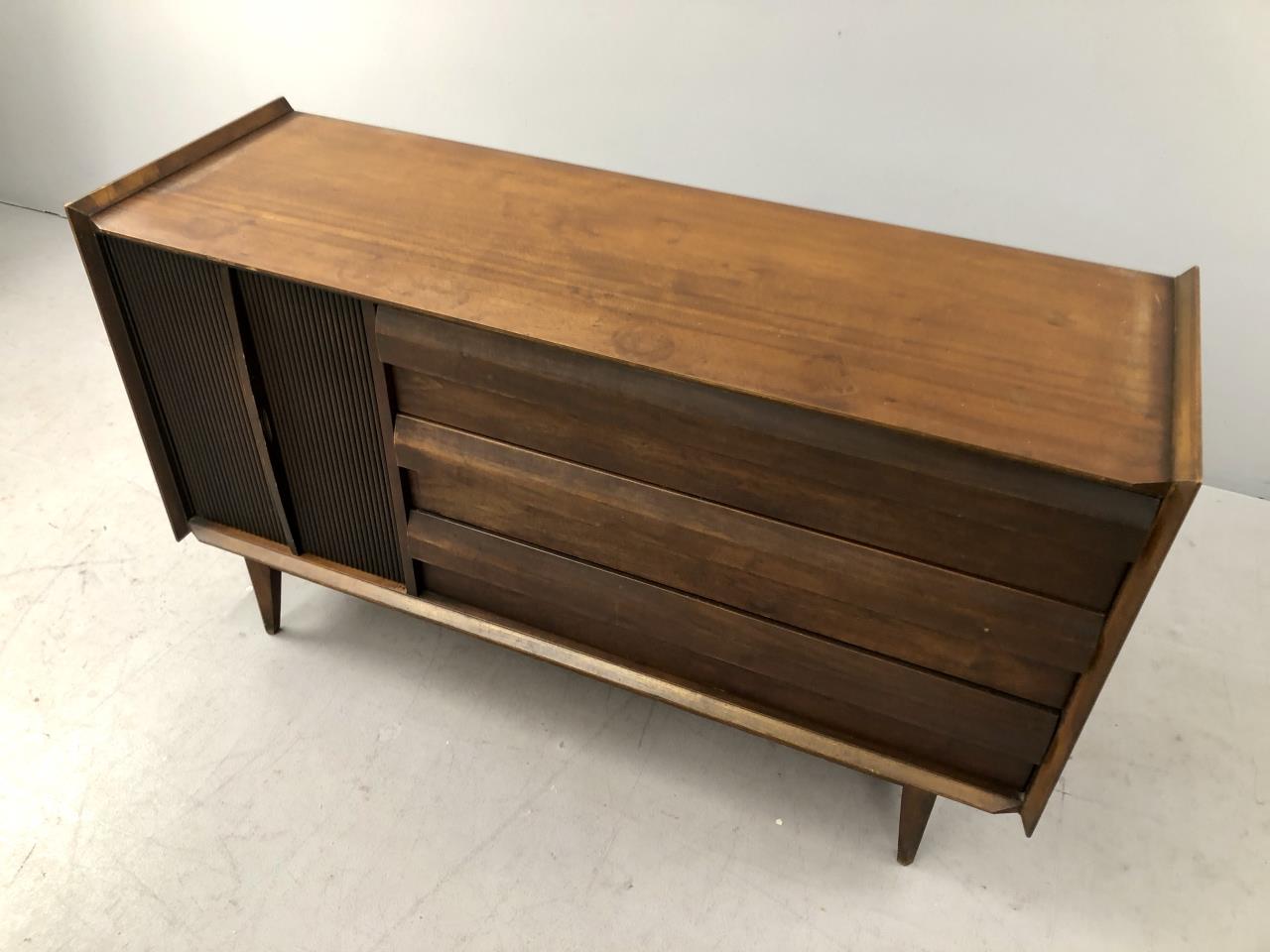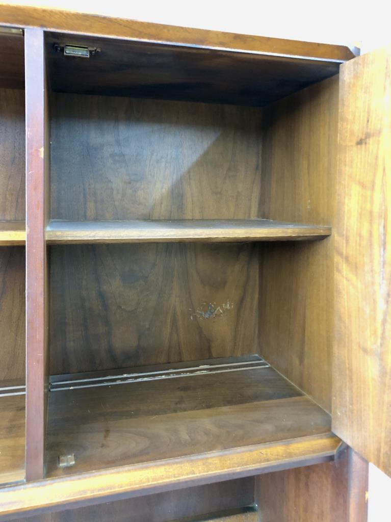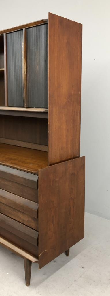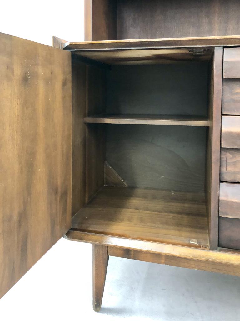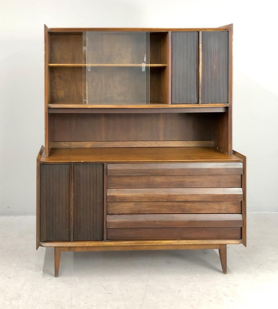 Lane (Altavista, Virginia) “First Edition” Mid Century Modern hutch or buffet, marked on inside of top drawer, circa 1960s, strong Scandinavian or Danish Modern influences, walnut with two sliding glass doors, and one wood door on the top, over three drawers and one wood door on the bottom, 54″ W x 65-1/2″ H x 18″ D. CONDITION: Scratching and staining to finish, chipping to the veneer on the base of the top on the sides, repair to one corner on the base, and chipping to edge of one of the glass doors, please see last photos. SHIPPING: Local pick-up or third party shipping only for this lot. Please see the Shipping Policy for information on suggested shippers. We recommend the Pak Mail Store of Battle Creek to assist you. Please contact the shipper of your choice for shipping estimates on this lot. Refer to the Shipping section in our full Terms and Conditions for all information on shipping.
