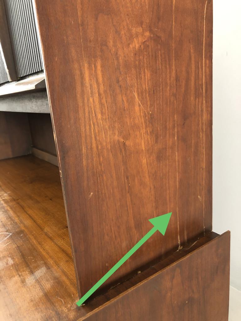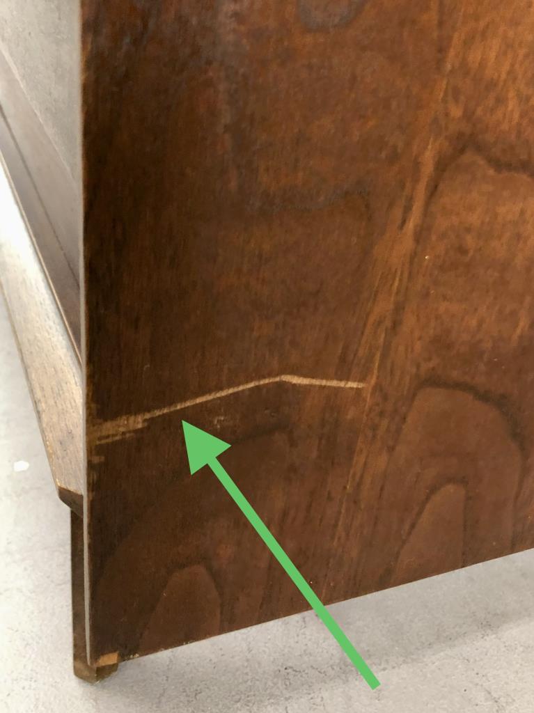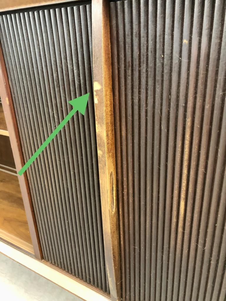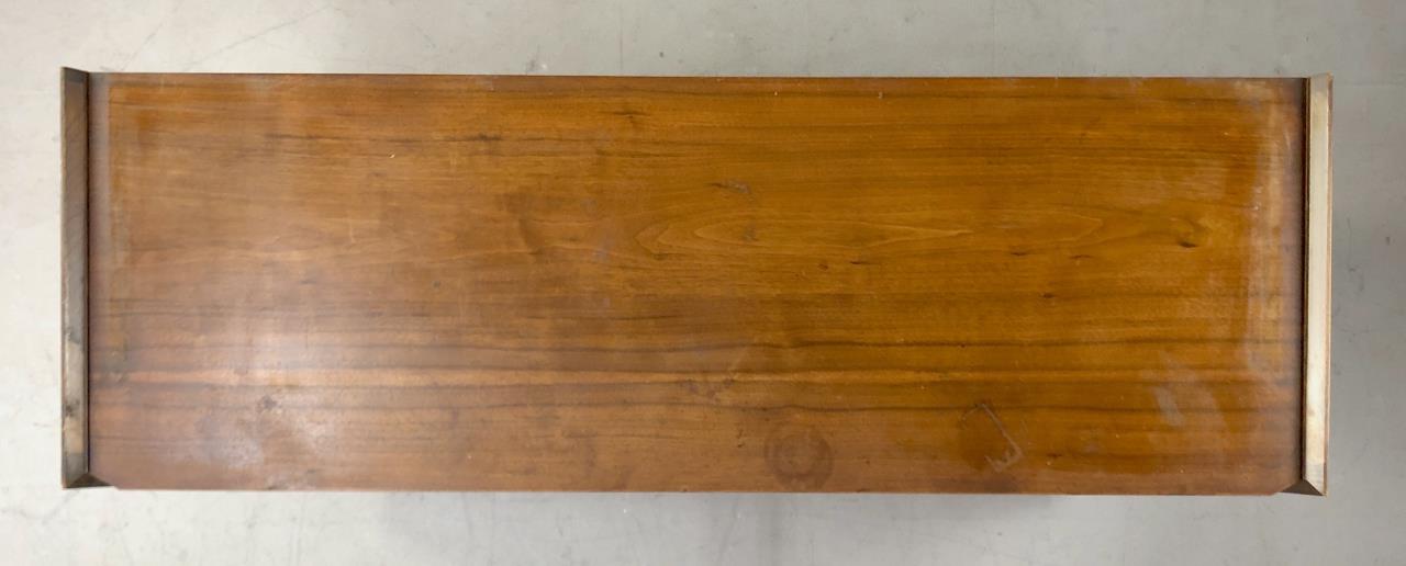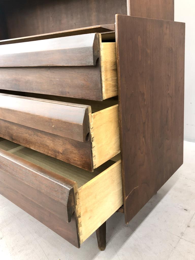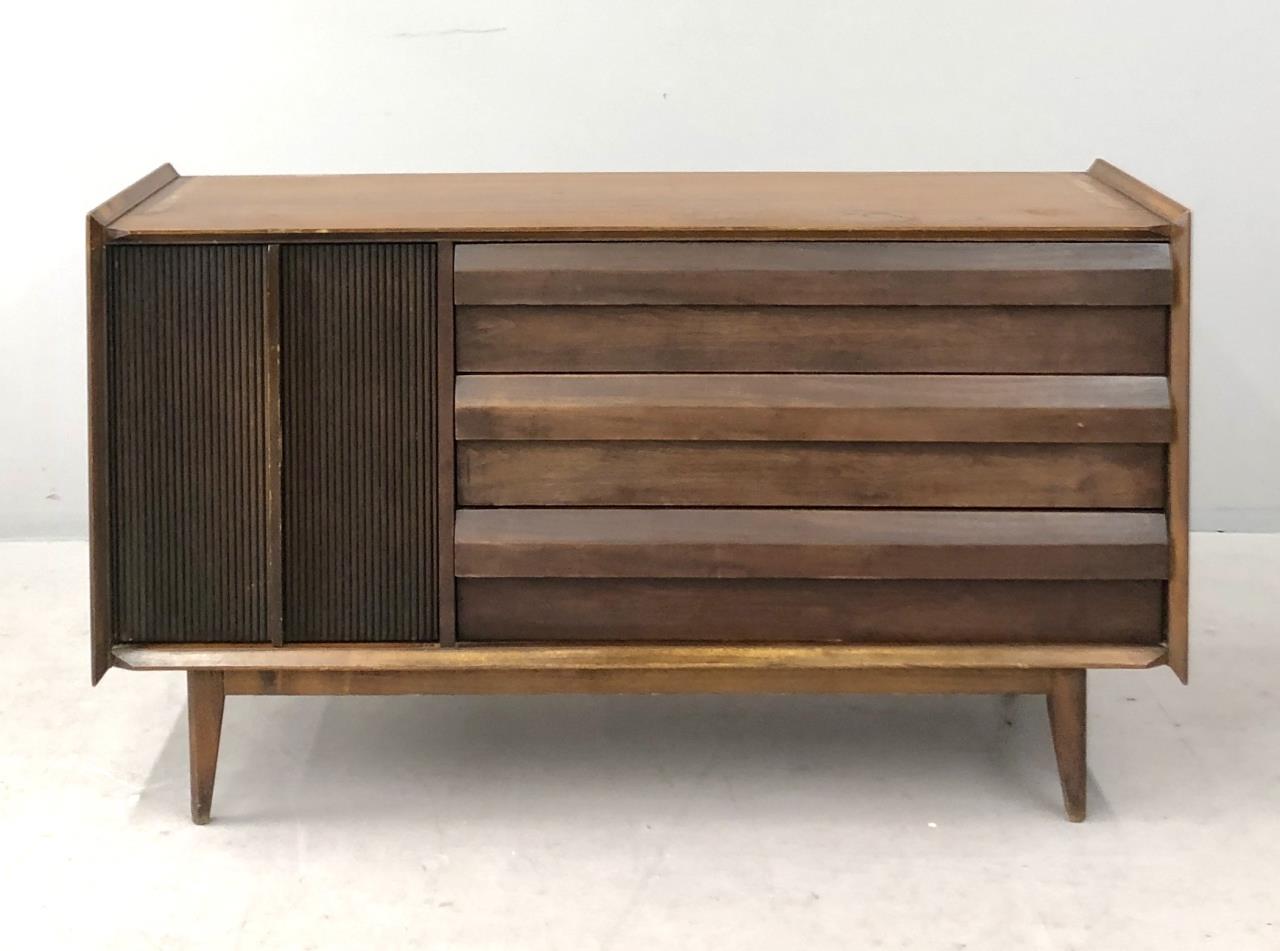 Lane (Altavista, Virginia) “First Edition” Mid Century Modern hutch or buffet, marked on inside of top drawer, circa 1960s, strong Scandinavian or Danish Modern influences, walnut with two sliding glass doors, and one wood door on the top, over three drawers and one wood door on the bottom, 54″ W x 65-1/2″ H x 18″ D. CONDITION: Scratching and staining to finish, chipping to the veneer on the base of the top on the sides, repair to one corner on the base, and chipping to edge of one of the glass doors, please see last photos. SHIPPING: Local pick-up or third party shipping only for this lot. Please see the Shipping Policy for information on suggested shippers. We recommend the Pak Mail Store of Battle Creek to assist you. Please contact the shipper of your choice for shipping estimates on this lot. Refer to the Shipping section in our full Terms and Conditions for all information on shipping.