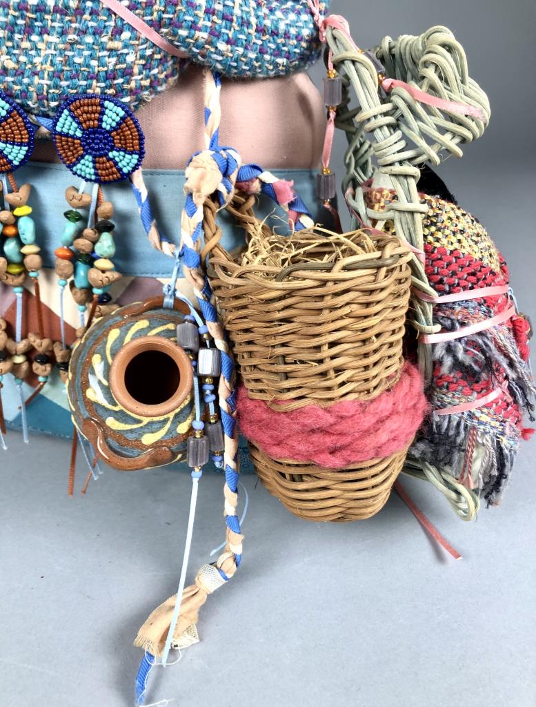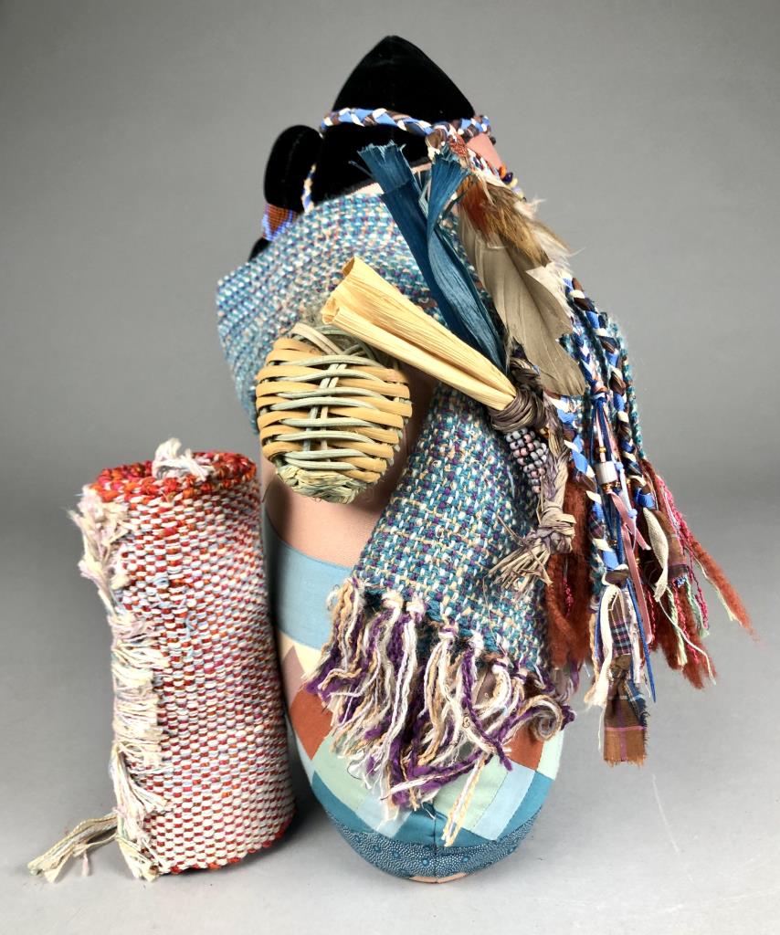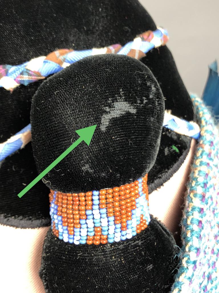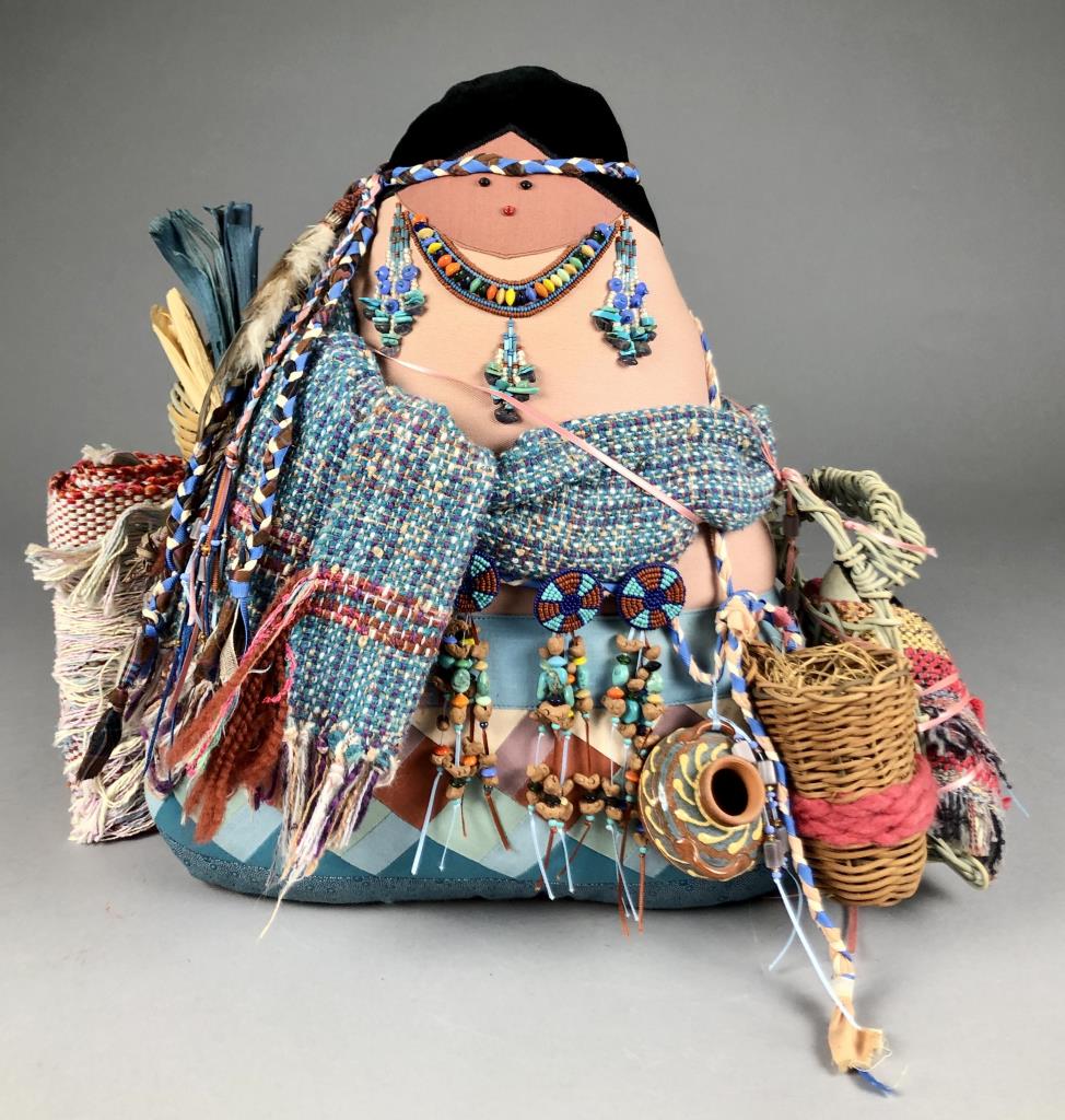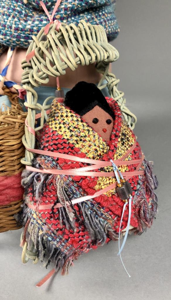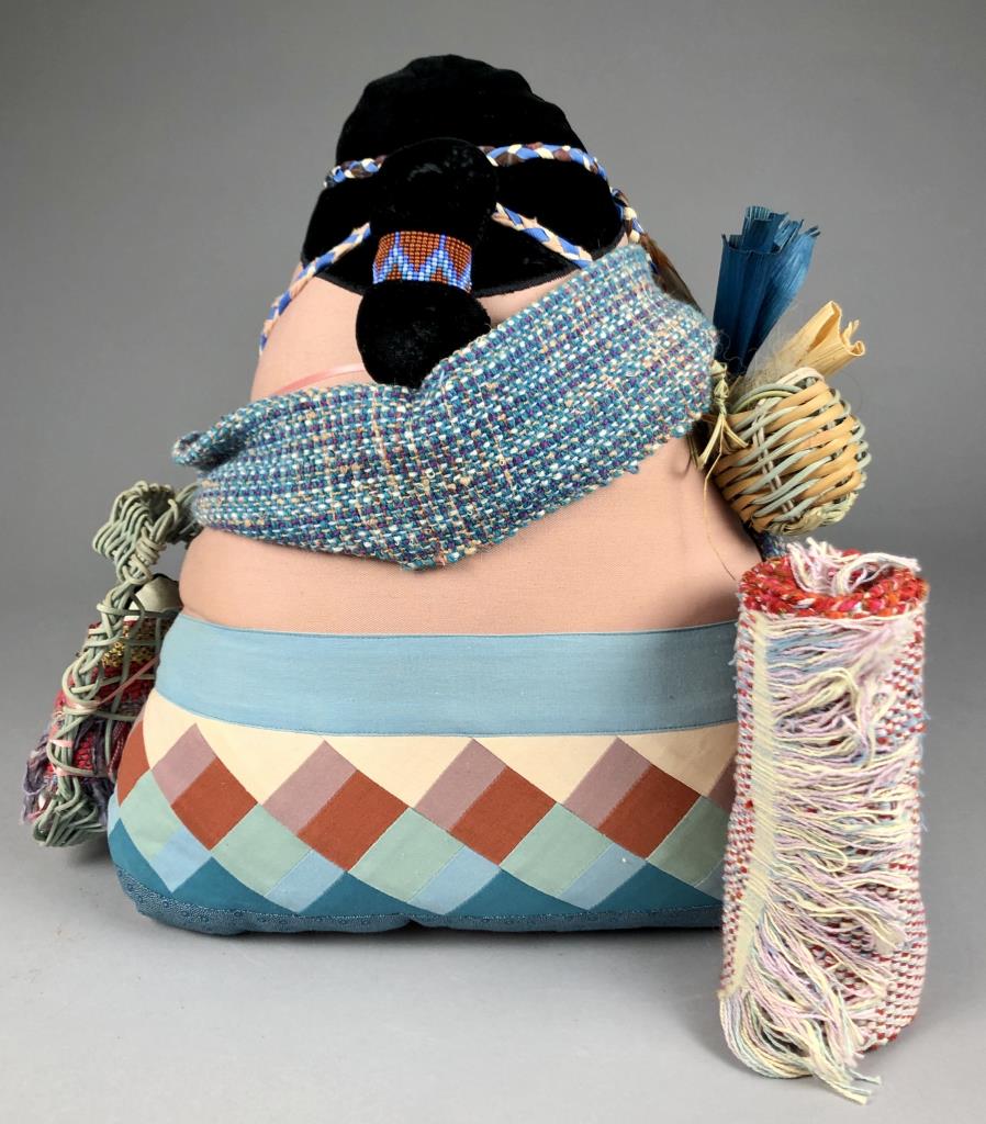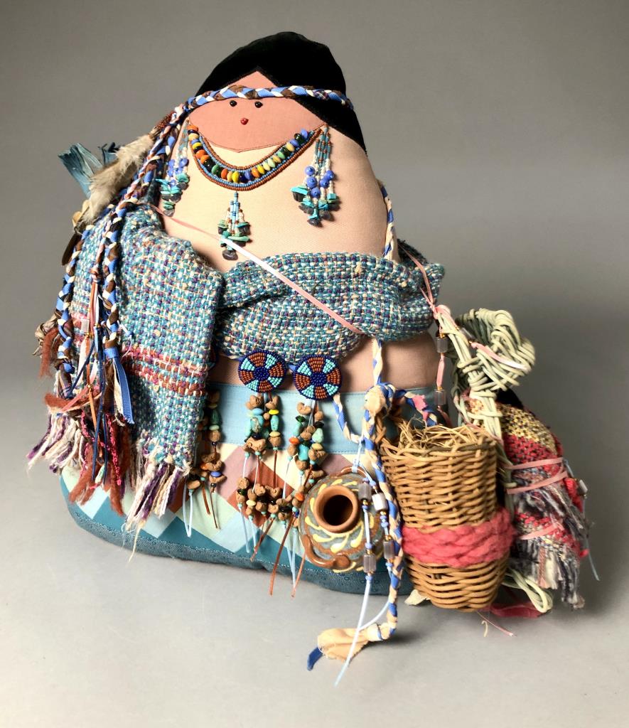 Native American style weighted cloth folk art doll, titled “Collector,” by Patrica Bonds Gaetano (Panamanian/American, active 1980s – 1990s), signed tag at base on back side, dated 1988, approximately 16″ H. CONDITION: Possible insect damage to black velvet fabric, please see last two photos. SHIPPING: In-House Shipping Available. Please read our Shipping Policies and Terms and Conditions