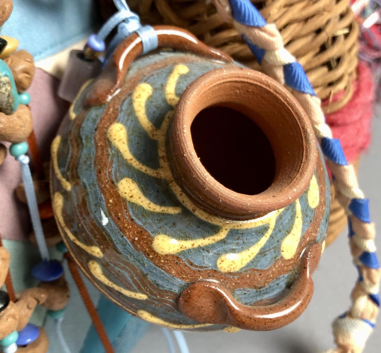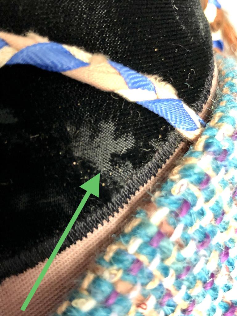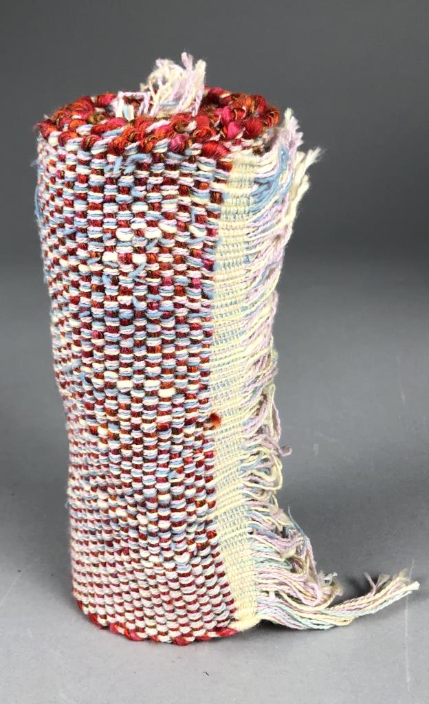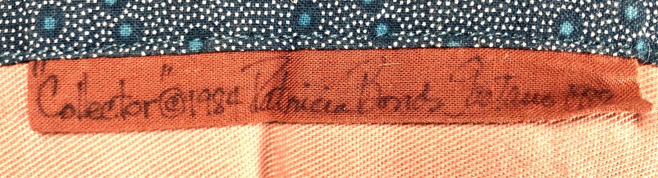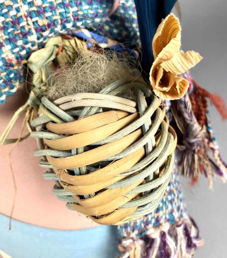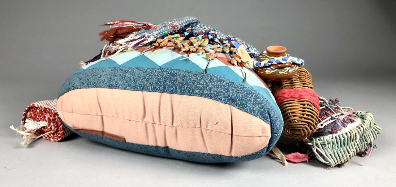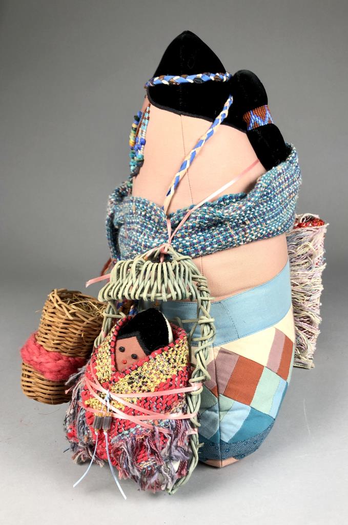 Native American style weighted cloth folk art doll, titled “Collector,” by Patrica Bonds Gaetano (Panamanian/American, active 1980s – 1990s), signed tag at base on back side, dated 1988, approximately 16″ H. CONDITION: Possible insect damage to black velvet fabric, please see last two photos. SHIPPING: In-House Shipping Available. Please read our Shipping Policies and Terms and Conditions
