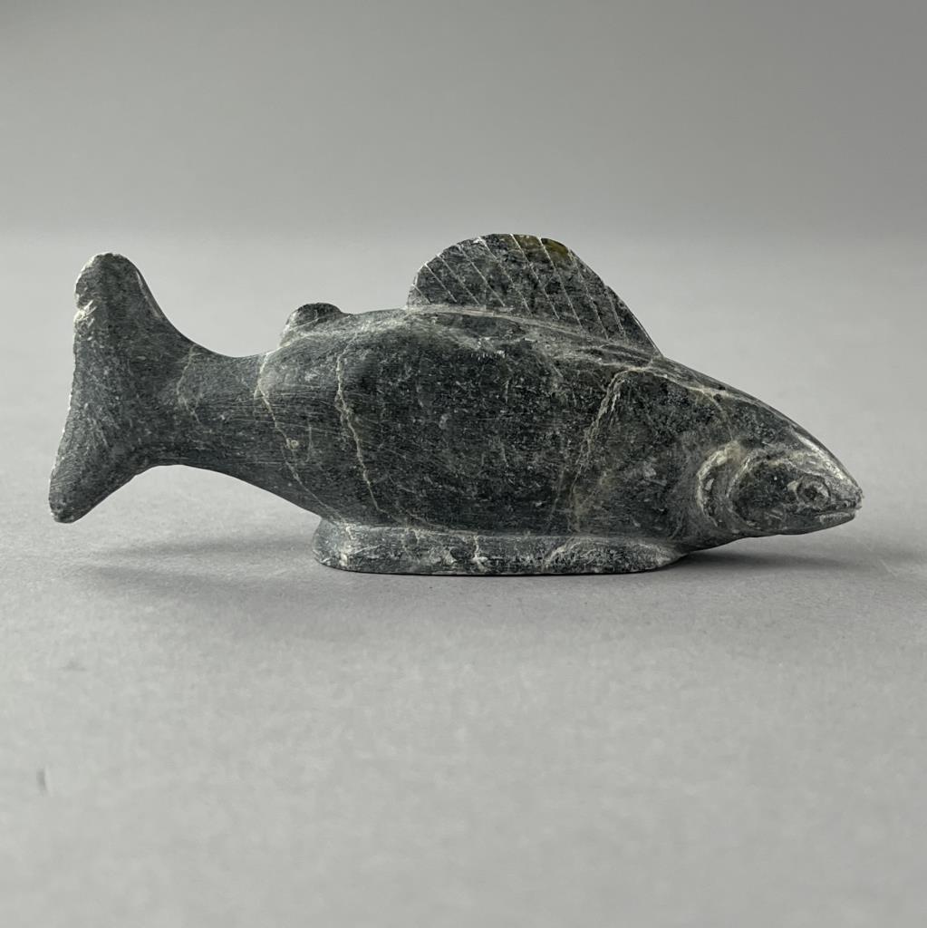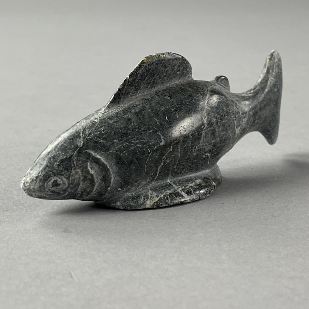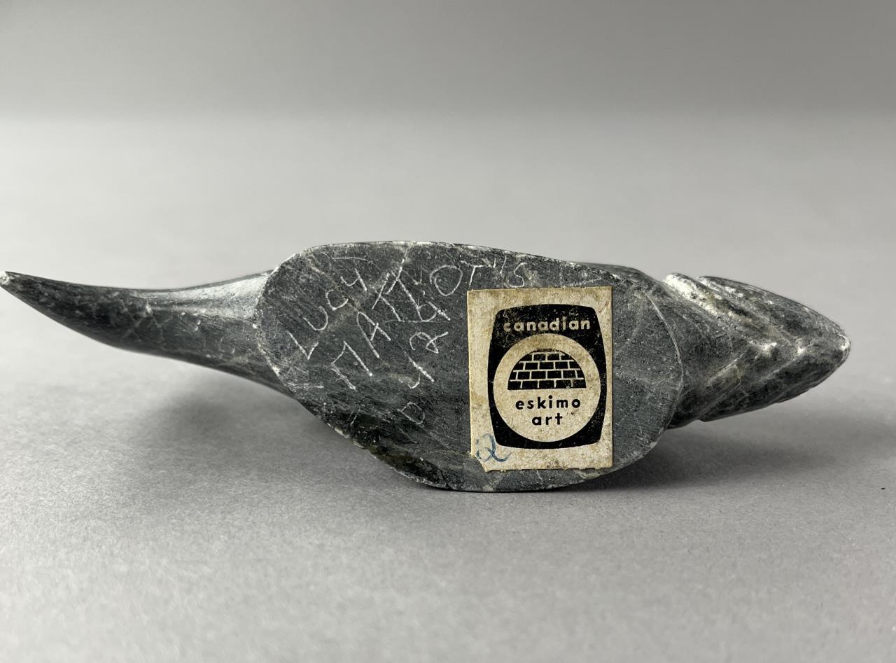 Inuit soapstone (also know as steatite) sculpture, depicting a fish, most likely a salmon, possibly signed “Lucy Mattotus,” 20th Century, 4-11/16″ (L). Provenance: ex-private Okemos, Michigan, USA collection of Inuit and Canadian First Nations art. CONDITION: SHIPPING: In-House Shipping Available. Please read our Shipping Policies and Terms and Conditions