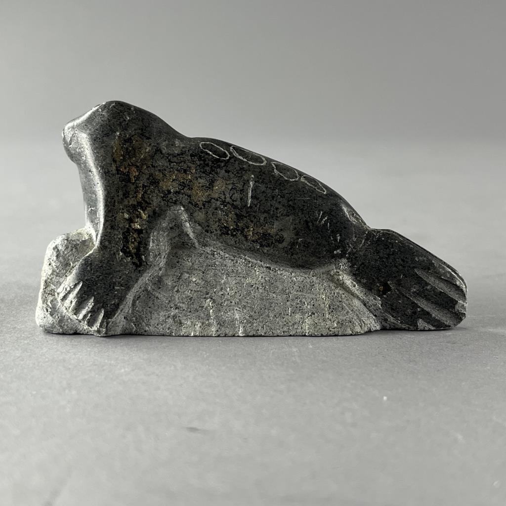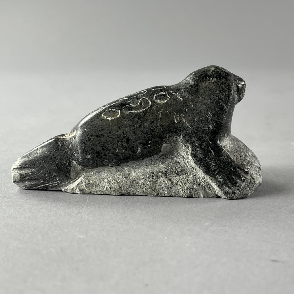 Inuit soapstone (also know as steatite) sculpture, depicting a seal, 20th Century, 4-1/8″ (L). Provenance: ex-private Okemos, Michigan, USA collection of Inuit and Canadian First Nations art. CONDITION: SHIPPING: In-House Shipping Available. Please read our Shipping Policies and Terms and Conditions