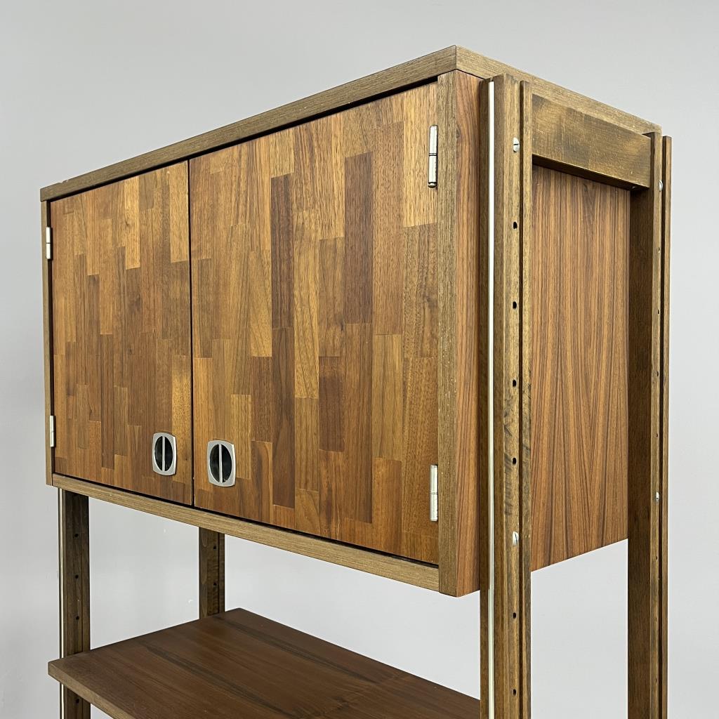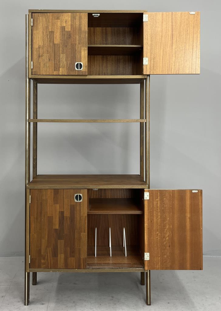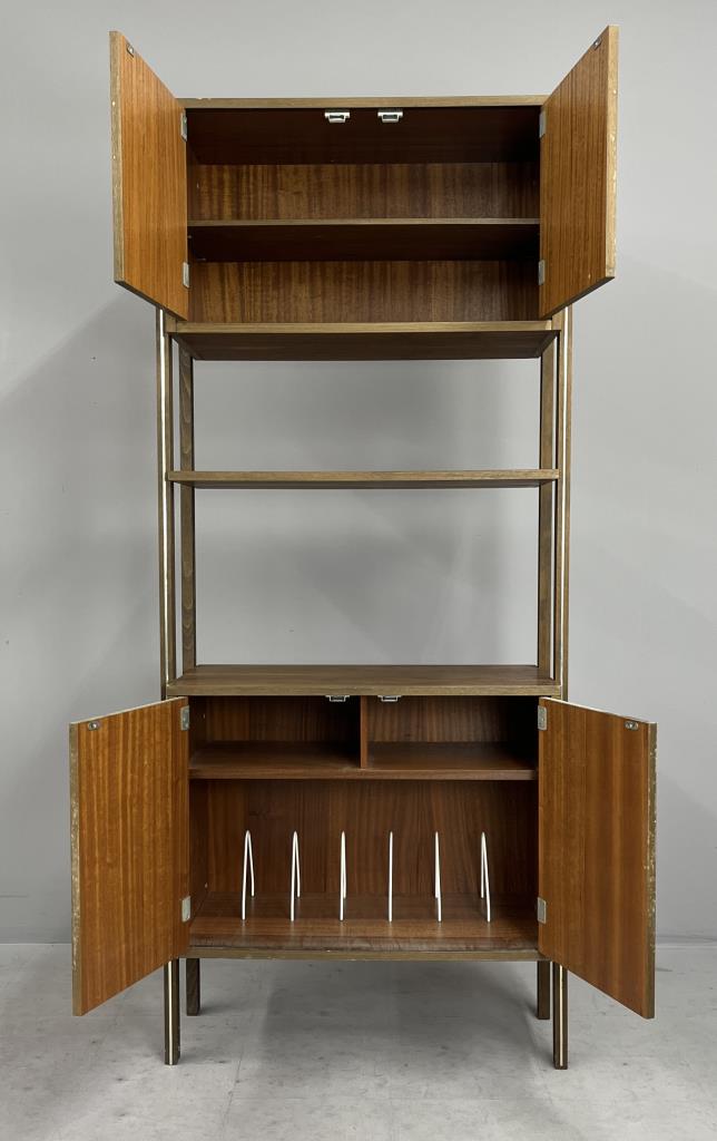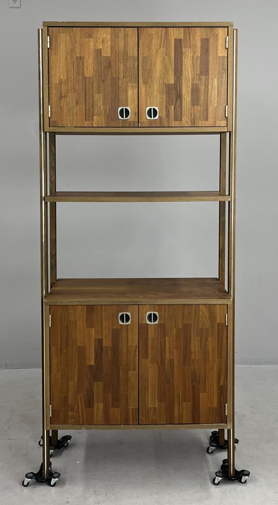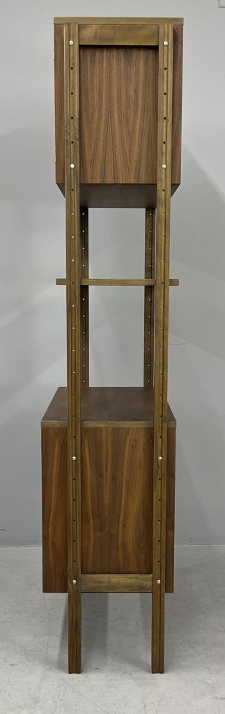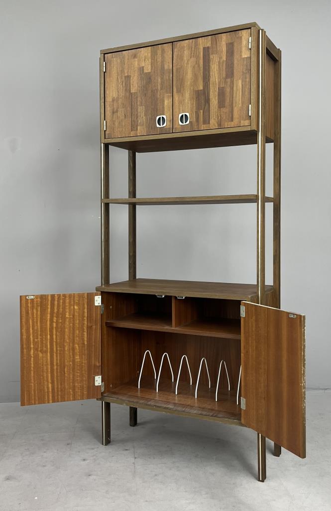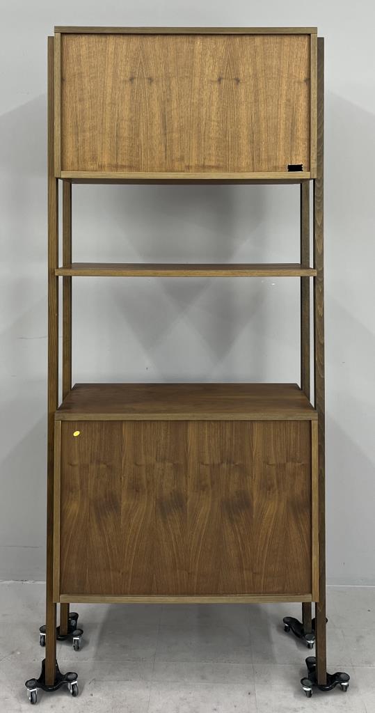 Danish Modern style modular stereo cabinet, or wall unit, with two doors, over two open shelves, over two doors, with wire dividers in bottom cabinet for LPs, circa 1960s / 1970s, “Made in Yugoslavia” paper label on back, approximately 32-1/16″ x 16″ x 74-3/4″. CONDITION: A small hole has been cut into the backside of the top cabinet, mostly likely to accommodate cords or cables. Some minor surface scratches to wood. One door pull is loose. One shelf support peg has been replaced and does not match the others. SHIPPING: Local pick-up or third party shipping only for this lot. Please see the Shipping Policy for information on suggested shippers. We recommend the Pak Mail Store of Battle Creek to assist you. Please contact the shipper of your choice for shipping estimates on this lot. Refer to the Shipping section in our full Terms and Conditions for all information on shipping.