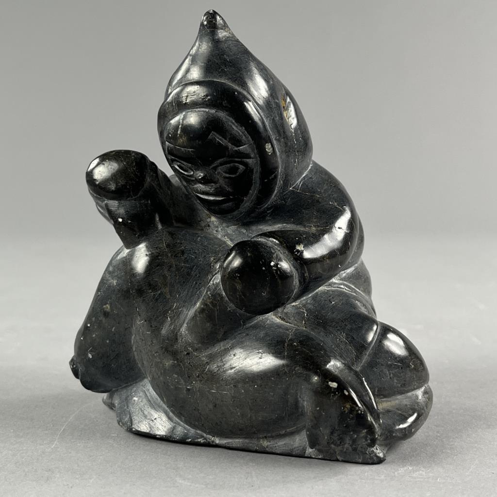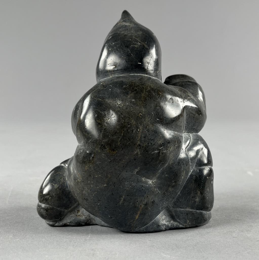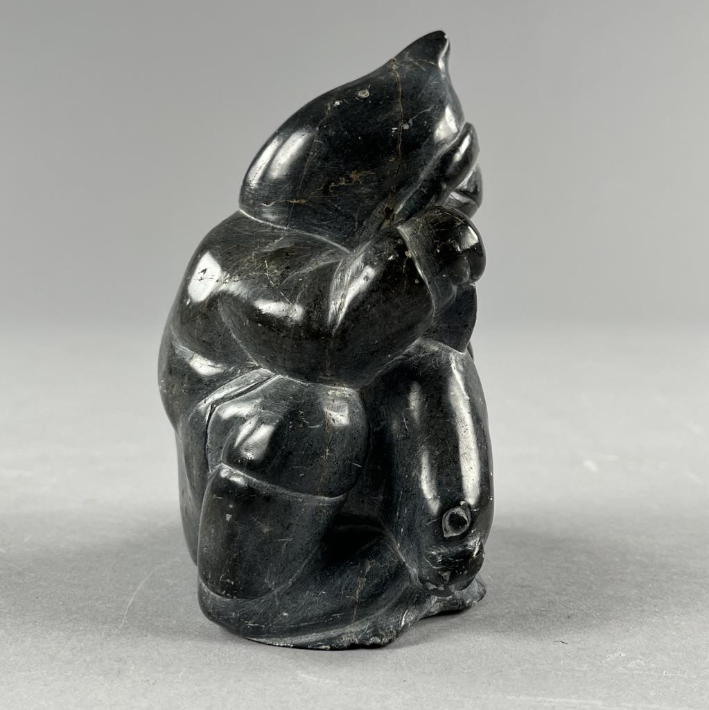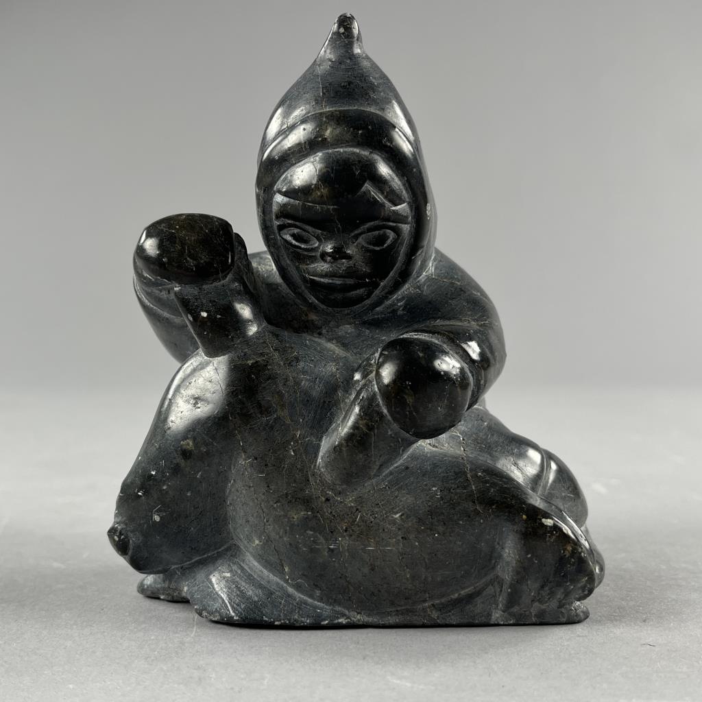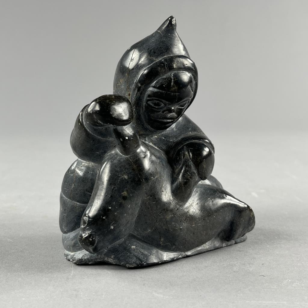 Inuit soapstone (also know as steatite) carving, depicting a hunter with a seal, signed on the bottom in Syllabics, 20th Century, approximately 4-3/4″ (H). Provenance: ex-private Okemos, Michigan, USA collection of Inuit and Canadian First Nations art. CONDITION: SHIPPING: In-House Shipping Available. Please read our Shipping Policies and Terms and Conditions
