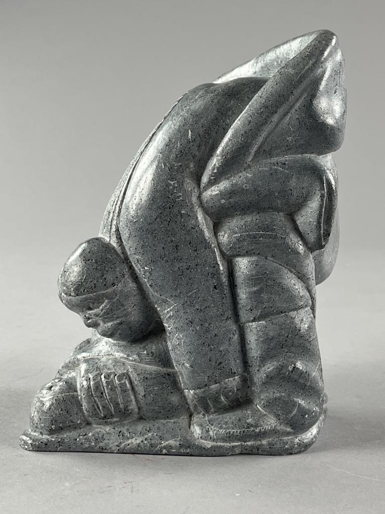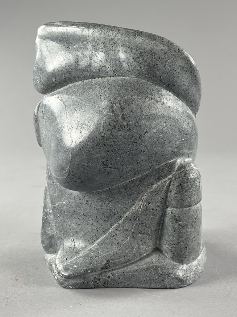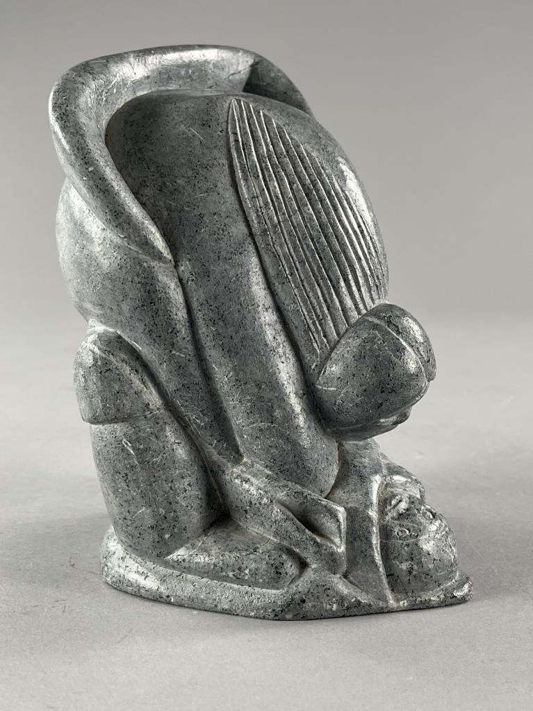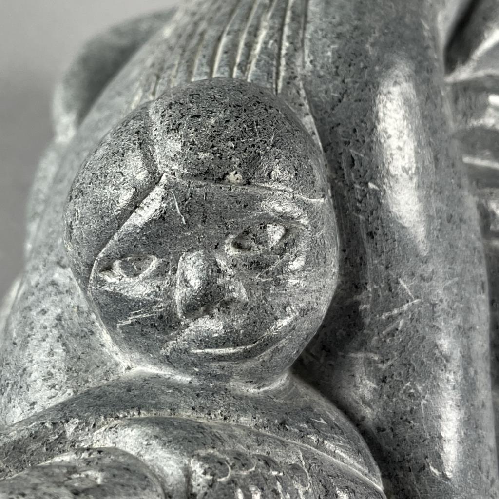 Inuit soapstone (also know as steatite) carving, depicting a mother and baby, attributed to the Pangnirtung/Pannirtuq carver Silasie Nakashuk (Inuk, b. 1969), signed on bottom “Silasie,” late 20th Century, approximately 7-1/2″ (H). Provenance: ex-private Okemos, Michigan, USA collection of Inuit and Canadian First Nations art. CONDITION: SHIPPING: In-House Shipping Available. Please read our Shipping Policies and Terms and Conditions