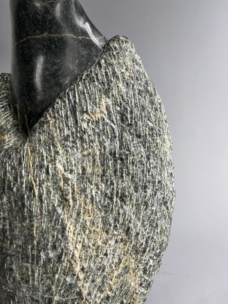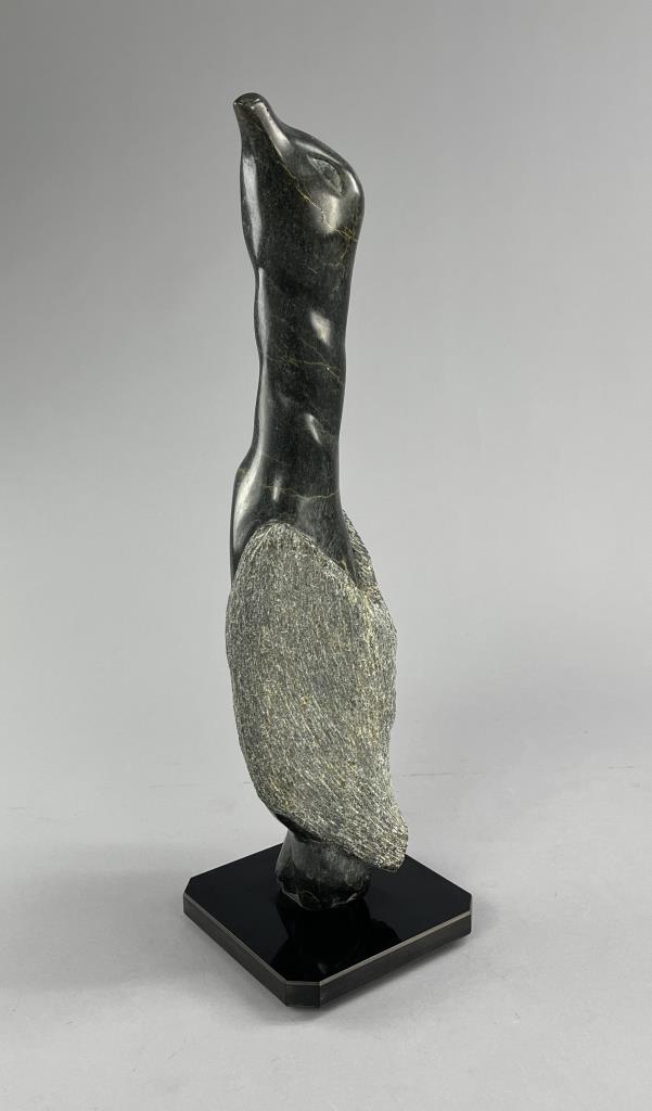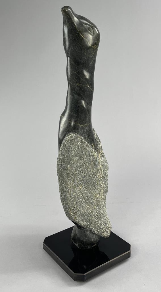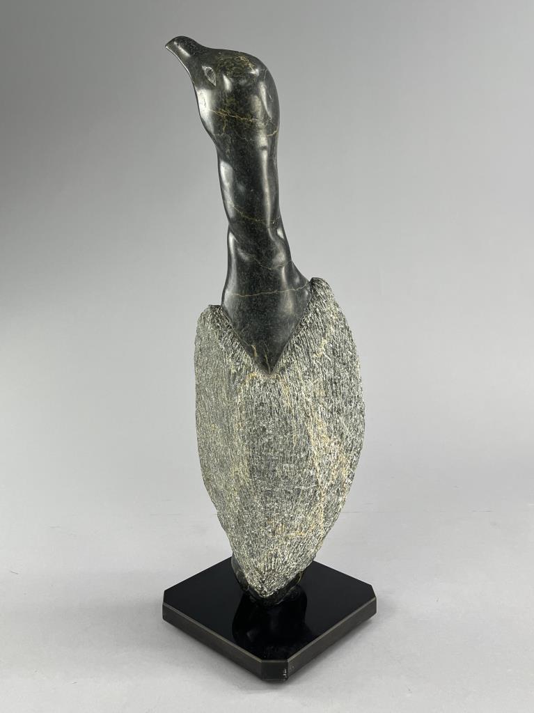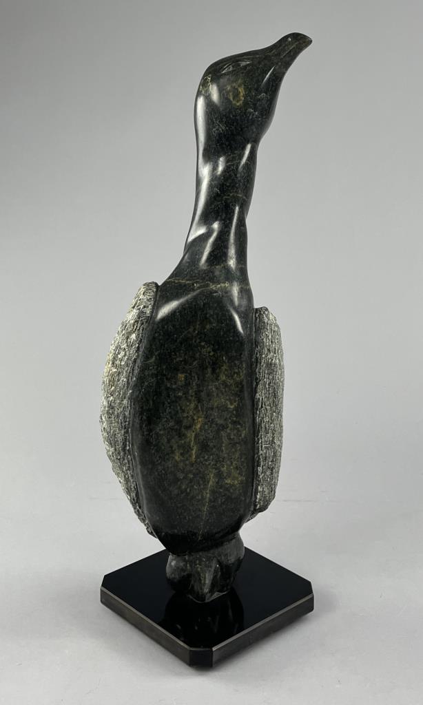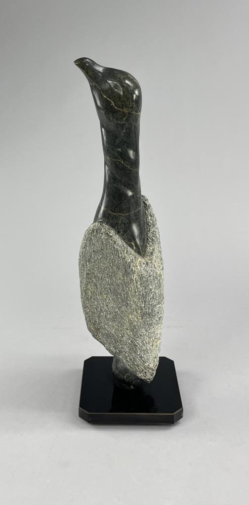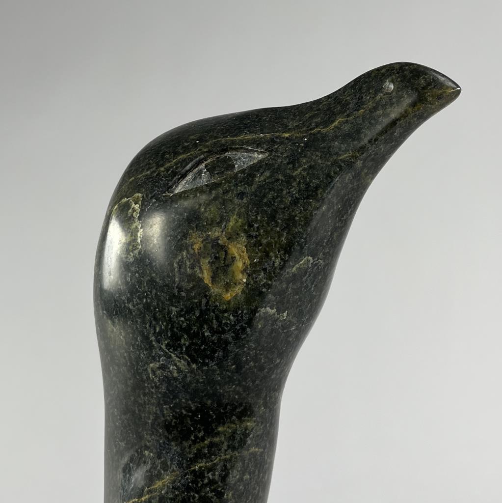 Inuit soapstone (also know as steatite) carving, depicting a standing bird, by the Cape Dorset/Kinngait carver Pingwartuk Ottokie (Inuk, b. 1948), circa early 1980s, 23-3/4″ (H). Includes original paperwork. Provenance: ex-private Okemos, Michigan, USA collection of Inuit and Canadian First Nations art; Canadian Guild of Crafts Quebec, Montreal, Canada, 4/1983. CONDITION: SHIPPING: Local pick-up or third party shipping only for this lot. Please see the Shipping Policy for information on suggested shippers. We recommend the Pak Mail Store of Battle Creek to assist you. Please contact the shipper of your choice for shipping estimates on this lot. Refer to the Shipping section in our full Terms and Conditions for all information on shipping.