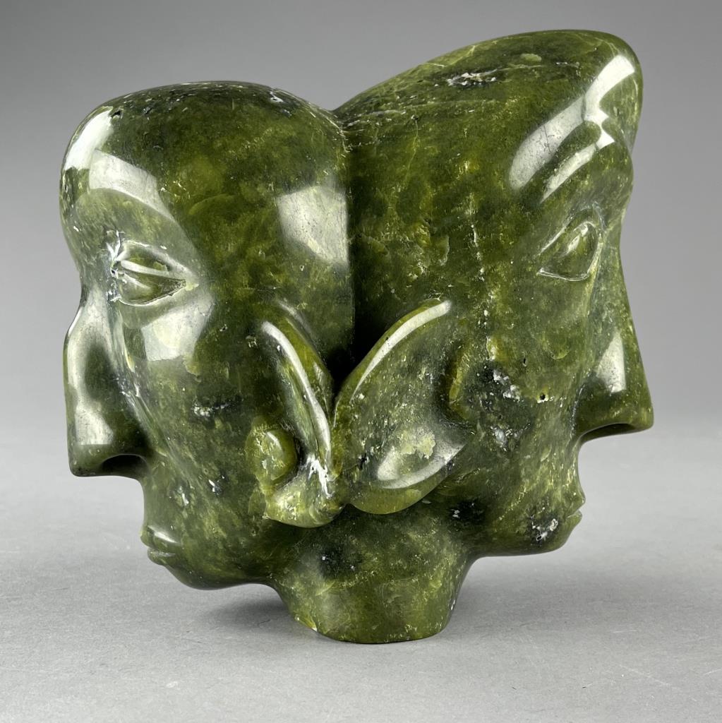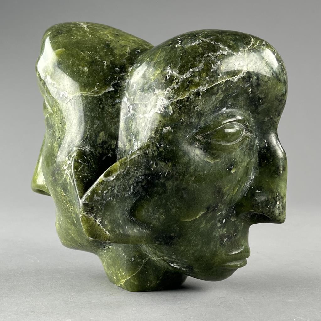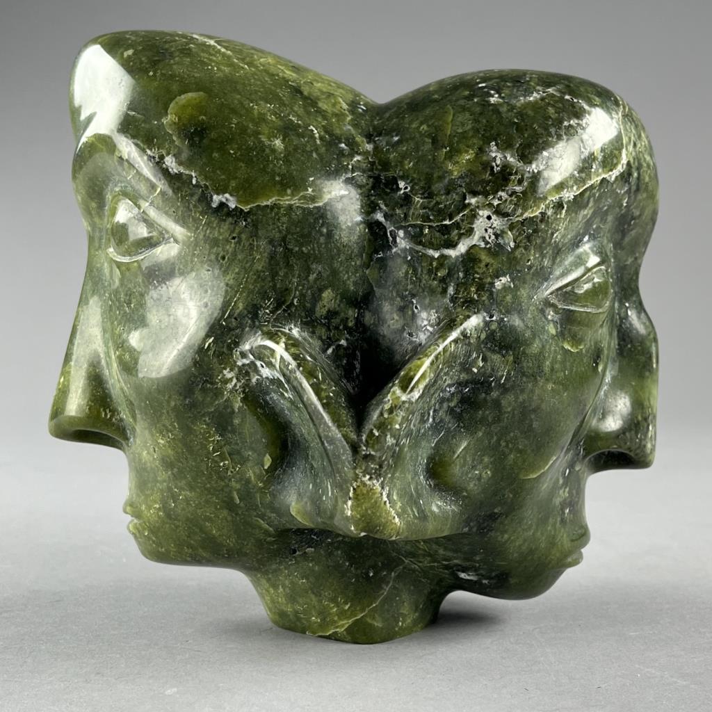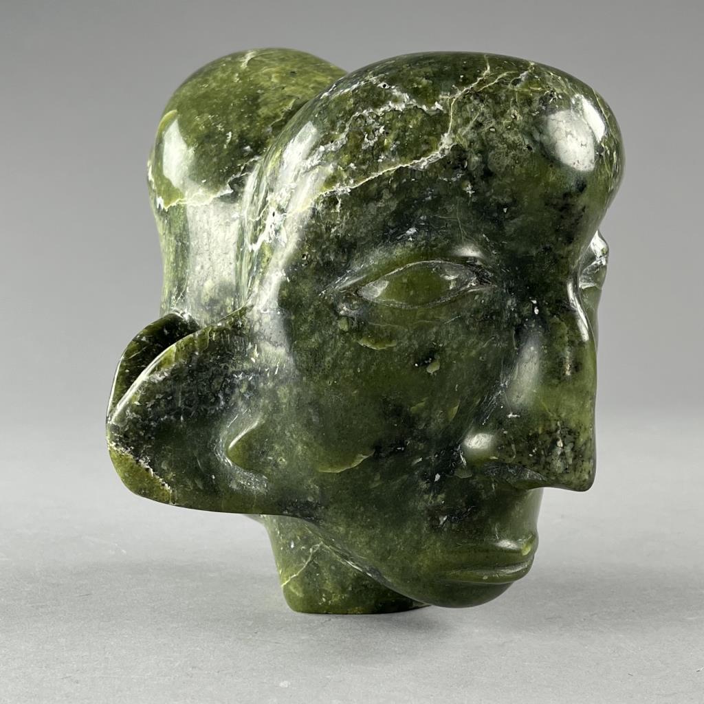 Inuit serpentine bust carving, depicting two back-to-back connected heads, etched signature in Syllabics on underside, partially covered by a gallery label, approximately 7″ (H). Provenance: ex-private Okemos, Michigan, USA collection of Inuit and Canadian First Nations art. CONDITION: SHIPPING: In-House Shipping Available. Please read our Shipping Policies and Terms and Conditions
