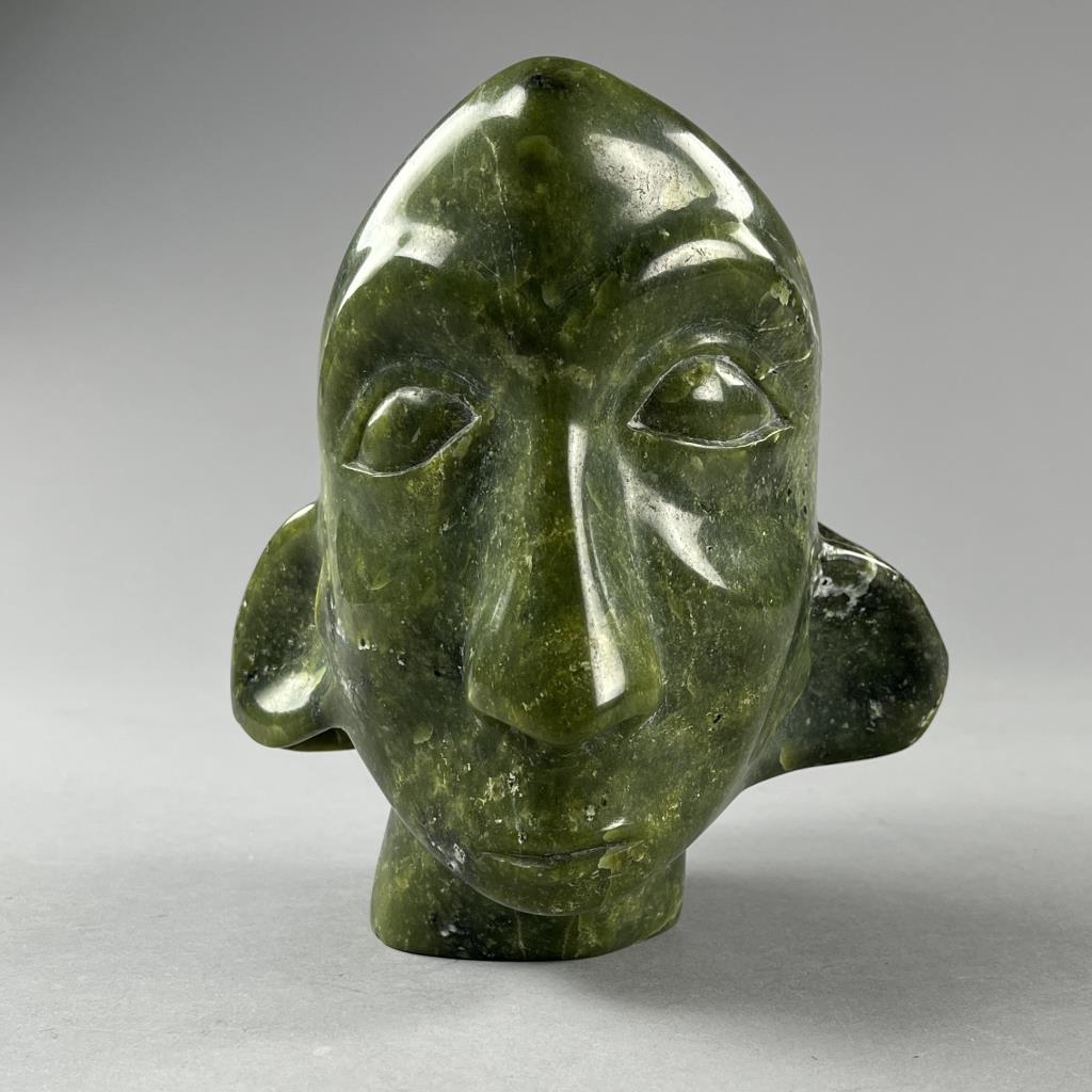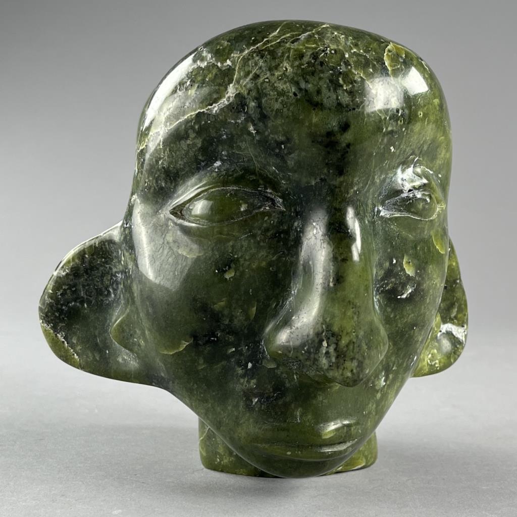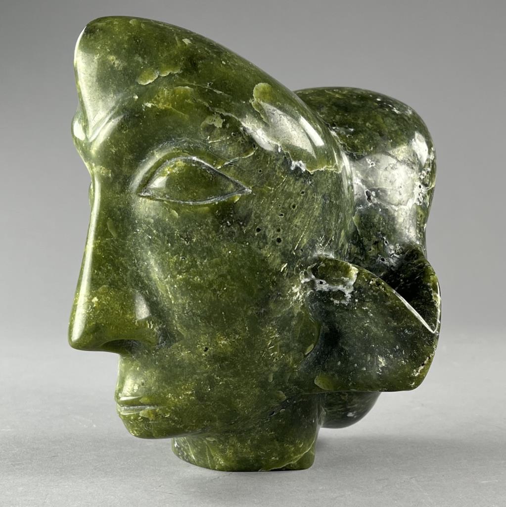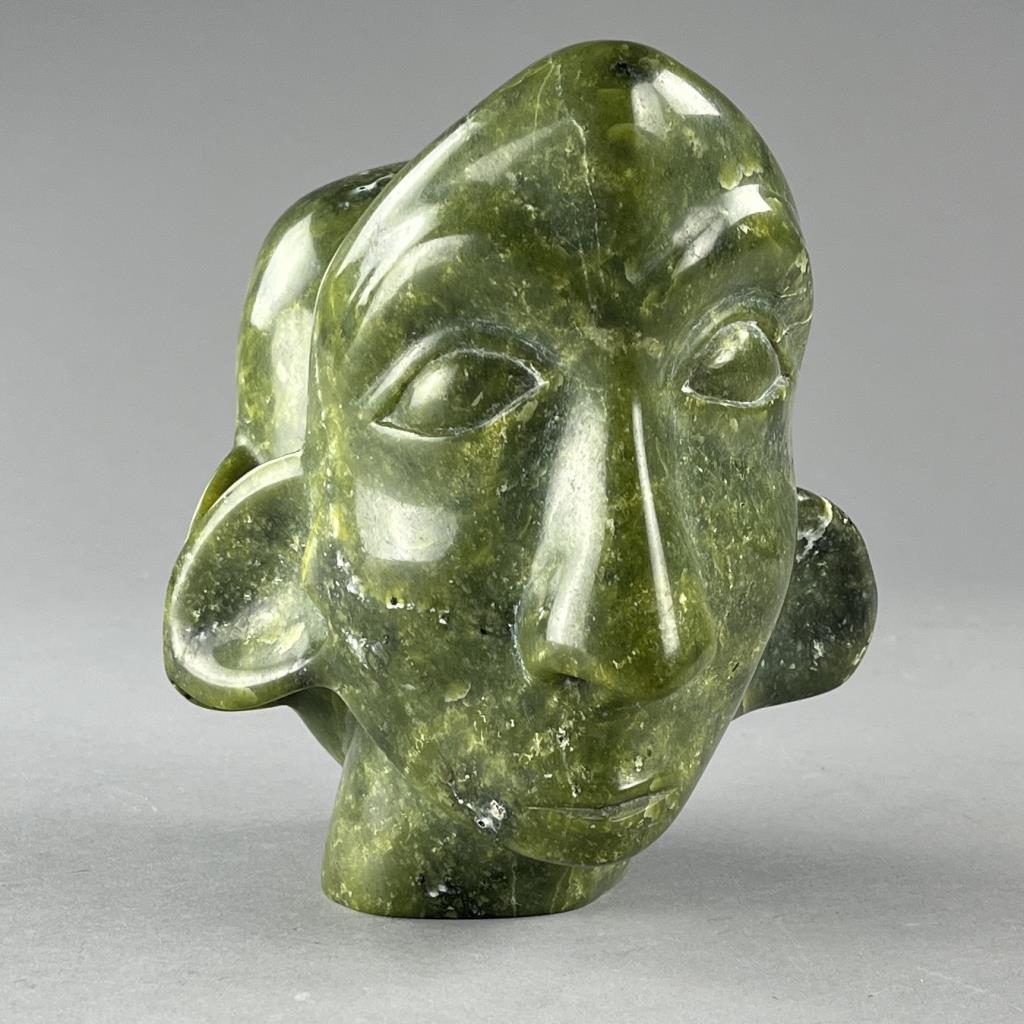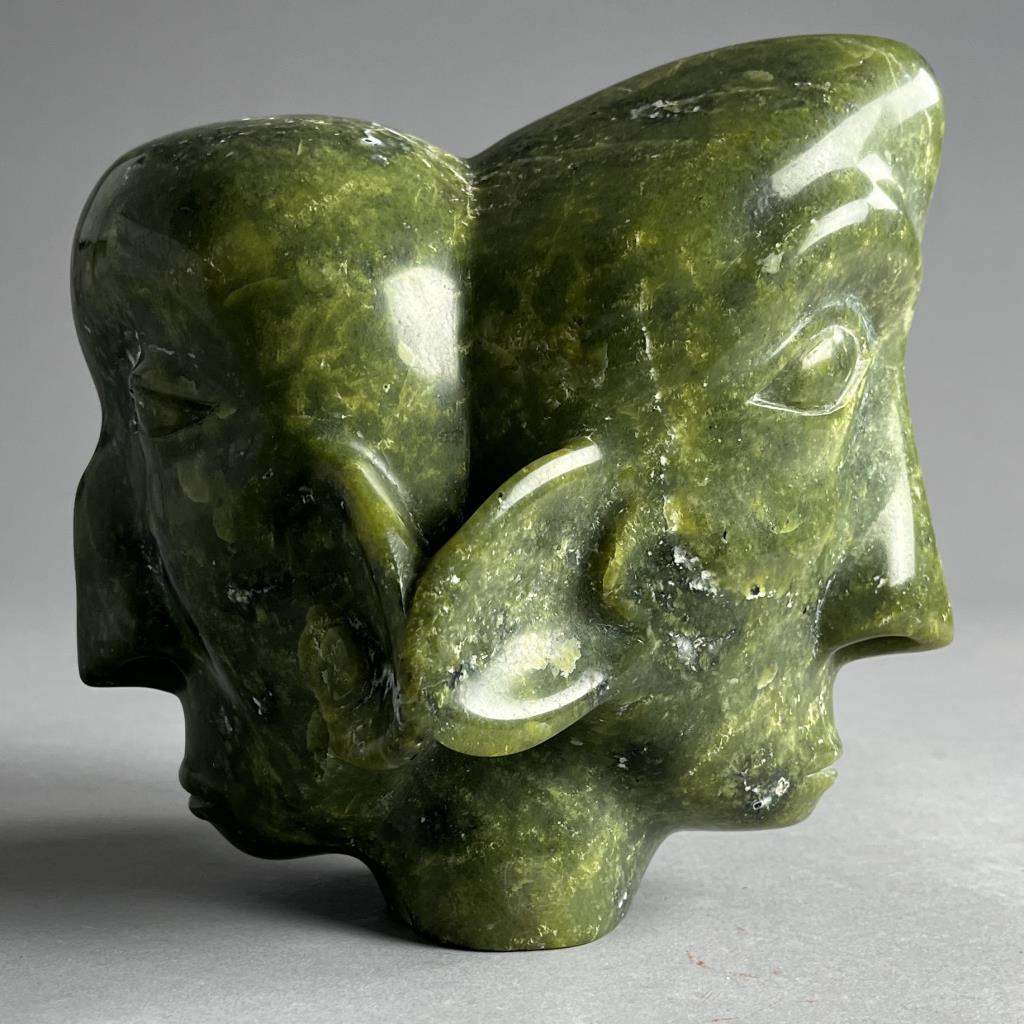Inuit serpentine bust carving, depicting two back-to-back connected heads, etched signature in Syllabics on underside, partially covered by a gallery label, approximately 7″ (H). Provenance: ex-private Okemos, Michigan, USA collection of Inuit and Canadian First Nations art. CONDITION: SHIPPING: In-House Shipping Available. Please read our Shipping Policies and Terms and Conditions