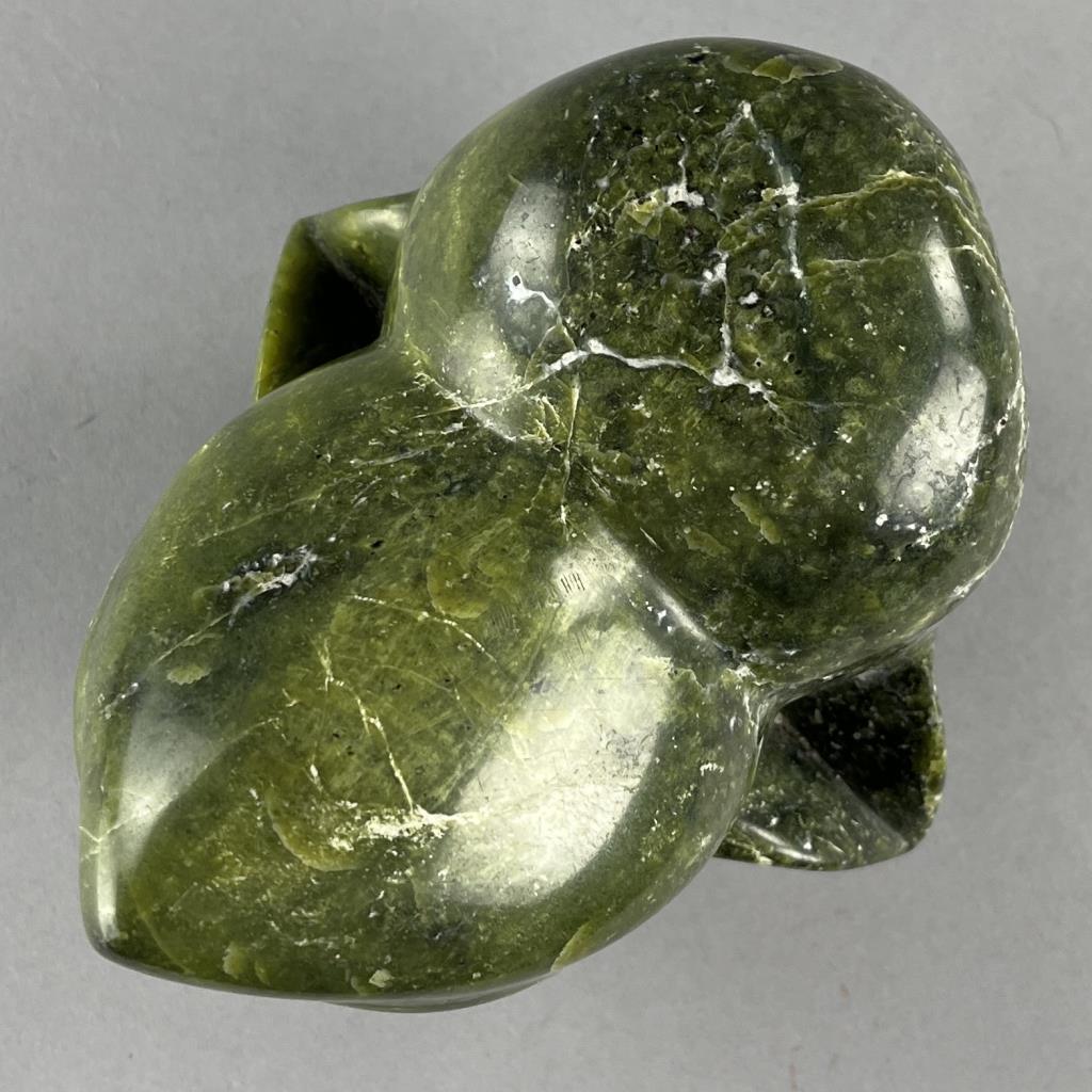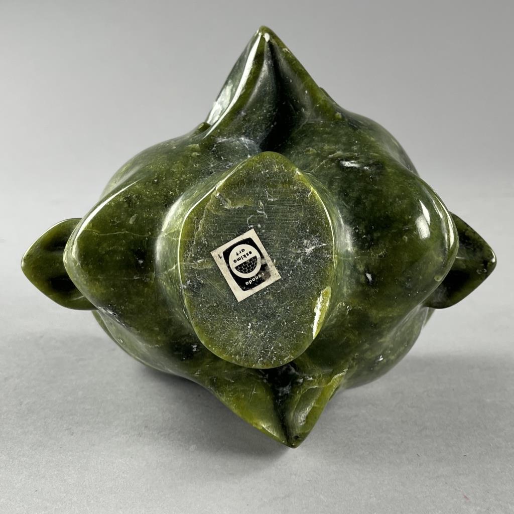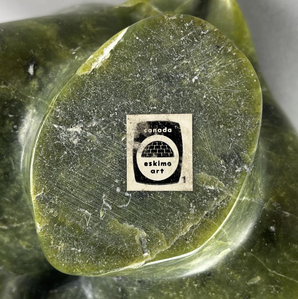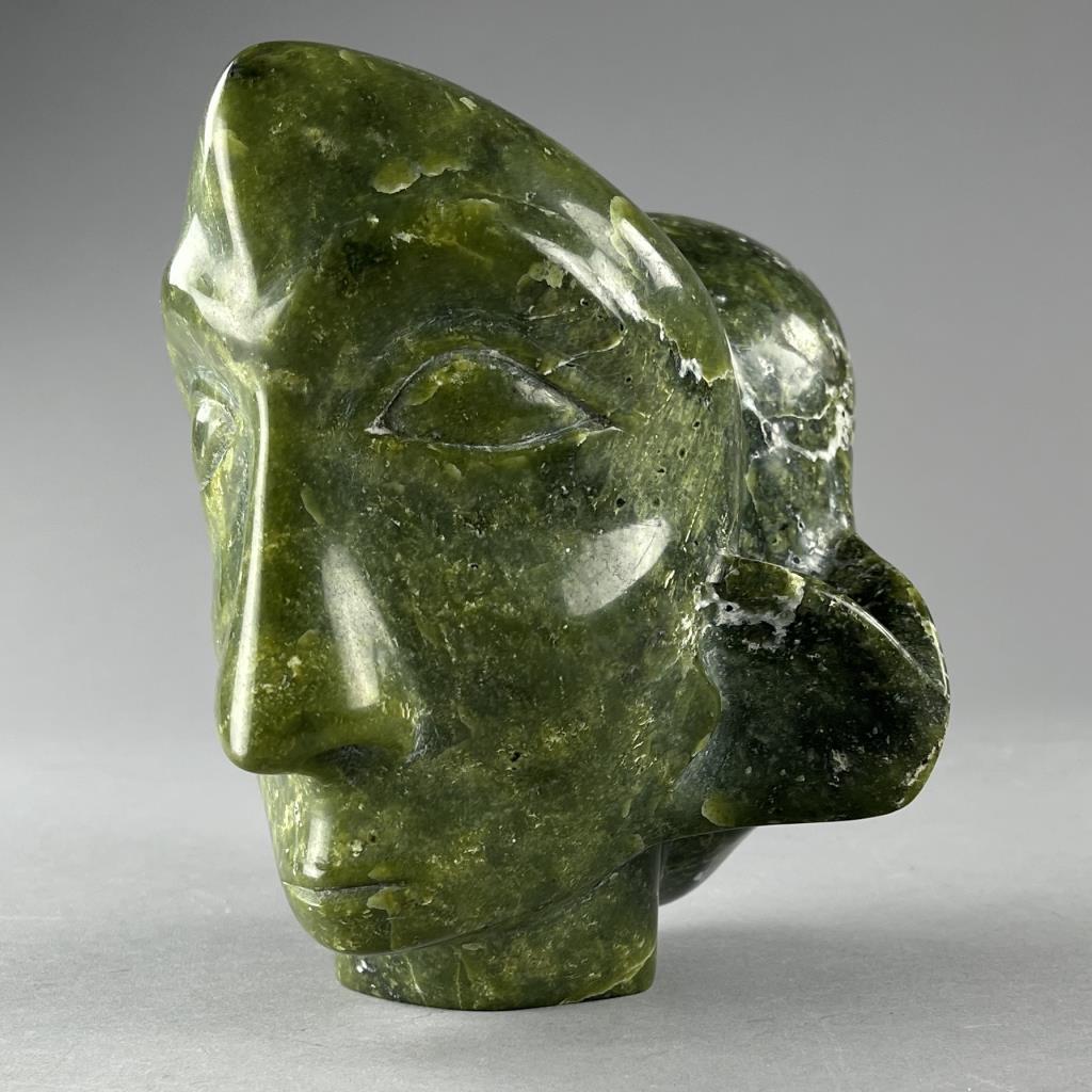 Inuit serpentine bust carving, depicting two back-to-back connected heads, etched signature in Syllabics on underside, partially covered by a gallery label, approximately 7″ (H). Provenance: ex-private Okemos, Michigan, USA collection of Inuit and Canadian First Nations art. CONDITION: SHIPPING: In-House Shipping Available. Please read our Shipping Policies and Terms and Conditions