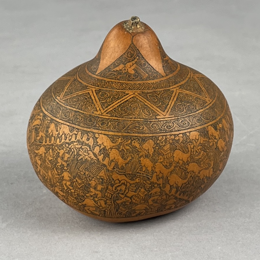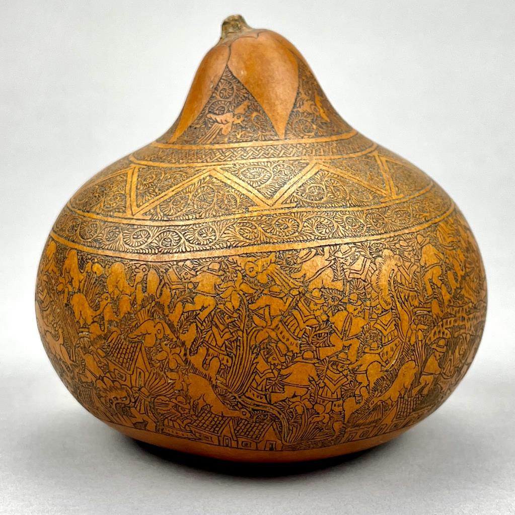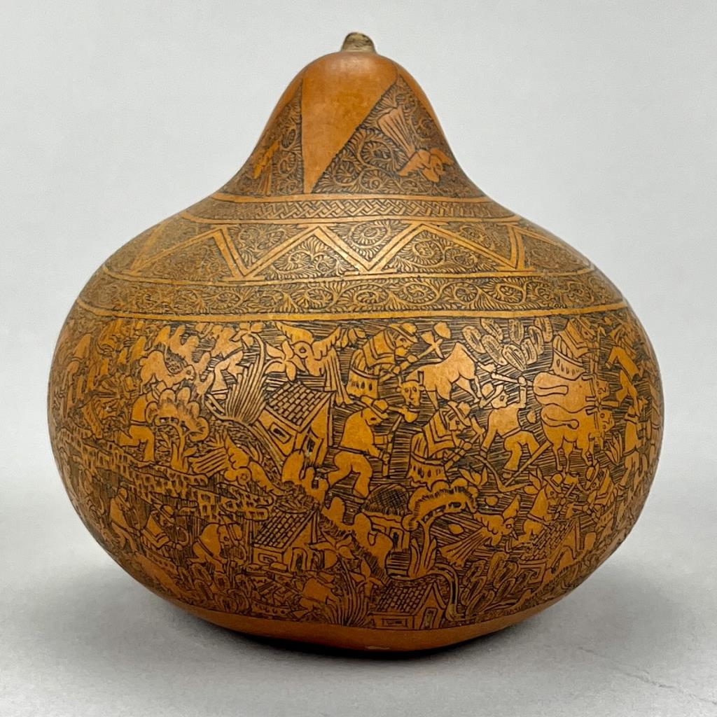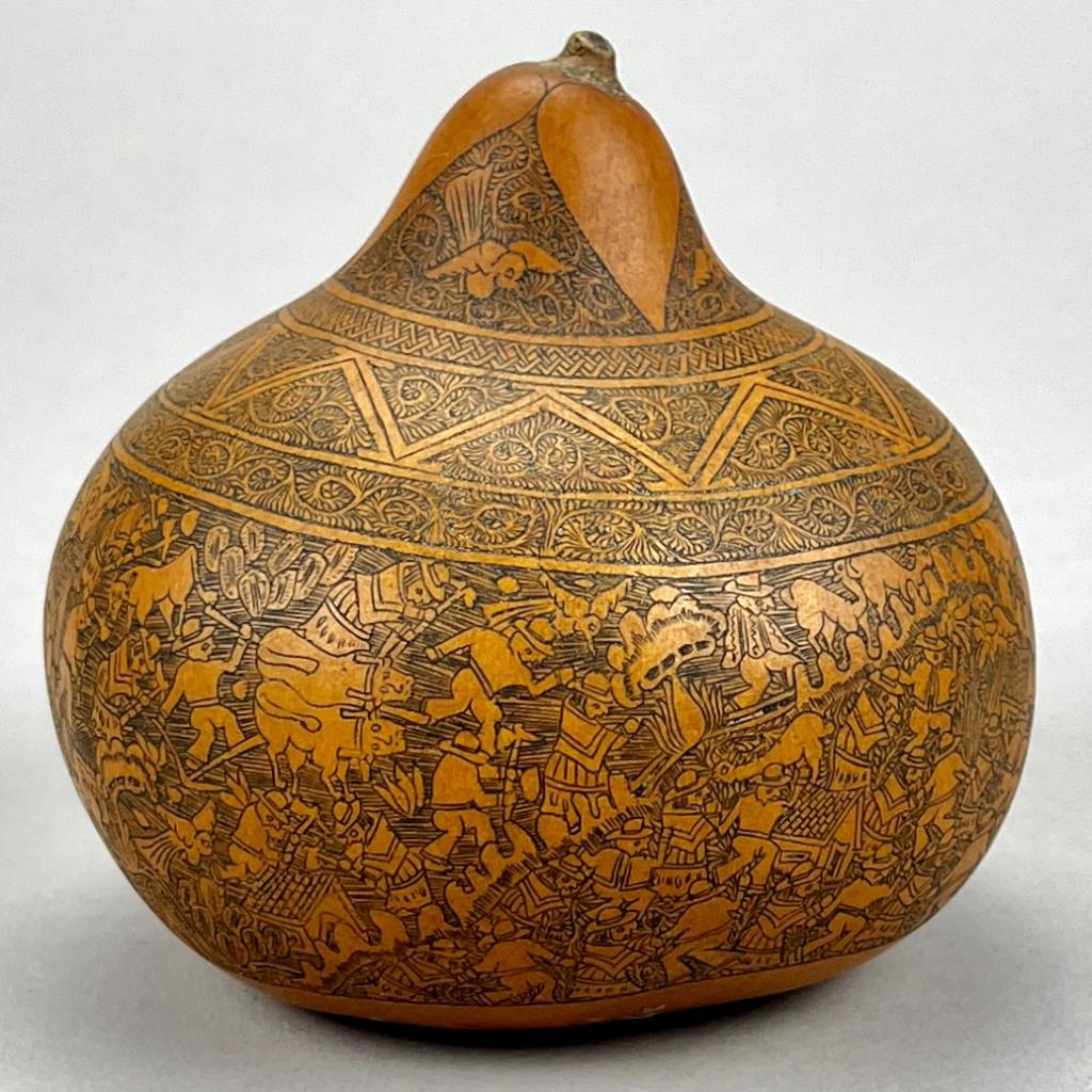 Mates Burilados, intricately carved gourd, traditional Peruvian folk art, which tells the stories of Peruvian culture, daily life, folklore, or myths, approximately 4″ (D) x 3-3/4″ (H). CONDITION: Remnants of an adhesive label on bottom. SHIPPING: In-House Shipping Available. Please read our Shipping Policies and Terms and Conditions