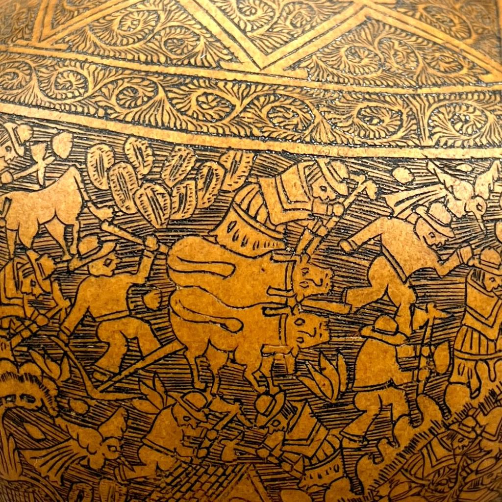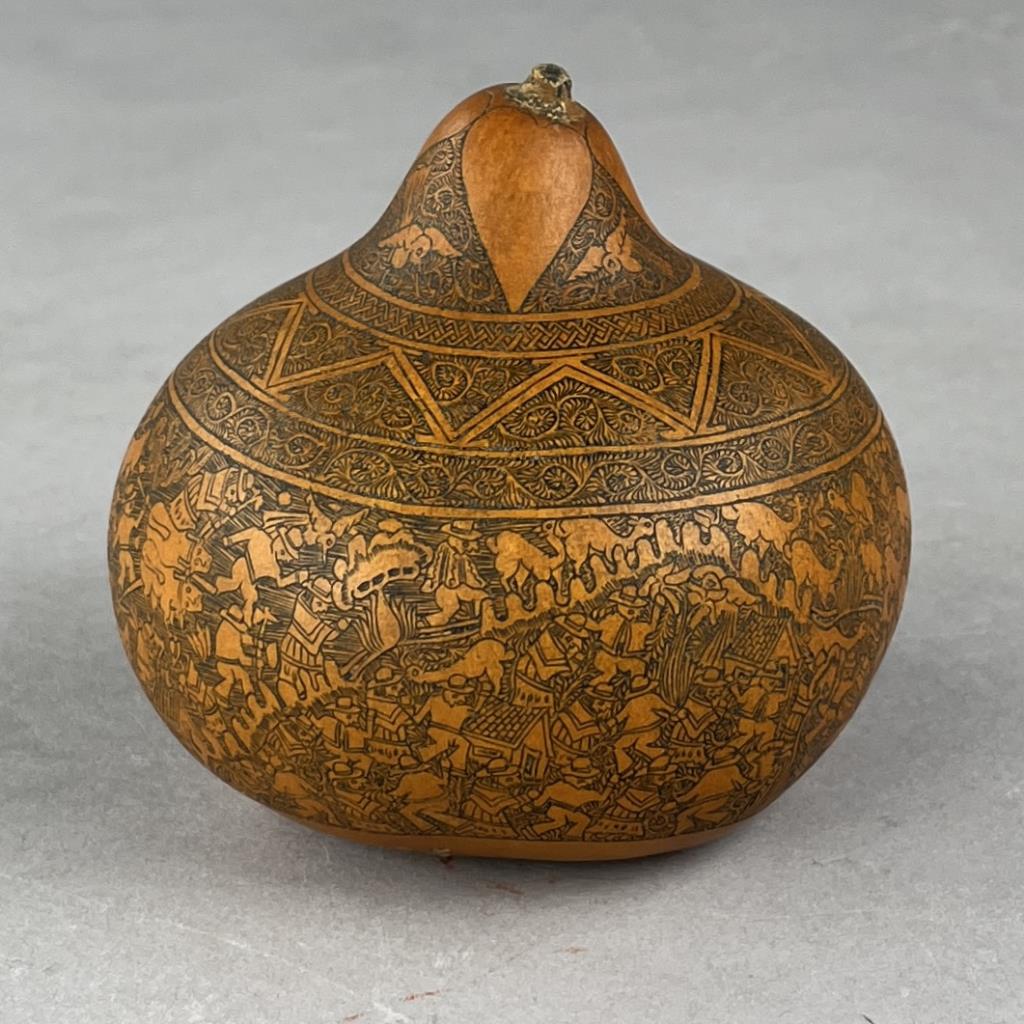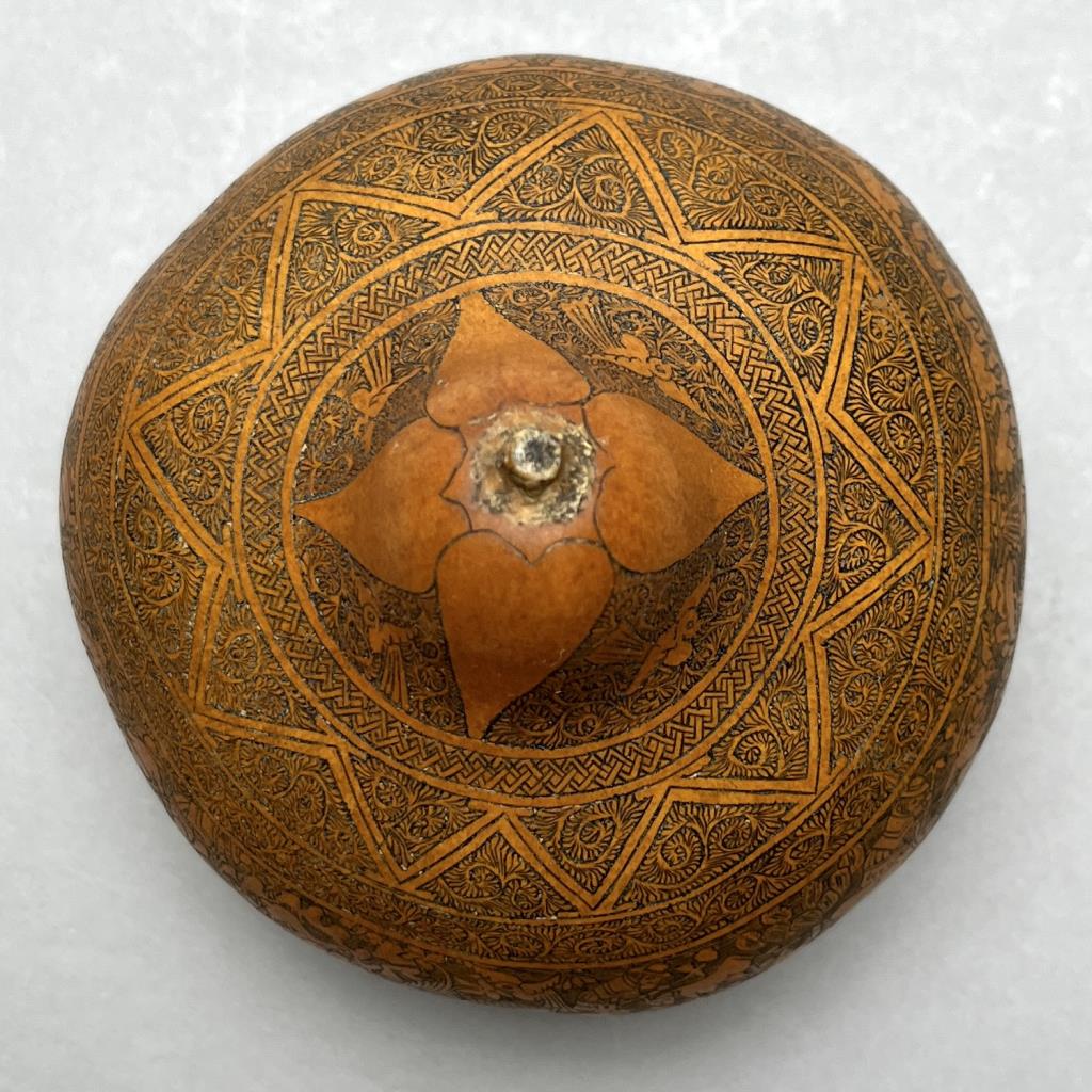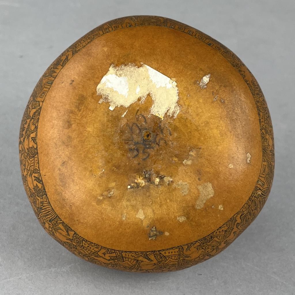 Mates Burilados, intricately carved gourd, traditional Peruvian folk art, which tells the stories of Peruvian culture, daily life, folklore, or myths, approximately 4″ (D) x 3-3/4″ (H). CONDITION: Remnants of an adhesive label on bottom. SHIPPING: In-House Shipping Available. Please read our Shipping Policies and Terms and Conditions