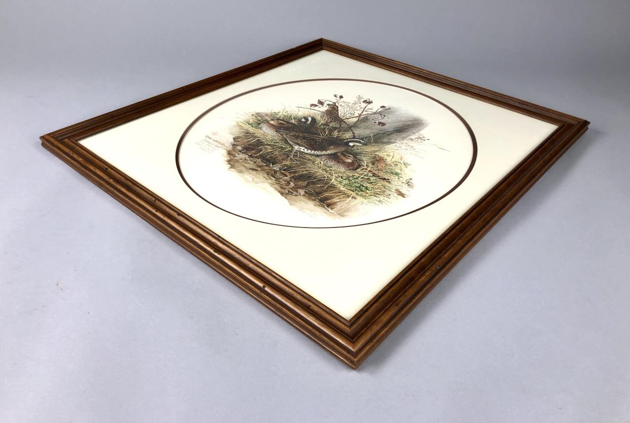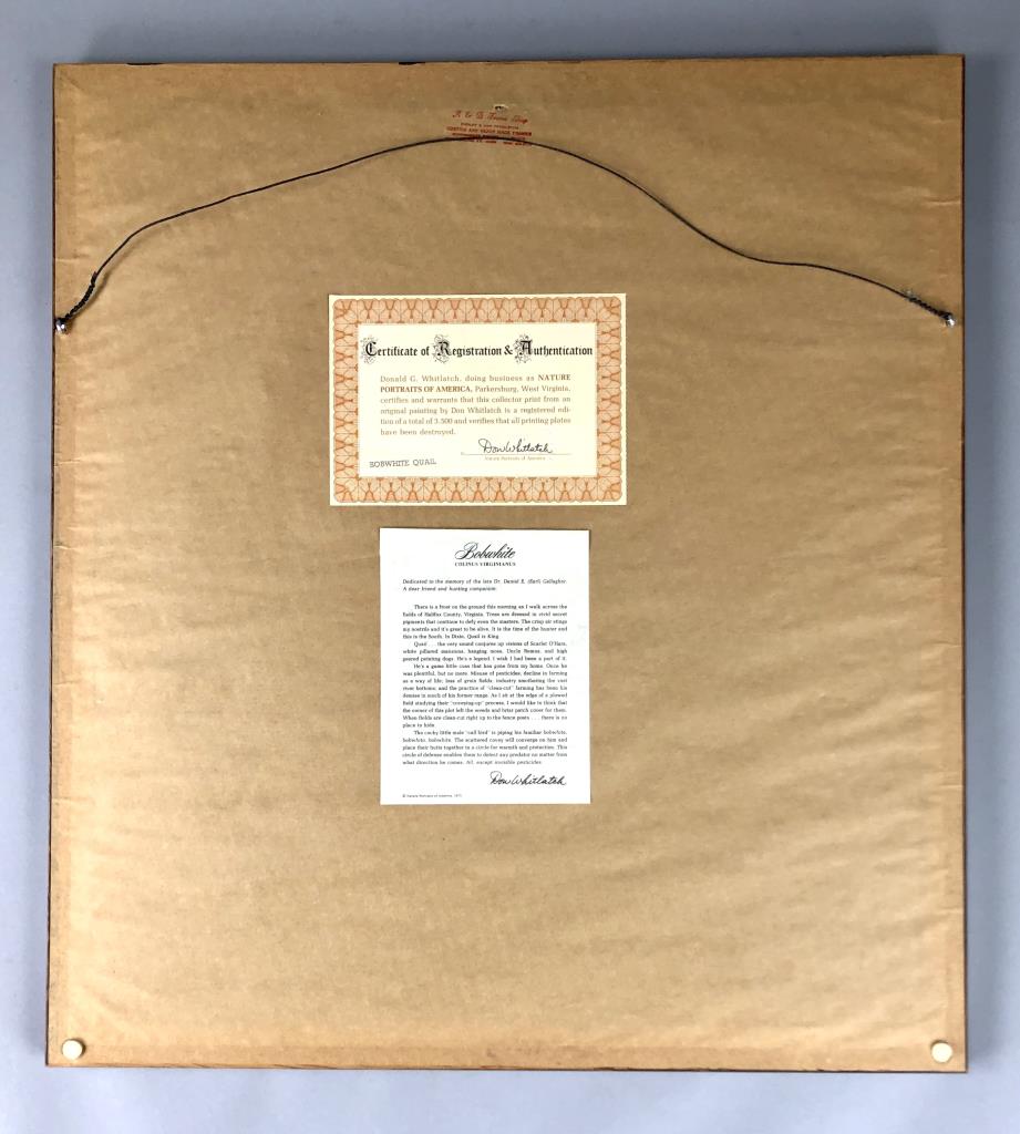 Framed ornithological collector print, titled “Bobwhite Quail,” by Donald “Don” Jean Whitlock (American, 1931 – 2017), offset printed and limited to an edition of 3,500, signed lower right in pencil by the artist, certificate of registration and authentication on back, in a wood frame measuring 26-1/2″ x 24-1/16″. CONDITION: SHIPPING: Local pick-up or third party shipping only for this lot. Please see the Shipping Policy for information on suggested shippers. We recommend the Pak Mail Store of Battle Creek to assist you. Please contact the shipper of your choice for shipping estimates on this lot. Refer to the Shipping section in our full Terms and Conditions for all information on shipping.