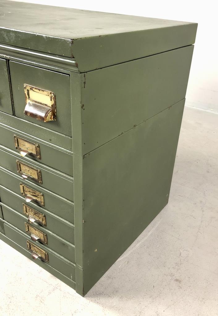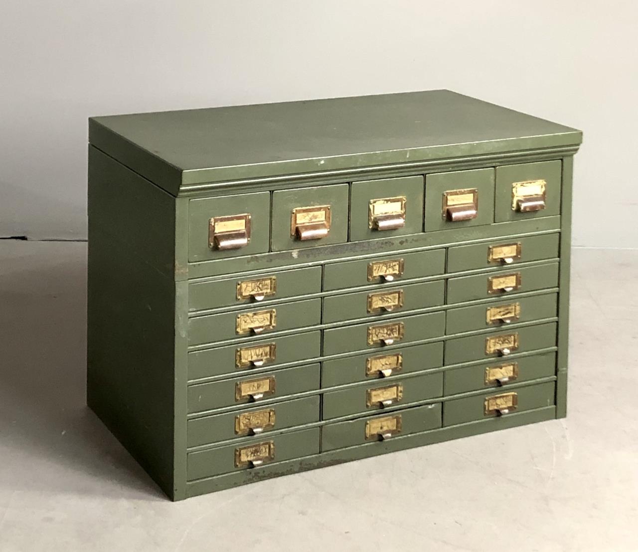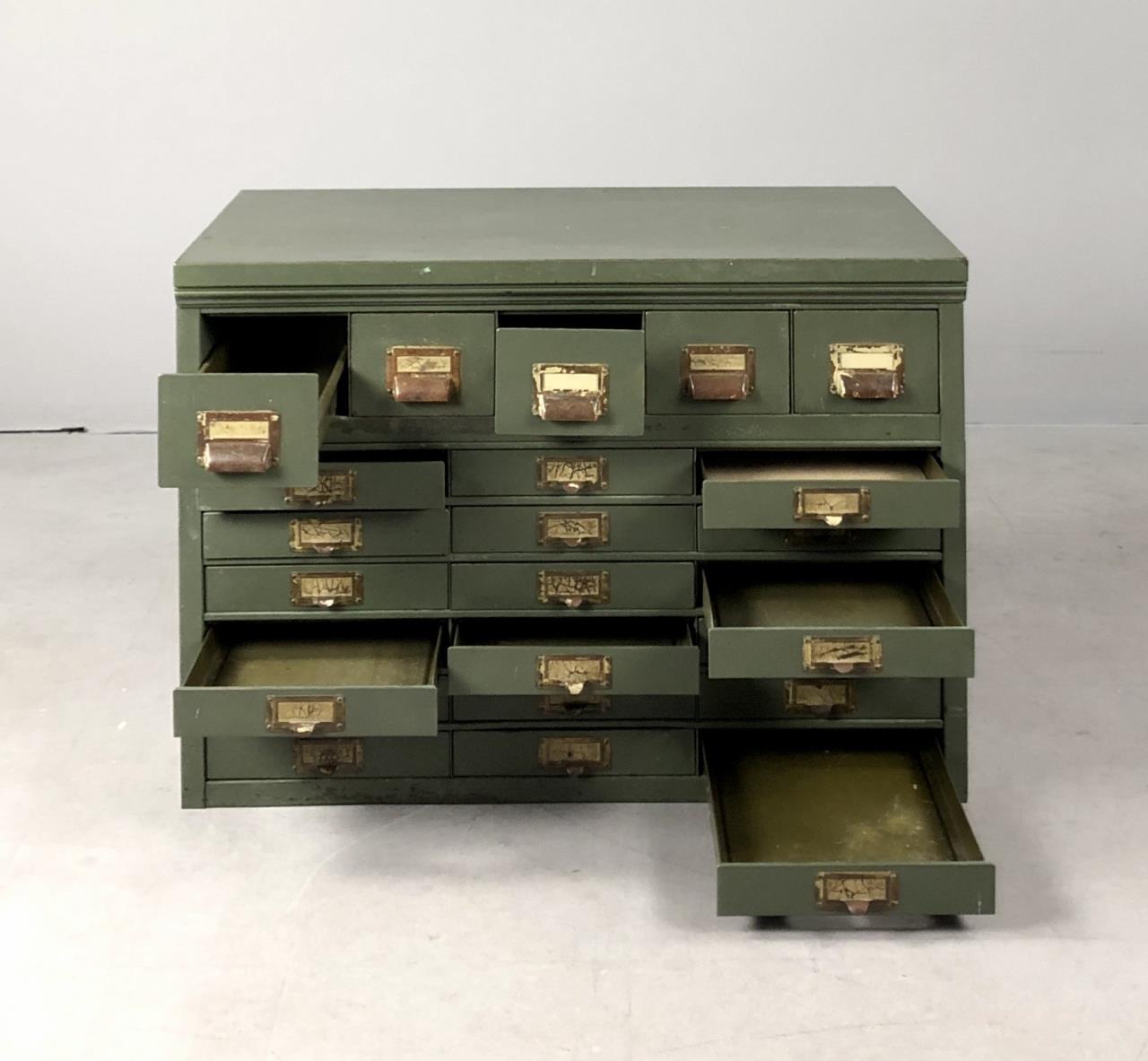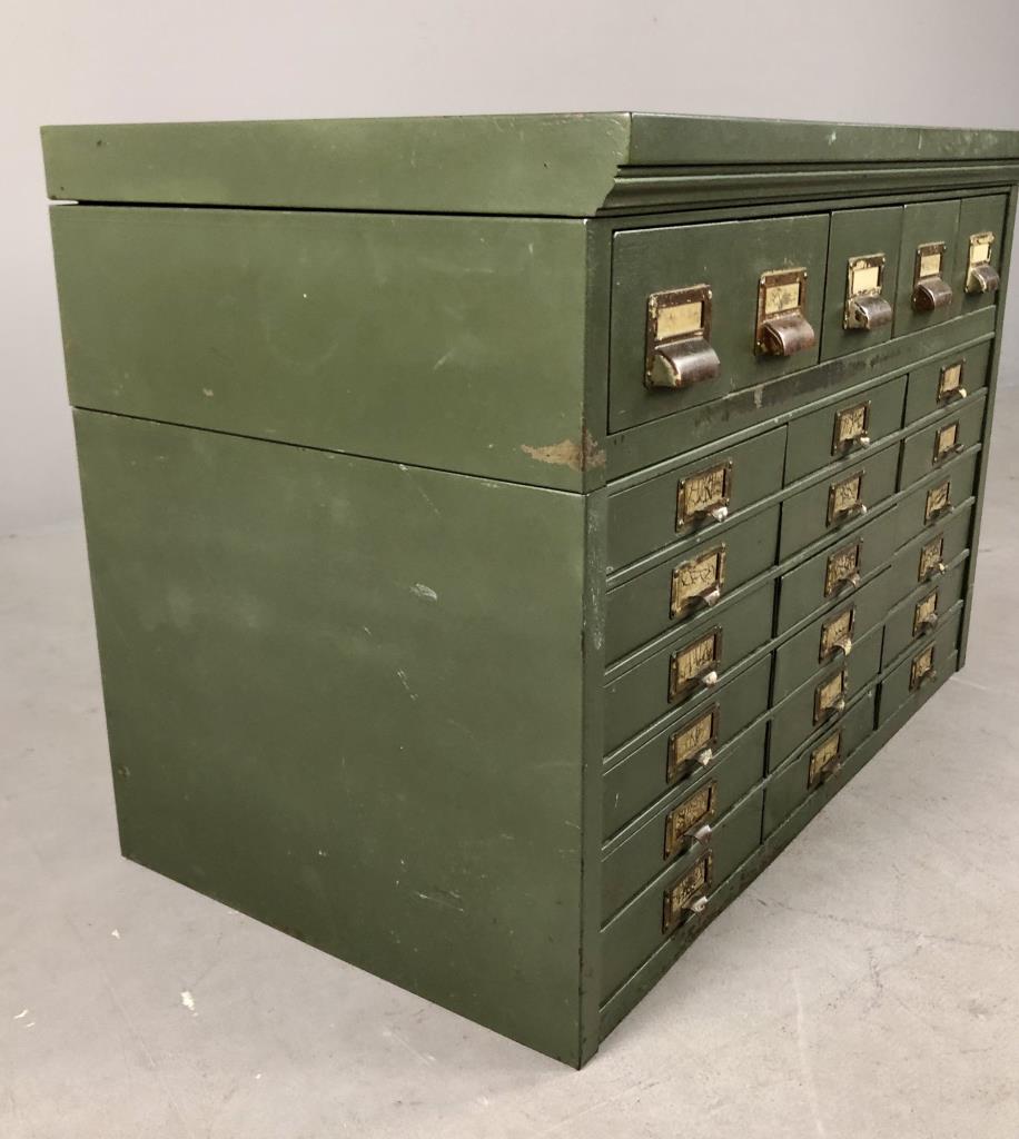 Art Metal Construction Company (Jamestown, New York), 23 drawer modular industrial metal cabinet, circa early to mid 20th Century, partial paper label on interior, 32-3/4″ x 18-7/8″ x 23″. CONDITION: Some scratching and wear to painted surface commensurate with age and use, one drawer is stuck close. SHIPPING: Local pick-up or third party shipping only for this lot. Please see the Shipping Policy for information on suggested shippers. We recommend the Pak Mail Store of Battle Creek to assist you. Please contact the shipper of your choice for shipping estimates on this lot. Refer to the Shipping section in our full Terms and Conditions for all information on shipping.