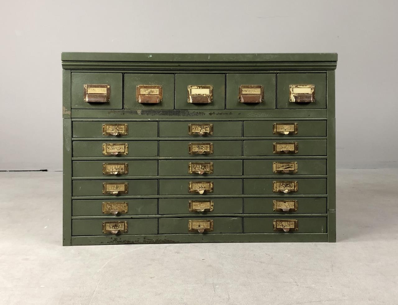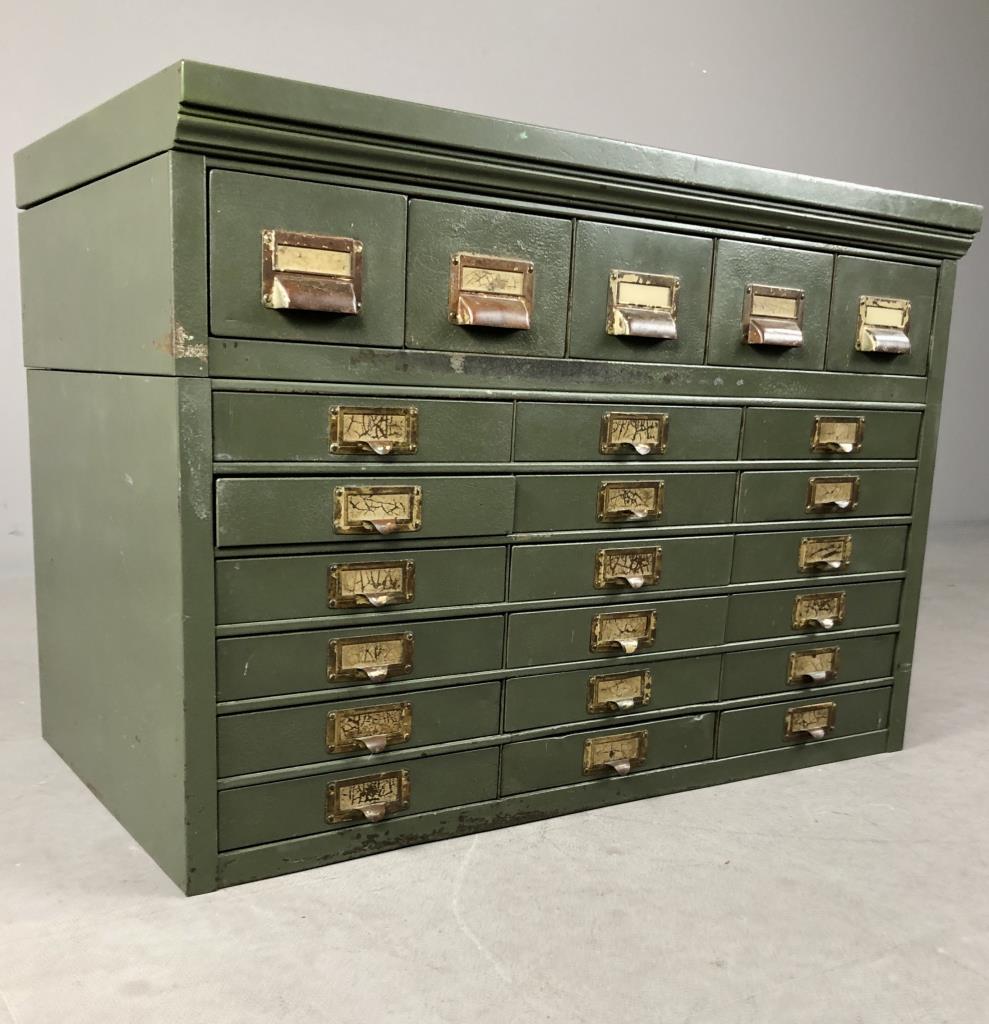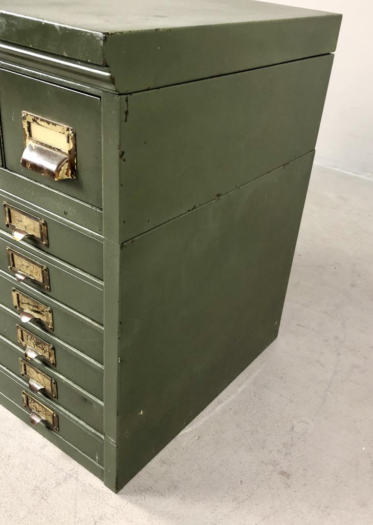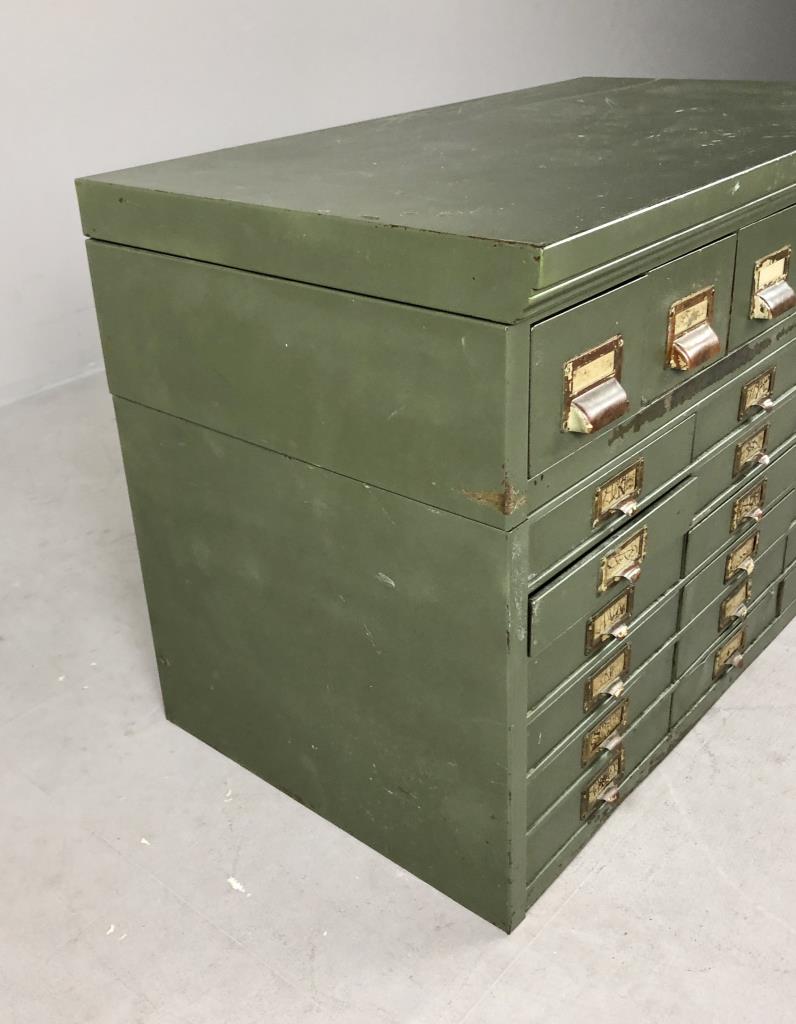 Art Metal Construction Company (Jamestown, New York), 23 drawer modular industrial metal cabinet, circa early to mid 20th Century, partial paper label on interior, 32-3/4″ x 18-7/8″ x 23″. CONDITION: Some scratching and wear to painted surface commensurate with age and use, one drawer is stuck close. SHIPPING: Local pick-up or third party shipping only for this lot. Please see the Shipping Policy for information on suggested shippers. We recommend the Pak Mail Store of Battle Creek to assist you. Please contact the shipper of your choice for shipping estimates on this lot. Refer to the Shipping section in our full Terms and Conditions for all information on shipping.