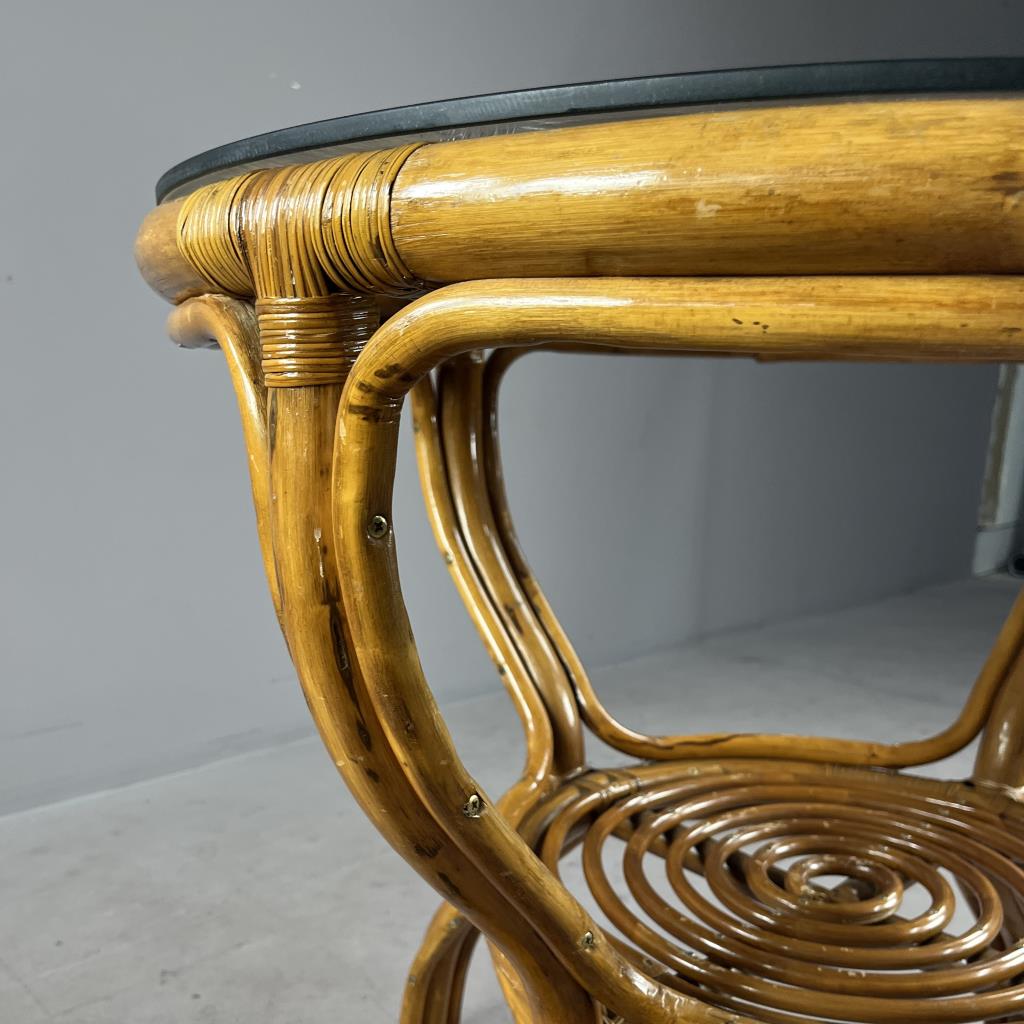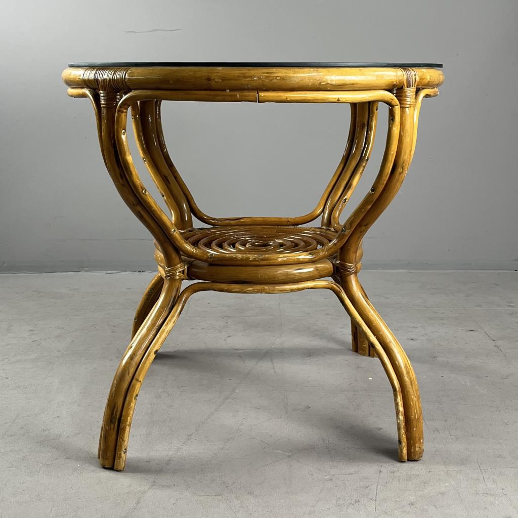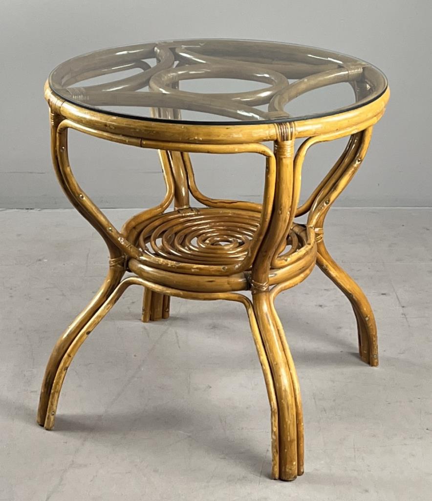 Round rattan and glass side table, or dining table, circa late 20th Century, 32-5/8″ (D) x 30-9/16″ (H). CONDITION: Some scratching and scuffing to wood, especially near base, minor split in one piece of non-structural rattan. SHIPPING: Local pick-up or third party shipping only for this lot. Please see the Shipping Policy for information on suggested shippers. We recommend the Pak Mail Store of Battle Creek to assist you. Please contact the shipper of your choice for shipping estimates on this lot. Refer to the Shipping section in our full Terms and Conditions for all information on shipping.