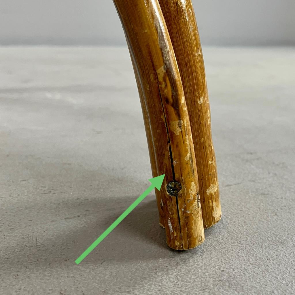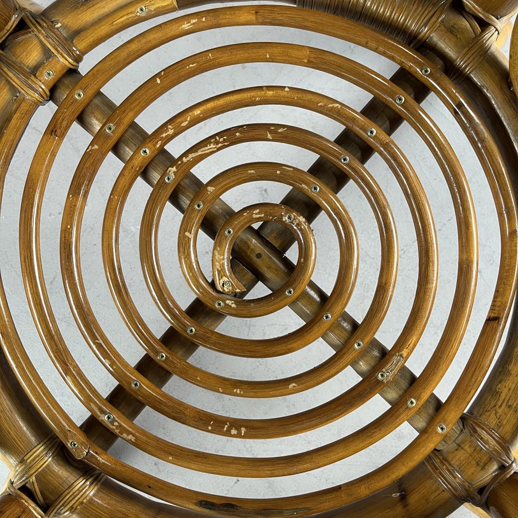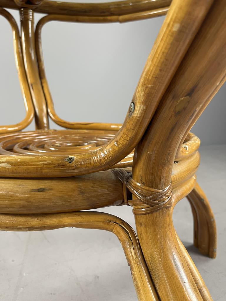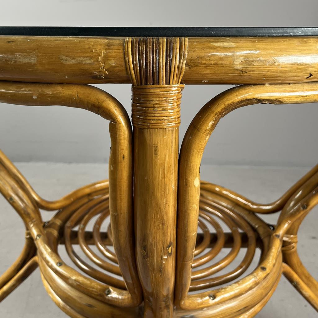 Round rattan and glass side table, or dining table, circa late 20th Century, 32-5/8″ (D) x 30-9/16″ (H). CONDITION: Some scratching and scuffing to wood, especially near base, minor split in one piece of non-structural rattan. SHIPPING: Local pick-up or third party shipping only for this lot. Please see the Shipping Policy for information on suggested shippers. We recommend the Pak Mail Store of Battle Creek to assist you. Please contact the shipper of your choice for shipping estimates on this lot. Refer to the Shipping section in our full Terms and Conditions for all information on shipping.